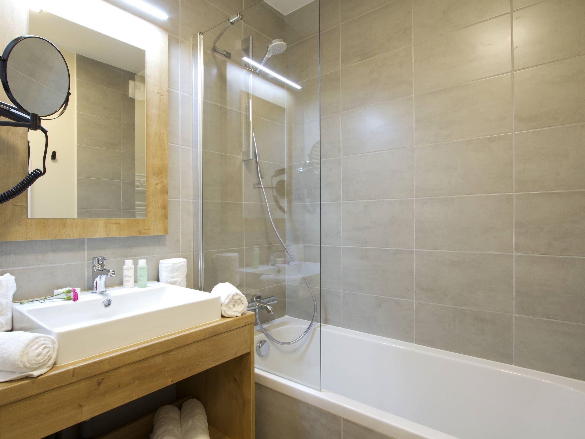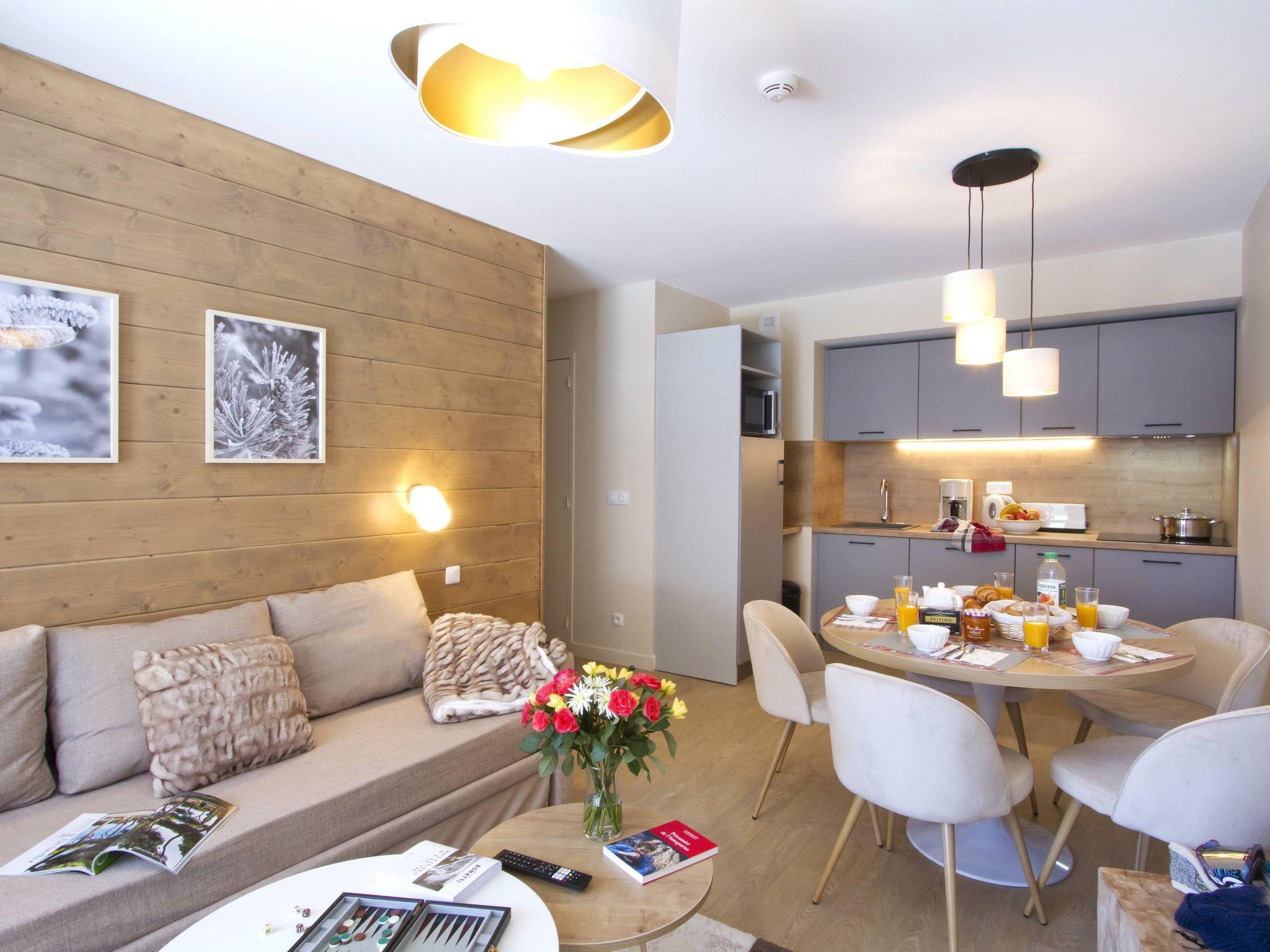 "Résidence Odalys Collection L'Eclose", 3-room apartment 45 m2. Comfortable furnishings: living/sleeping room with 2 sleeping facilities and TV (flat screen). 2 rooms, each room with 2 sleeping facilities. Kitchenette (dishwasher, 2 ceramic glass hob hotplates, toaster, kettle, electric coffee machine, combination microwave). Bathroom, shower/WC. Heating. Balcony. Facilities: hair dryer. Internet (WiFi, free). Parking (extra). Maximum 1 pet/ dog allowed.