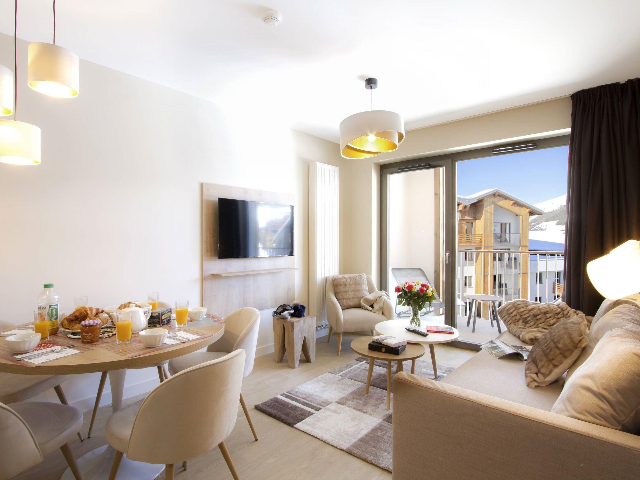 Comfortable residence "Résidence Prestige Odalys l'Éclose". In the resort Alpe d'Huez, 59 km from the centre of Grenoble, directly by the skiing area. For shared use: indoor pool heated (19 x 10 m, seasonal availability: 01.Jun. - 31.Aug.). In the complex: reception, lounge, WiFi, sauna, fitness room, massage (extra). Steam room, hot tub, billiard table, lift, storage room for skis, washing machine (extra), ski boot dryer. Communal covered parking (extra). Skisport facilities 100 m. Nearby attractions: Parc National des Ecrins, Le Pic Blanc, site archéologique Brandes. Well-known ski regions can easily be reached: Alpe d'Huez, La Sarenne: la piste noire la plus long. Please note: the photograph shows a typical example. The holiday properties may differ in living space, floorplan, equipment and furnishing.