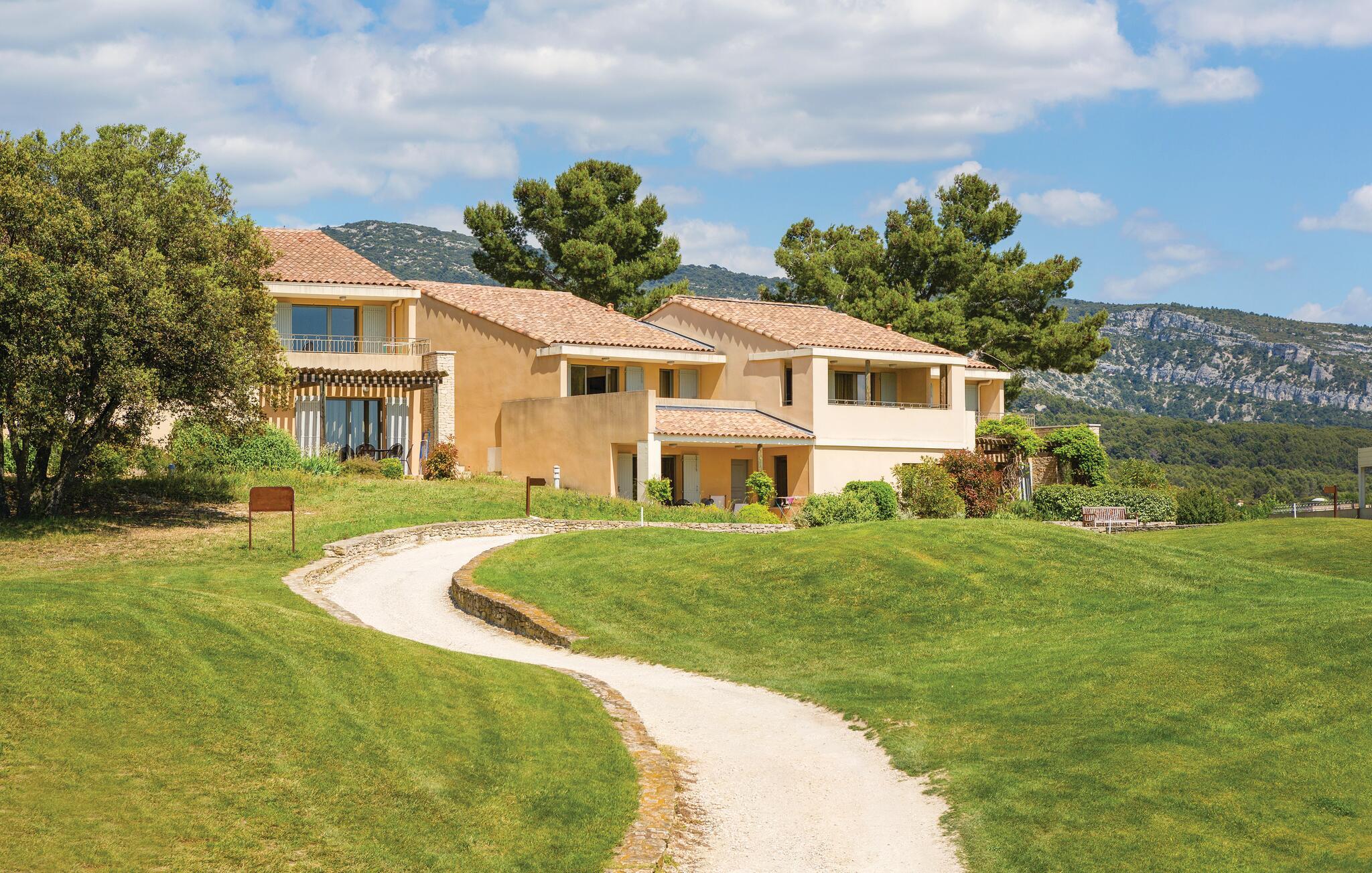 Lejligheden er stilfuldt indrettet, og med dens beliggenhed i en feriepark i Provence Country Club er den den ideelle bolig for golfentusiaster. Indretningen er både komfortabel og moderne, og i det veludstyrede køkken finder I alt, I behøver til at kunne kræse om maden, som I kan nyde på terrassen, når vejret tillader det. Opholdsrummet prydes af de store gulv-til-loft-vinduer, der lader en masse lys sive ind udefra og samtidig giver en herlig udsigt. Lad blot dagen gå på hæld med en hyggelig film i sofaen eller på terrassen på de lune sommeraftener.