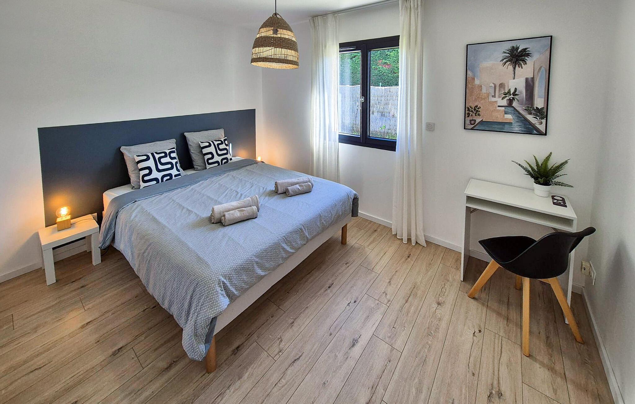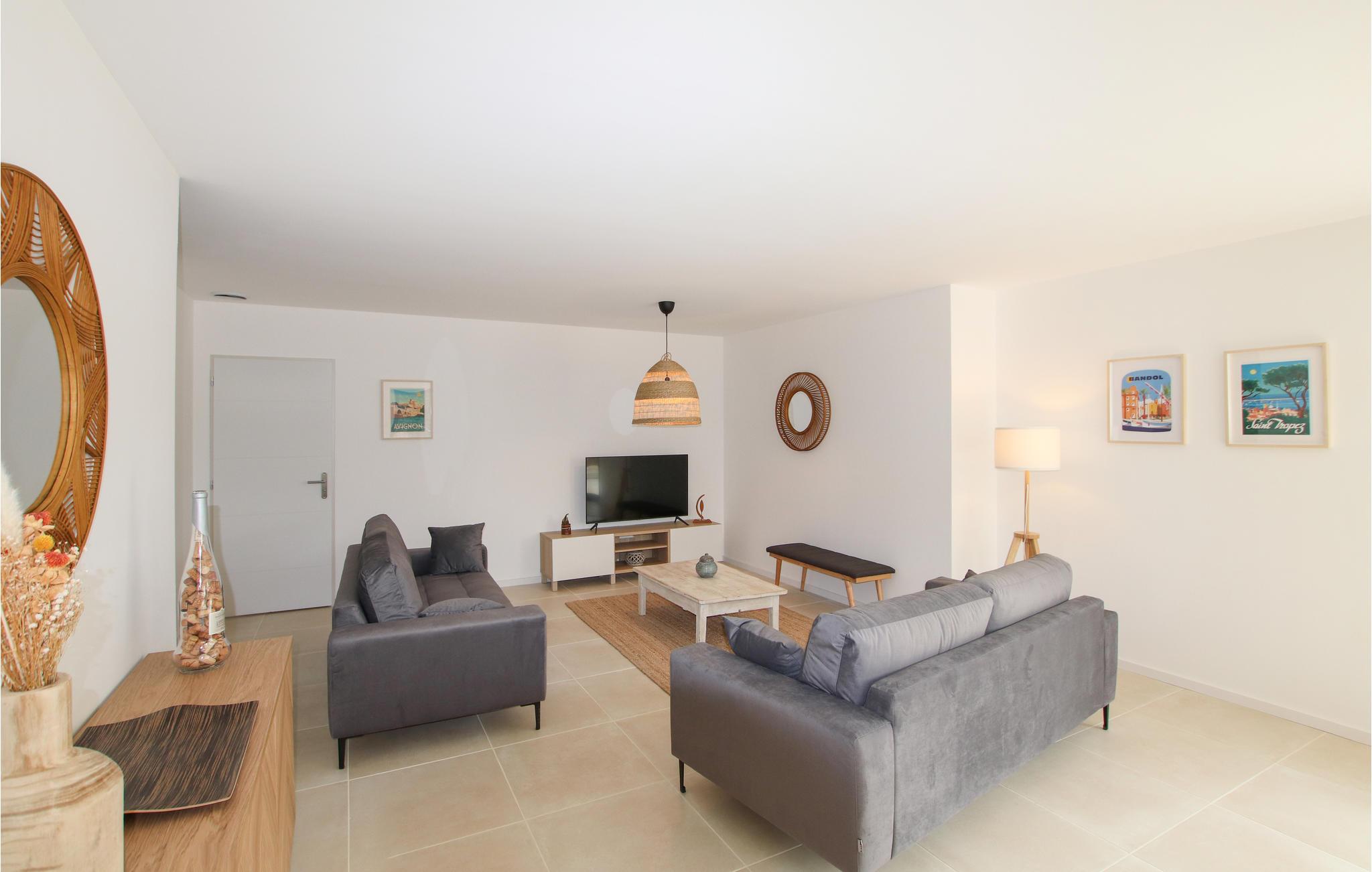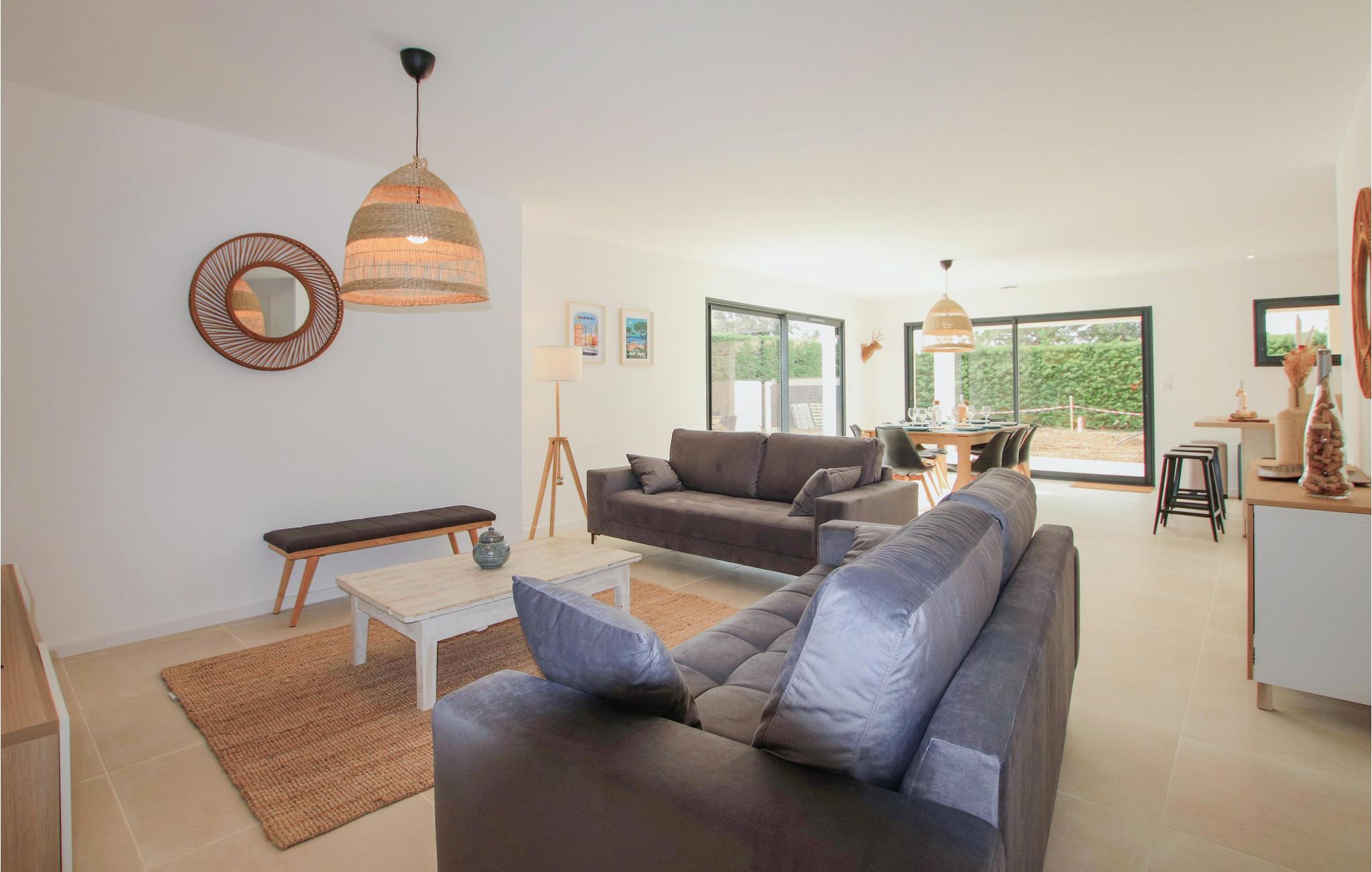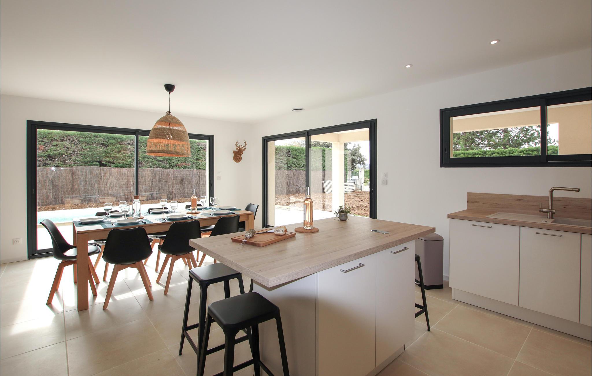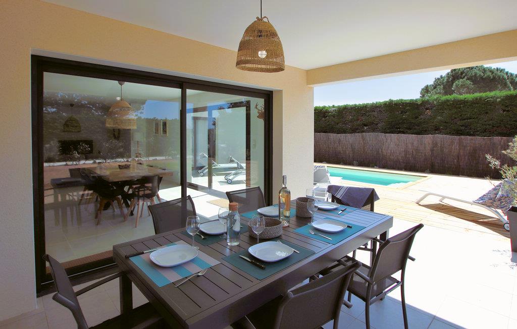 På den sydlige side af feriehuset er der en stor overdækket terrasse, som fører til den hyggelige stue og et stort køkken med spiseplads. Den grønne, indhegnede have har en pool, som I har helt for jer selv. Tag en kop kaffe med ud på den solrige terrasse og planlæg turene til de næste par dage. Efter en lang dag på farten kan I sætte jer med lækre grillretter og afslutte aftenen med at slappe af i sofaen, mens I nyder et glas vin og en god film.