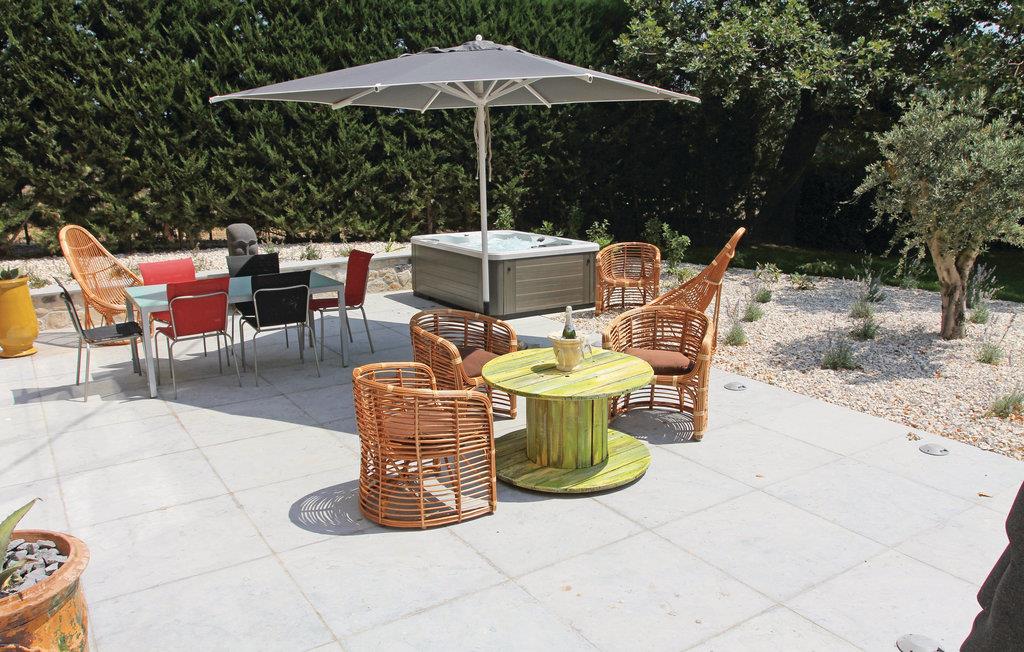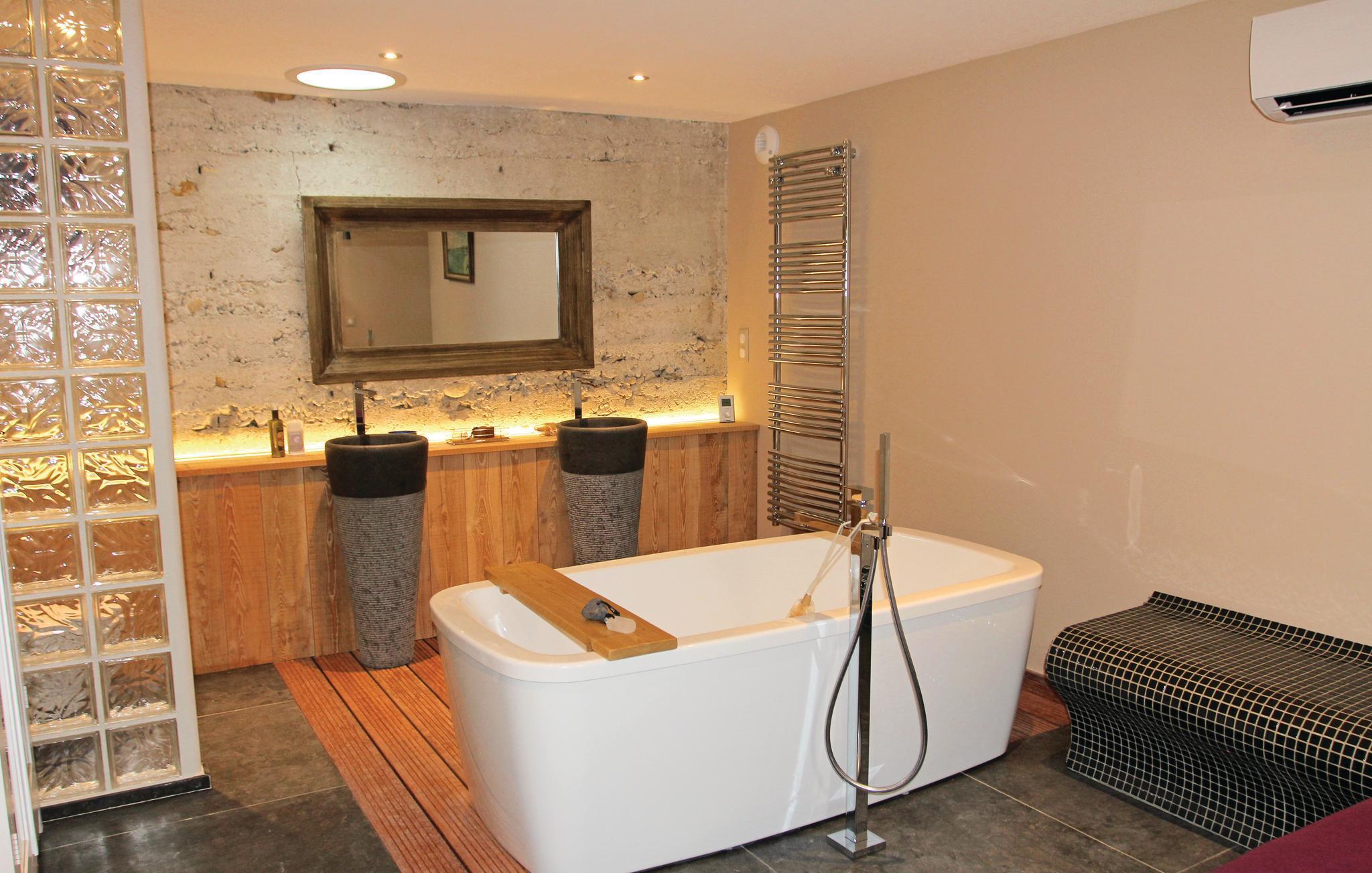 Den rummelige have inviterer til ren nydelse med sin solterrasse, den forfriskende swimmingpool og det afslappende udendørs spabad. Et charmerende springvand pryder gårdspladsen og skaber en idyllisk stemning.