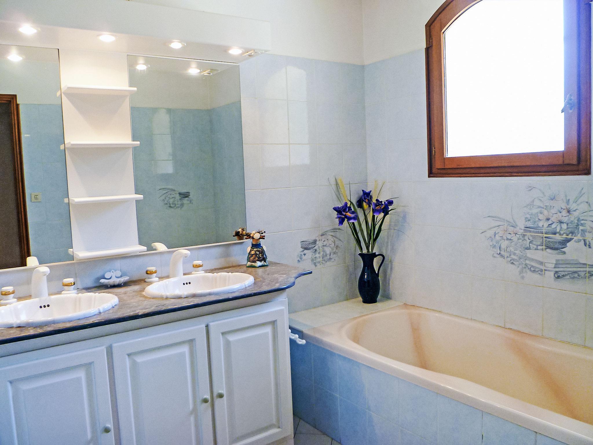 4-room villa 150 m2. Comfortable and beautiful furnishings: living/dining room with dining table and TV (flat screen). Exit to the terrace, to the swimming pool. 2 rooms, each room with 1 french bed (1 x 140 cm, length 190 cm), air conditioning. 1 room with 1 french bed (160 cm, length 200 cm), air conditioning. Exit to the terrace. Open kitchen (oven, dishwasher, 3 ceramic glass hob hotplates, toaster, kettle, microwave, freezer, electric coffee machine, Capsules for coffee machine (NESPRESSO) extra). Bathroom, sep. WC, double hand-basin. Air-conditioning. Large terrace 80 m2. Terrace furniture, barbecue, deck chairs (6). Facilities: washing machine, iron, baby cot for up to 2 year olds. Internet (WiFi, free). Parking (4 cars). Please note: TV only FR. Smoke alarm.