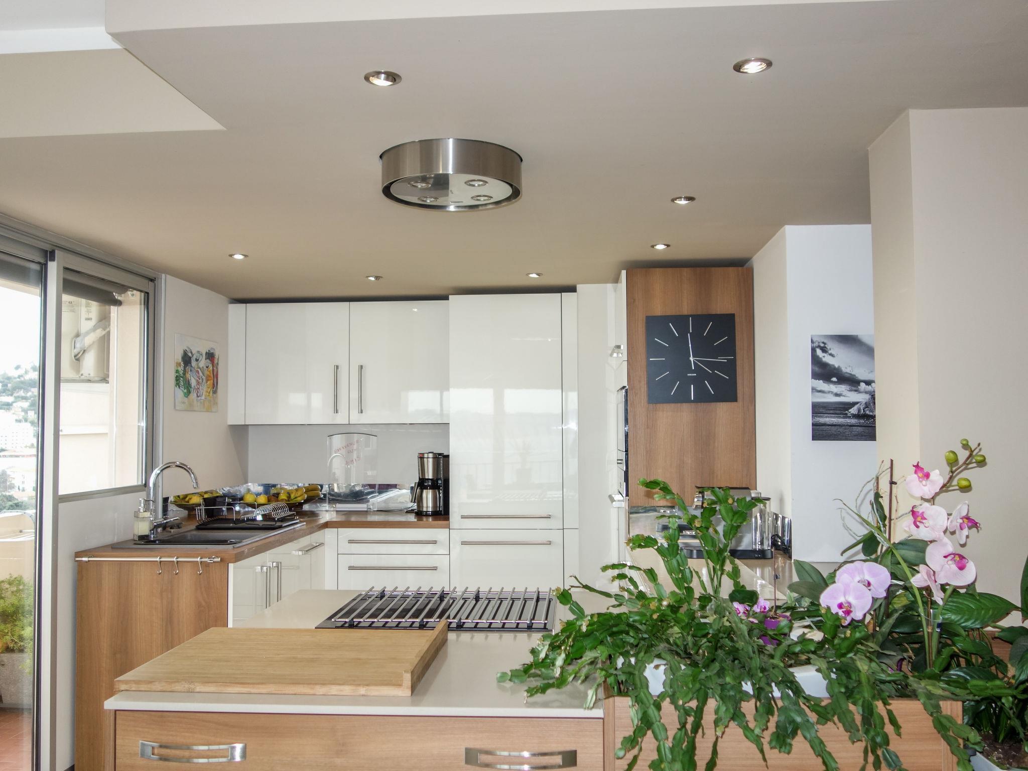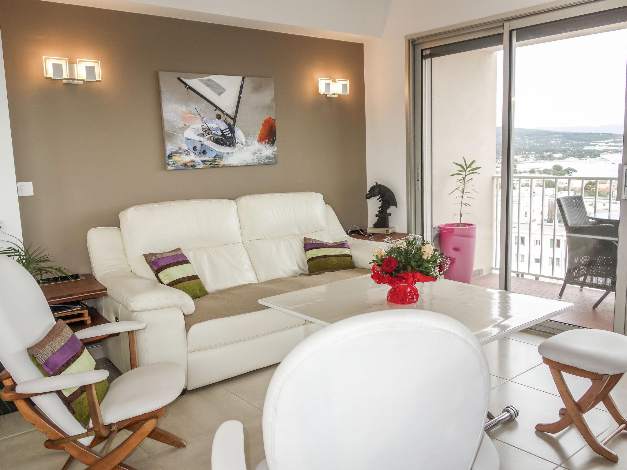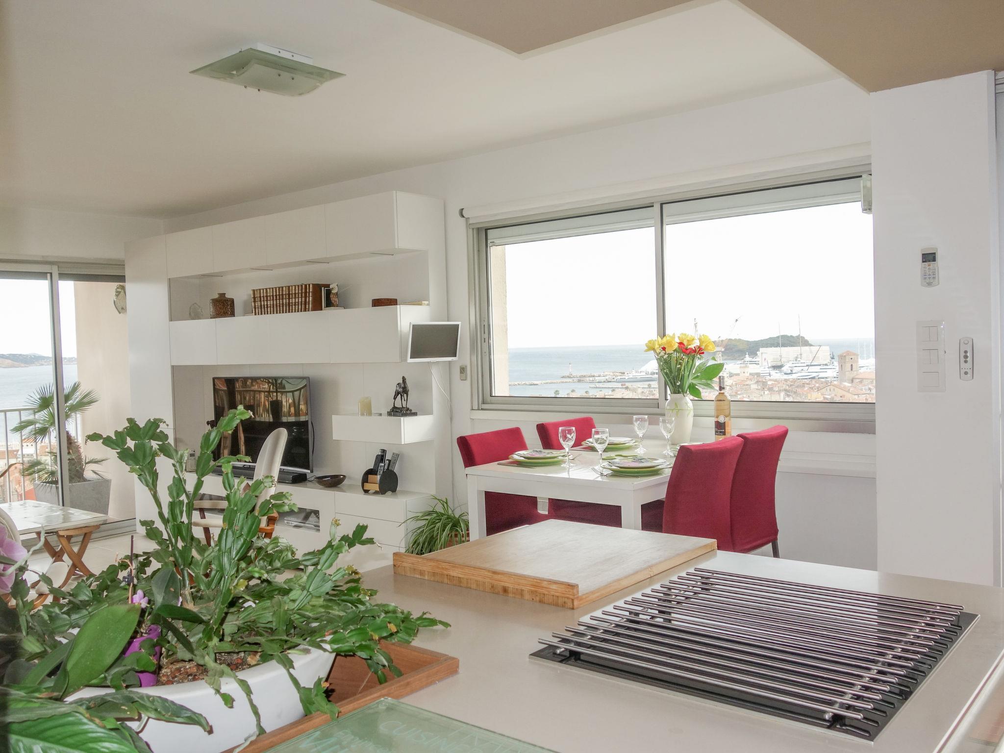 3-room apartment 80 m2 on 9th floor. Beautiful and modern furnishings: living/dining room with TV (flat screen), air conditioning. Exit to the terrace. 1 room with 1 double bed (2 x 80 cm, length 200 cm), TV. 1 room with 2 beds (90 cm, length 200 cm). Open kitchen (oven, dishwasher, 4 induction hot plates, toaster, kettle, microwave, freezer, electric coffee machine, Capsules for coffee machine (Nespresso) extra). Shower, sep. WC. Forced-air heating. Terrace 7 m2, roofed, east facing position. Terrace furniture. Marvellous panoramic view of the sea. Facilities: washing machine, dryer, iron. Internet (WiFi, free). Parking space n 7. Please note: TV only FR. Smoke alarm. 13028 000644 FA