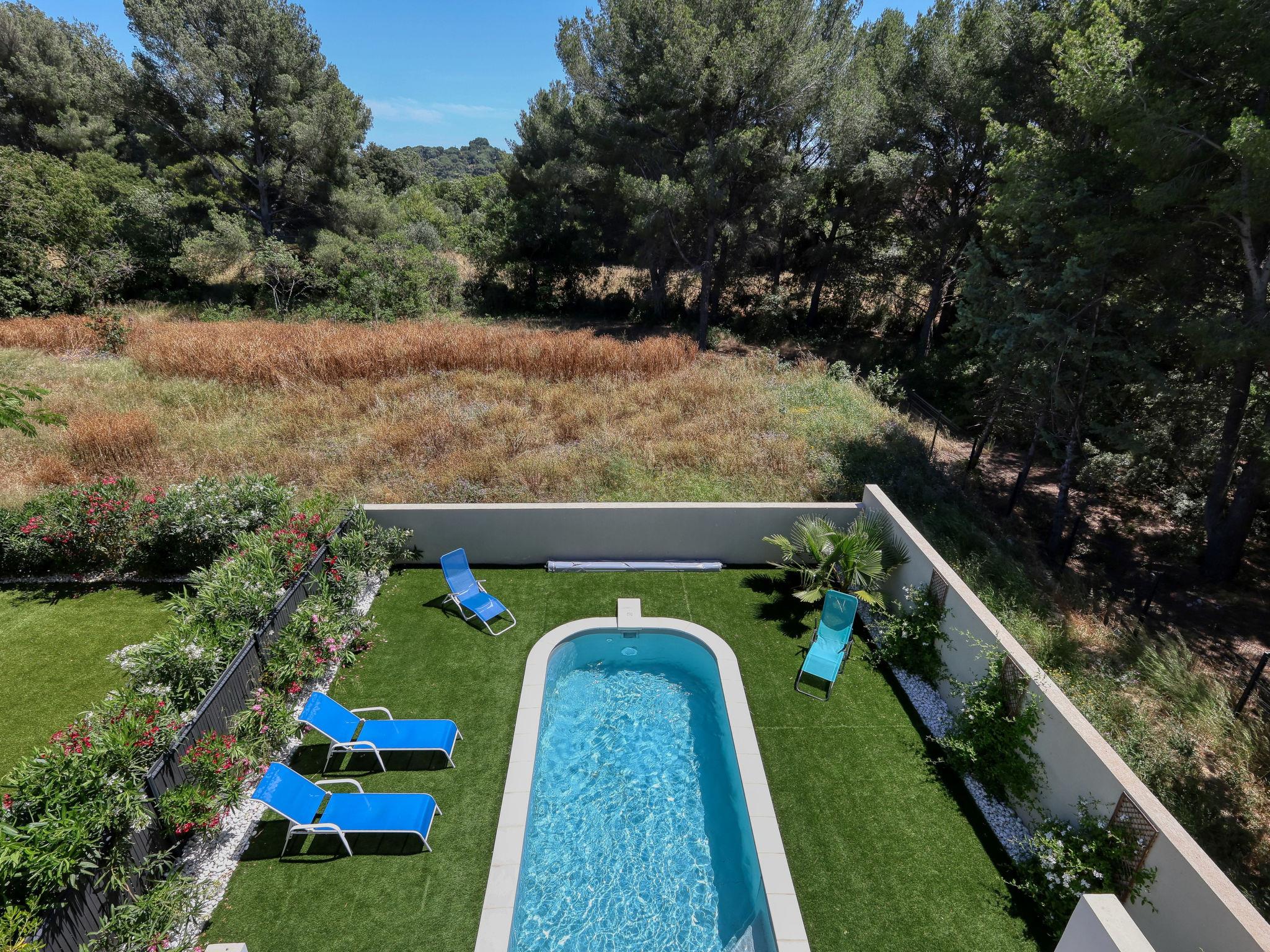 La Ciotat: Modern, beautiful, comfortable house "Villas Indigo", 2 storeys, terraced, built in 2022. 4.2 km from the centre of de la Ciotat, in a quiet position in the residential district, 2.2 km from the sea. Private: property (fenced), well-kept garden 150 m2, swimming pool angular (3 x 6 m, depth 120 - 160 cm, seasonal availability: 01.Jun. - 01.Oct.) with internal staircase and alarm system. Terrace (20 m2), garden furniture, parking (for 2 cars). Supermarket 1.2 km, restaurant 2.3 km, bus stop "Maurelle Nord" 600 m, railway station "La Ciotat - Ceyreste" 2.2 km, sandy beach "La Ciotat" 2.2 km, park "Du Domaine de la Tour" 2 km. Sports harbour 4.3 km, golf course (18 hole) 14 km, tennis 2.1 km. Nearby attractions: Aqualand à St Cyr sur mer 9 km, Zoa à Bandol 26 km, Bowling à Bandol 26 km, OK Corral à Cuges les Pins 18 km. Hiking paths: Sainte Baume, Sainte Victoire, Calanques Port-Cros, Porquerolles, Ile verte, Embiez, Figuerolles, Cassis. The owner does not accept any youth groups. The keys‘ handover takes place by the agency INTERHOME in St Cyr sur mer, 11 km.