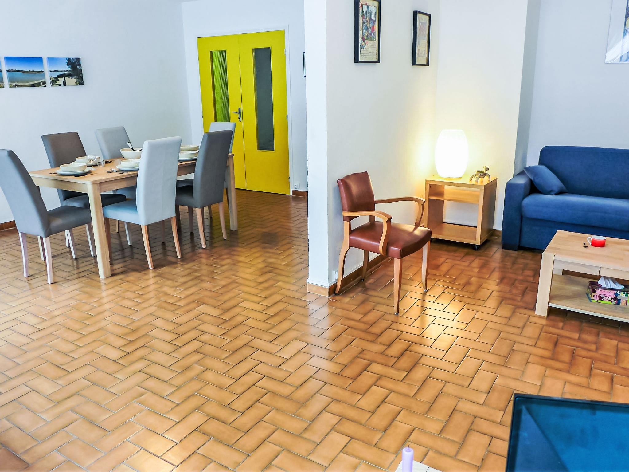 3-room apartment 76 m2 on 2nd floor. Comfortable furnishings: living/dining room with 1 double sofabed (140 cm, length 190 cm), TV (flat screen). Exit to the terrace. 1 room with 1 french bed (160 cm, length 190 cm). 1 room with 2 beds (90 cm, length 190 cm). Kitchen (oven, dishwasher, 4 induction hot plates, microwave, freezer). Shower, sep. WC. Heating. 2 balconies, north-west facing position, 2 terraces 6 m2, south-east facing position. Terrace furniture. Facilities: washing machine. Internet (WiFi, free). Please note: apartment street side. No parking. Maximum 1 pet/ dog allowed. Smoke alarm.