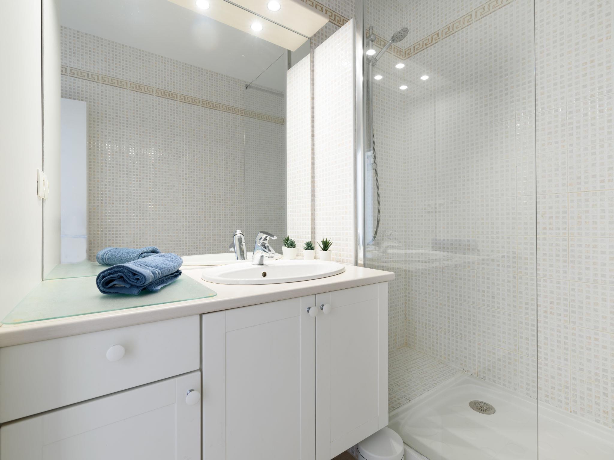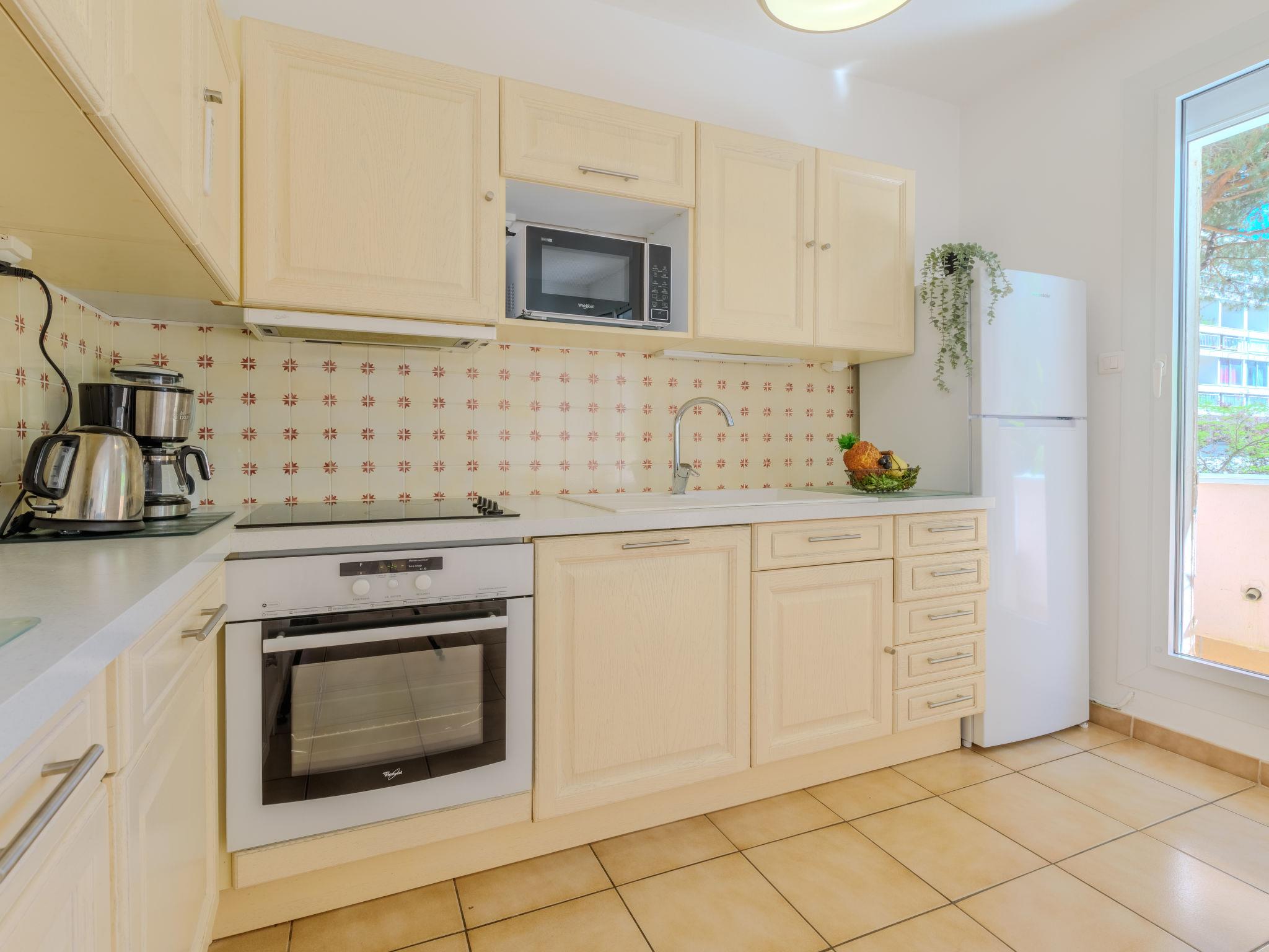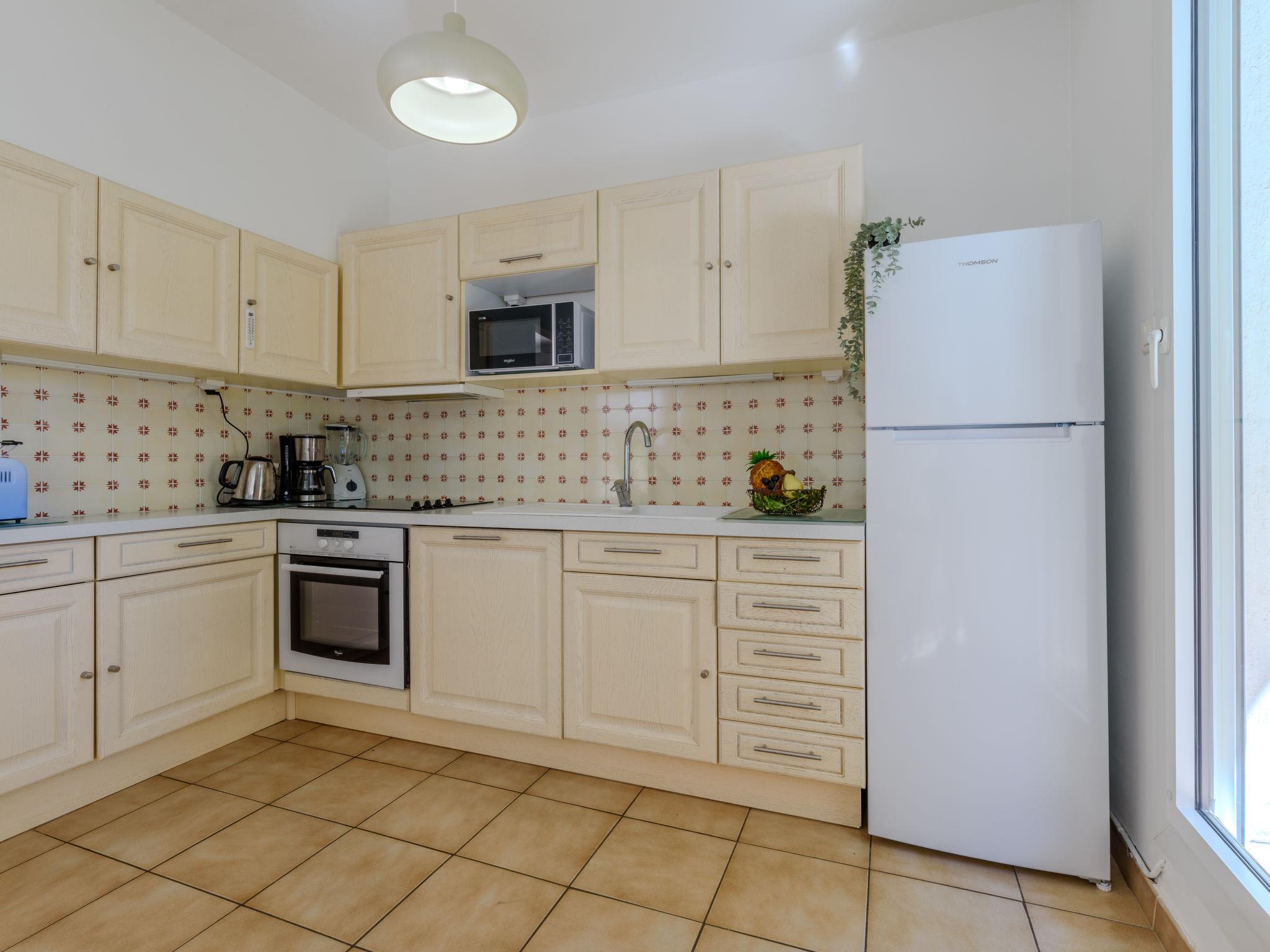 3-room apartment 50 m2 on 1st floor. Living/dining room with TV (flat screen), air conditioning, fan, forced-air heating and electric shutters. 1 room with 1 french bed (140 cm, length 200 cm). Exit to the terrace. 1 room with 1 pull-out bed (2 pers. 2 x 80 cm, length 200 cm). Exit to the terrace. Kitchenette (oven, dishwasher, 4 ceramic glass hob hotplates, toaster, kettle, microwave, freezer, electric coffee machine). Bathroom. Boiler (150 litres). Large terrace 40 m2. Terrace furniture. Facilities: washing machine. Internet (WiFi, free). Please note: apartment courtyard side. Non-smokers only, no parking. Smoke alarm, no lift.