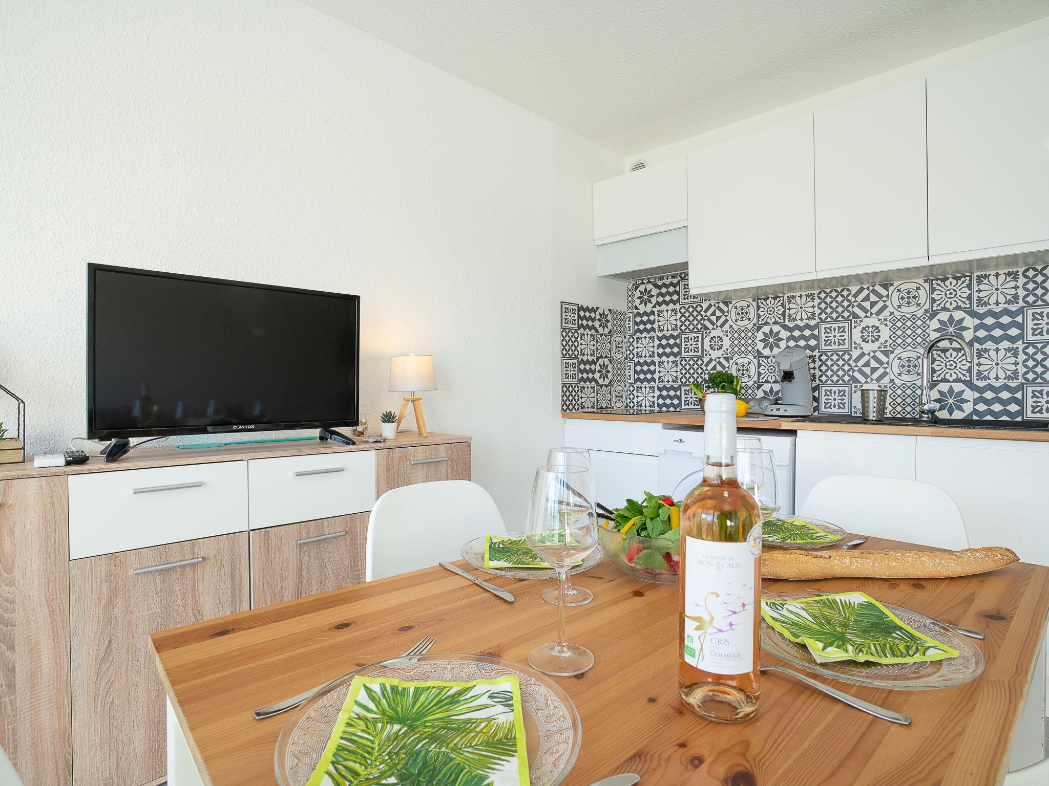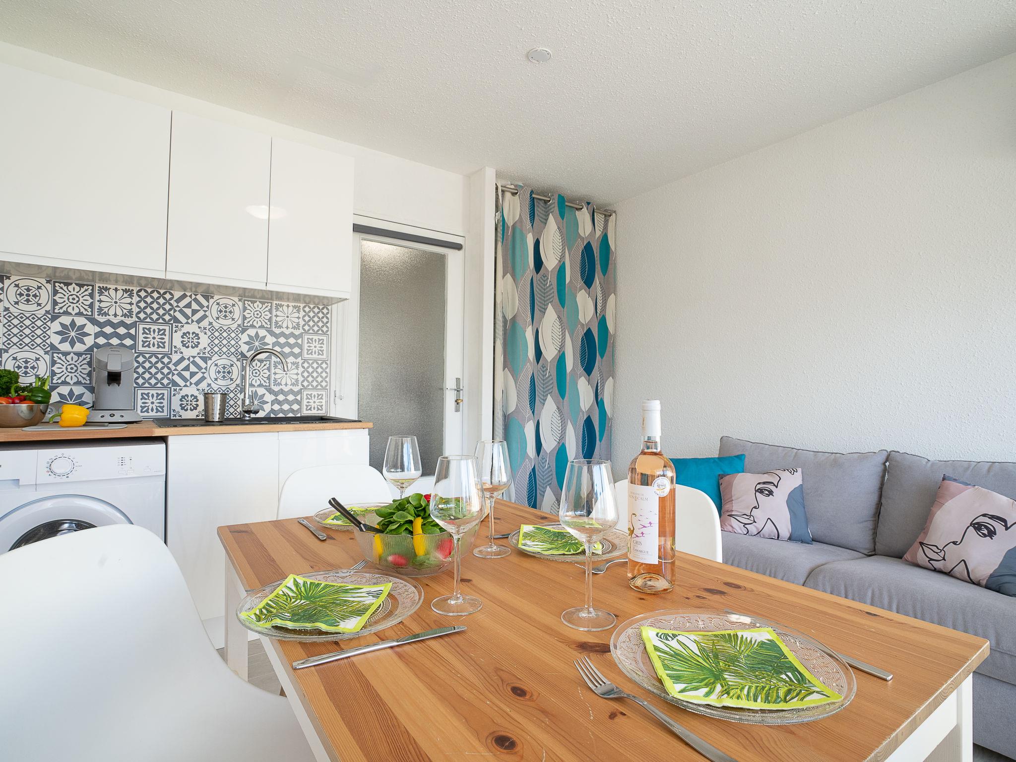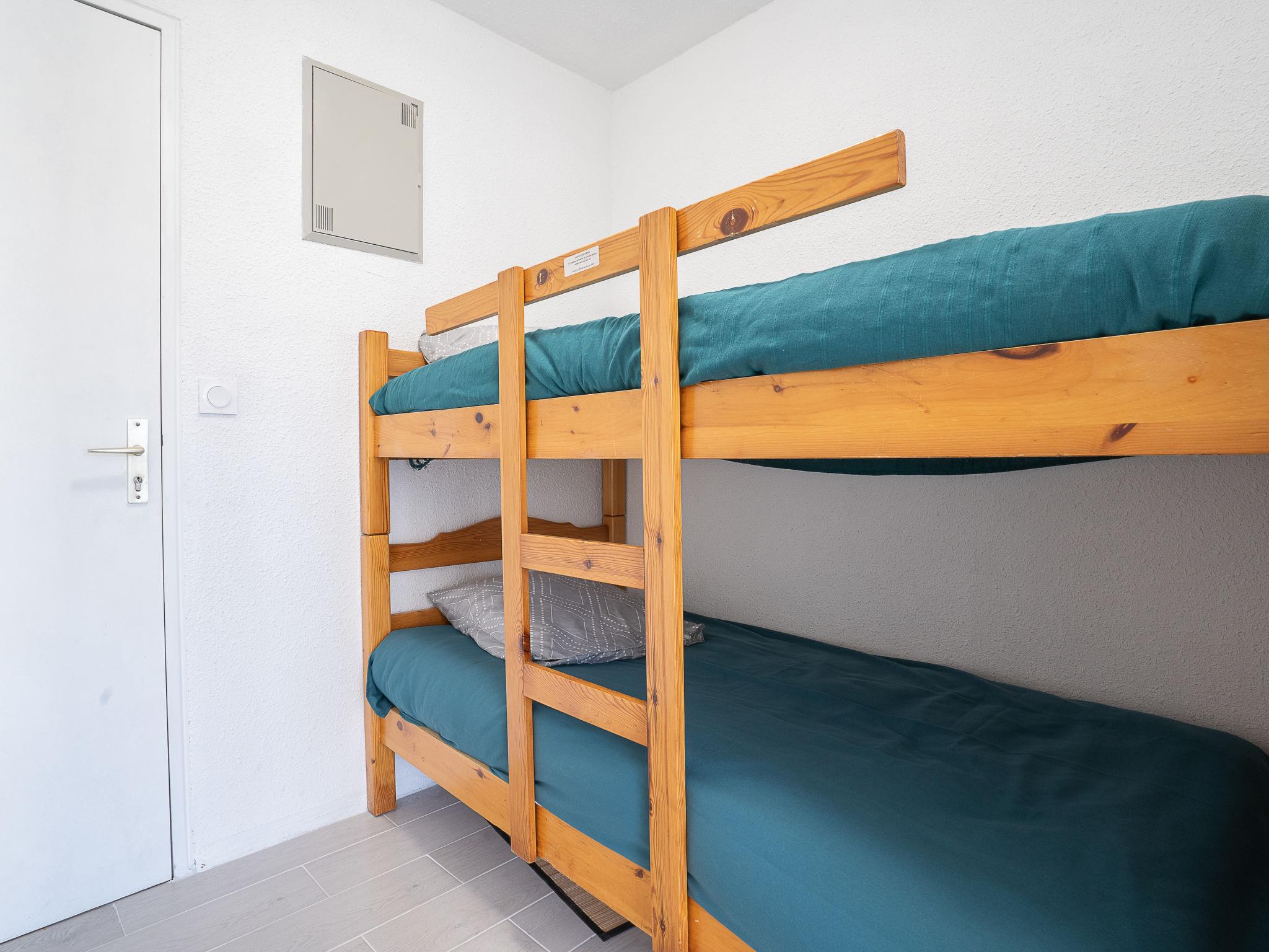 1-room studio 23 m2 on 1st floor. Living/dining room with 1 double sofabed (140 cm, length 190 cm), TV (flat screen), air conditioning. Entrance hall with 1 x 2 bunk beds (90 cm, length 190 cm). Kitchenette (2 ceramic glass hob hotplates, toaster, kettle, electric coffee machine, combination microwave). Bathroom, sep. WC. Electric heating. Terrace 8 m2, roofed, south facing position. Terrace furniture. View of the swimming pool. Facilities: washing machine. Internet (WiFi, free). Garage space n 178, height 185 cm, width 225 cm. Please note: parking space for small car only. Smoke alarm.