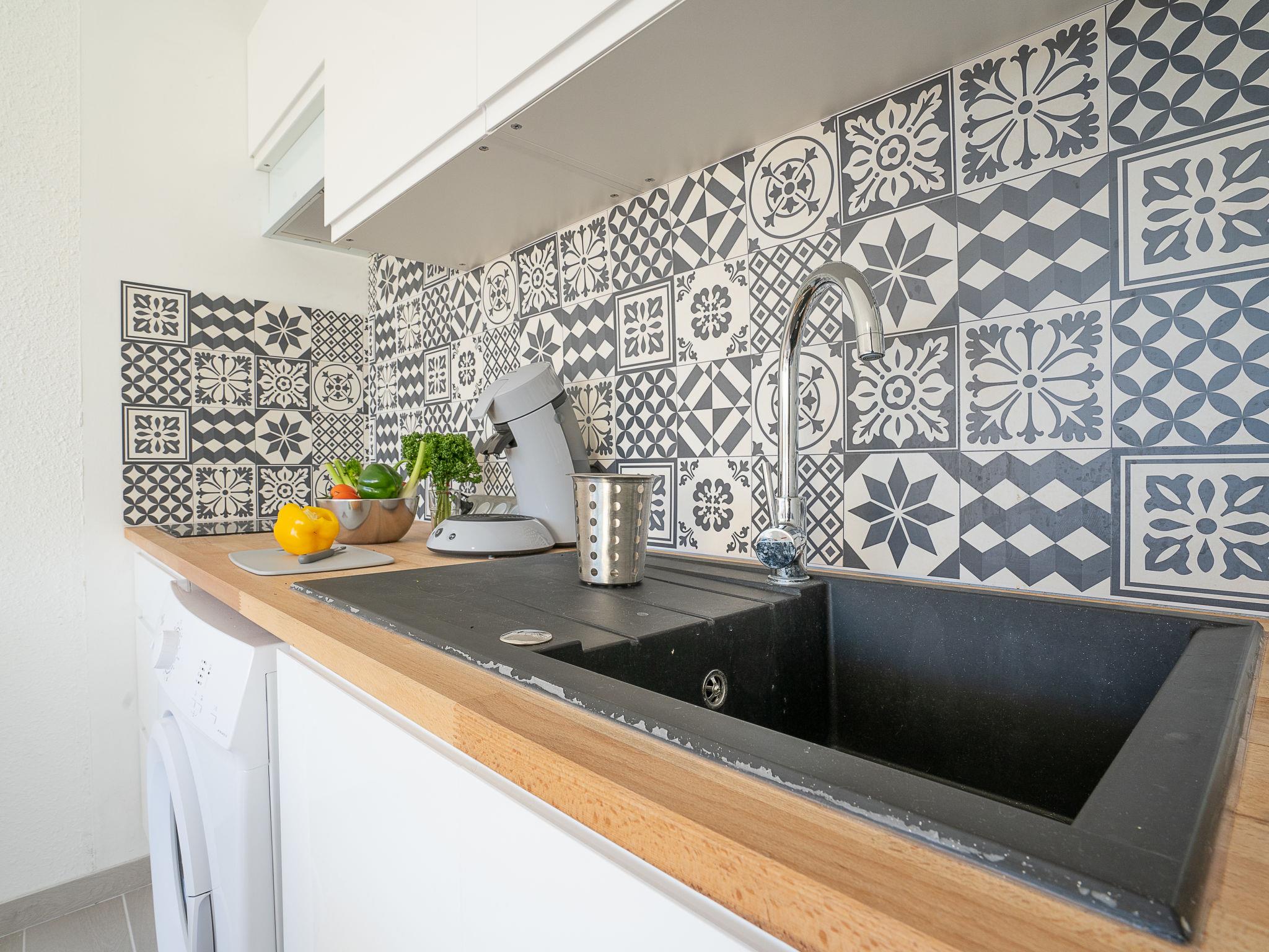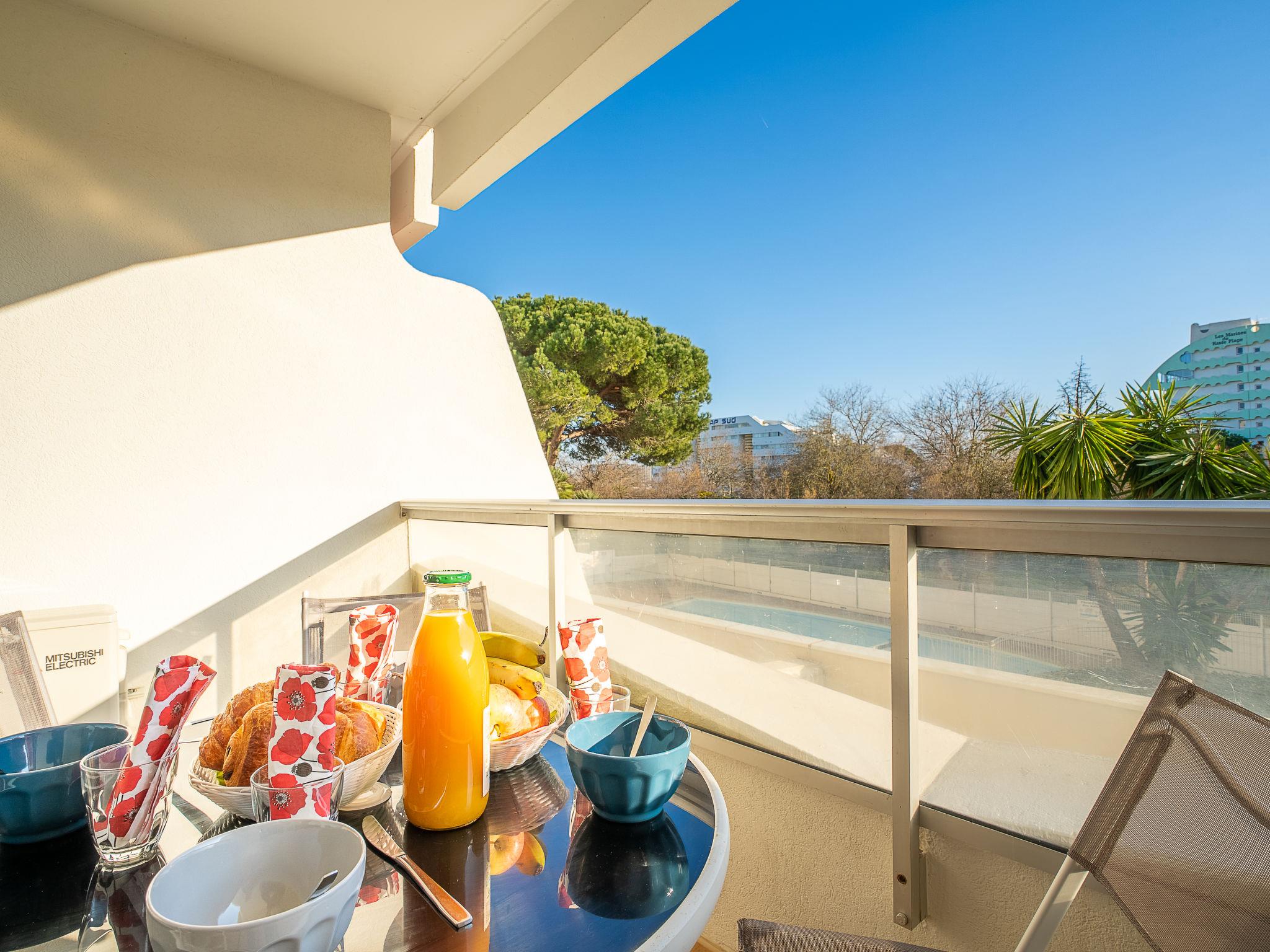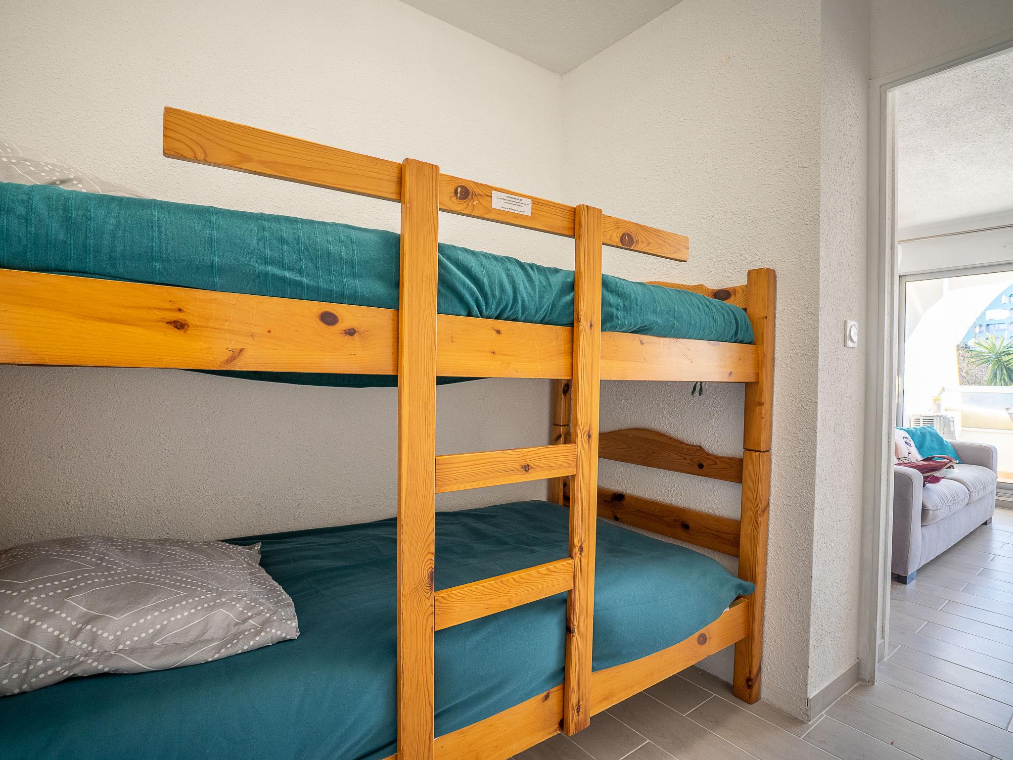 1-room studio 23 m2 on 1st floor. Living/dining room with 1 double sofabed (140 cm, length 190 cm), TV (flat screen), air conditioning. Entrance hall with 1 x 2 bunk beds (90 cm, length 190 cm). Kitchenette (2 ceramic glass hob hotplates, toaster, kettle, electric coffee machine, combination microwave). Bathroom, sep. WC. Electric heating. Terrace 8 m2, roofed, south facing position. Terrace furniture. View of the swimming pool. Facilities: washing machine. Internet (WiFi, free). Garage space n 178, height 185 cm, width 225 cm. Please note: parking space for small car only. Smoke alarm.