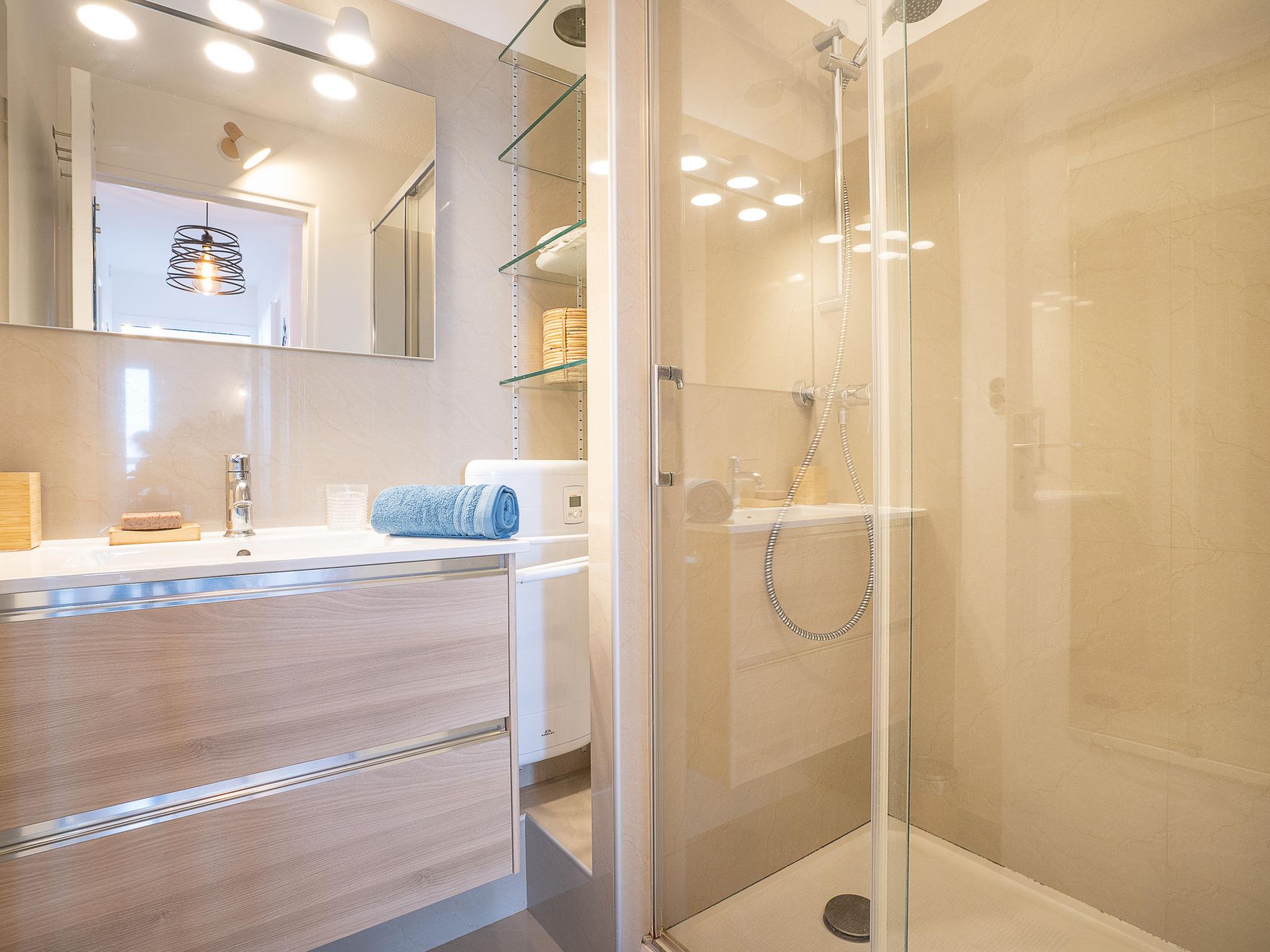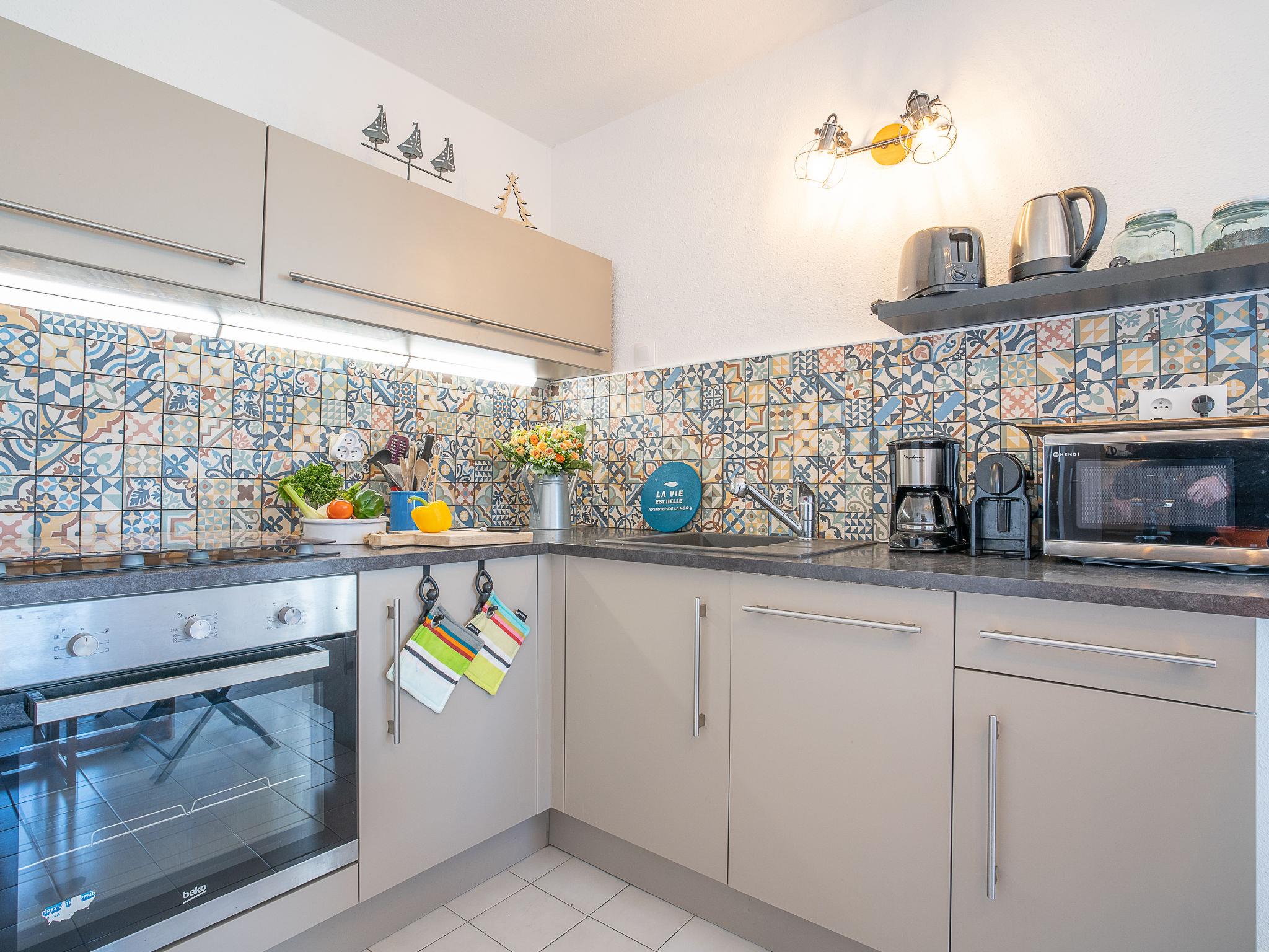 3-room apartment 40 m2 on 5th floor. Comfortable and modern furnishings: living/dining room with TV (flat screen). 1 room with 1 french bed (140 cm, length 190 cm). 1 small room with 1 x 2 bunk beds (90 cm, length 190 cm). Open kitchen (oven, dishwasher, 3 ceramic glass hob hotplates, toaster, kettle, microwave, freezer, electric coffee machine). Shower, sep. WC. Heating. Terrace 9 m2, south-west facing position. Terrace furniture, covered balcony. Distant view of the sea and the countryside. Facilities: washing machine. Internet (WiFi, extra). Parking. Please note: smoke alarm. 4684892878421
