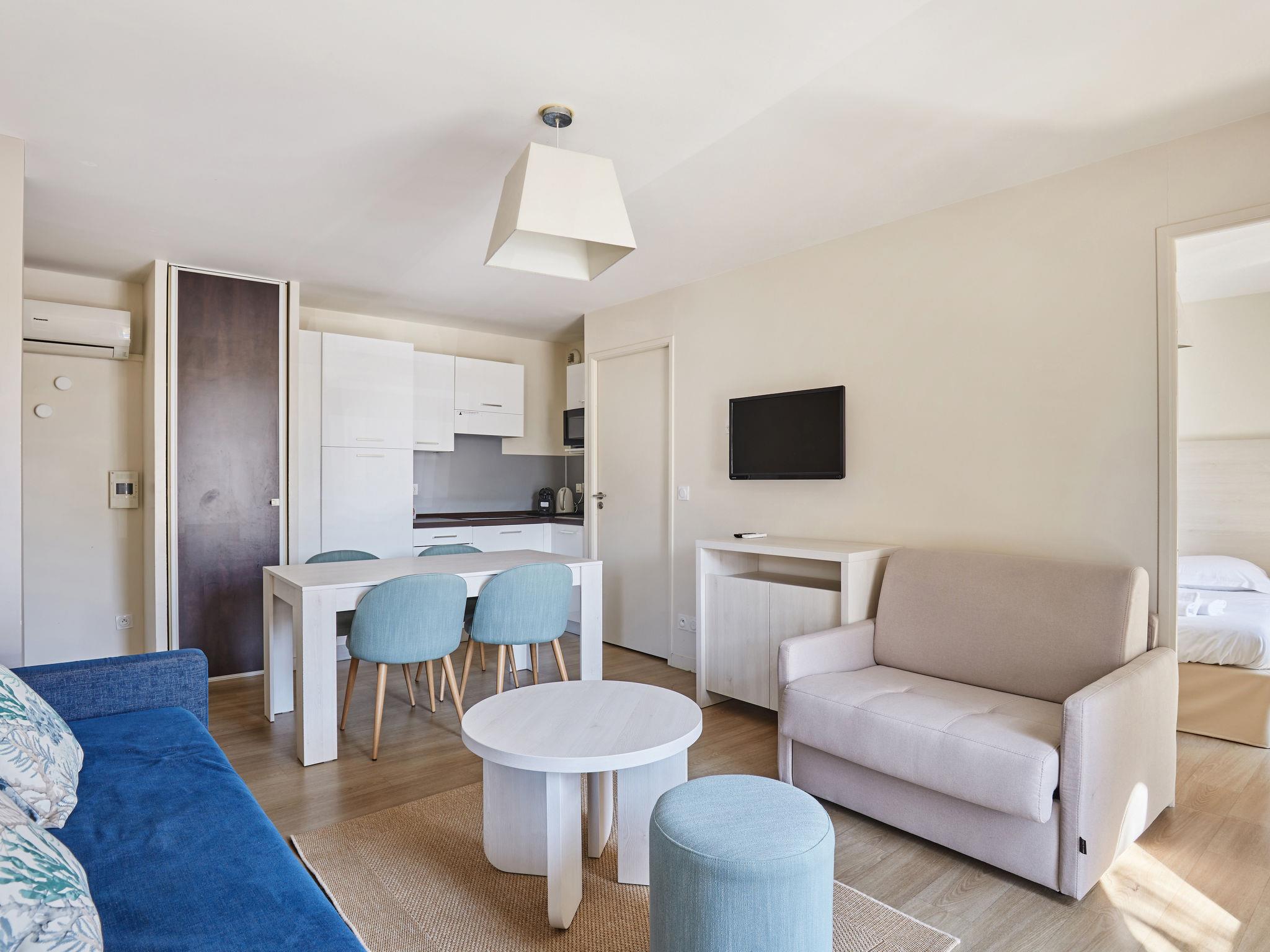 "Odalys Référence Les Dunes du Soleil", 2-room apartment 30 m2, on the ground floor. Comfortable furnishings: living/sleeping room with 1 double sofabed, dining table, TV and air conditioning. Exit to the balcony, to the terrace. 1 room with 1 x 2 bunk beds. Small, open kitchen (dishwasher, 4 ceramic glass hob hotplates, kettle, microwave, electric coffee machine). Shower/WC. Electric heating. Patio 4 m2. Terrace furniture. Facilities: children's high chair, baby cot, hair dryer. Internet (WiFi, free). Please note: non-smokers only. Maximum 1 pet/ dog allowed. Smoke alarm, fire extinguisher.