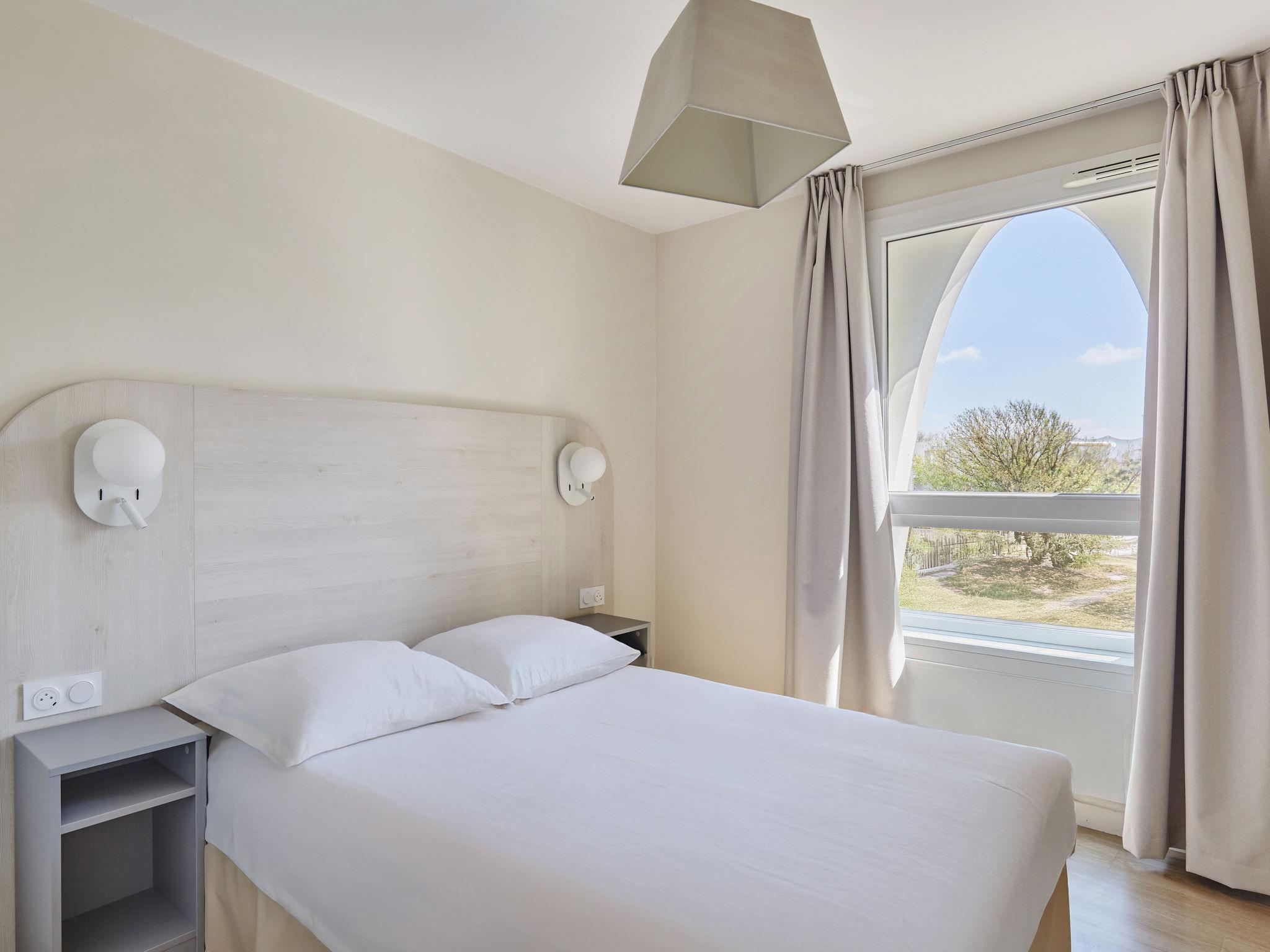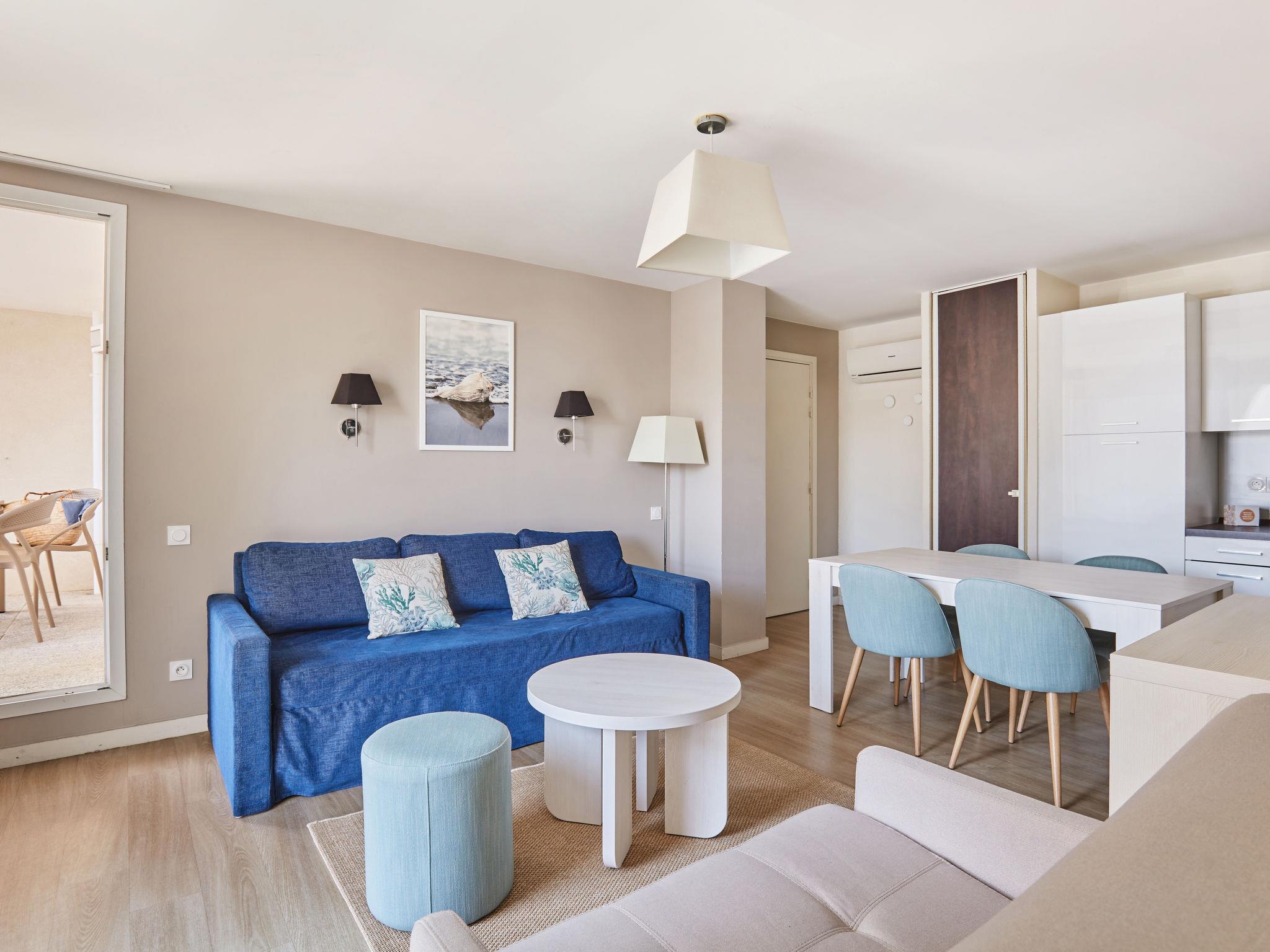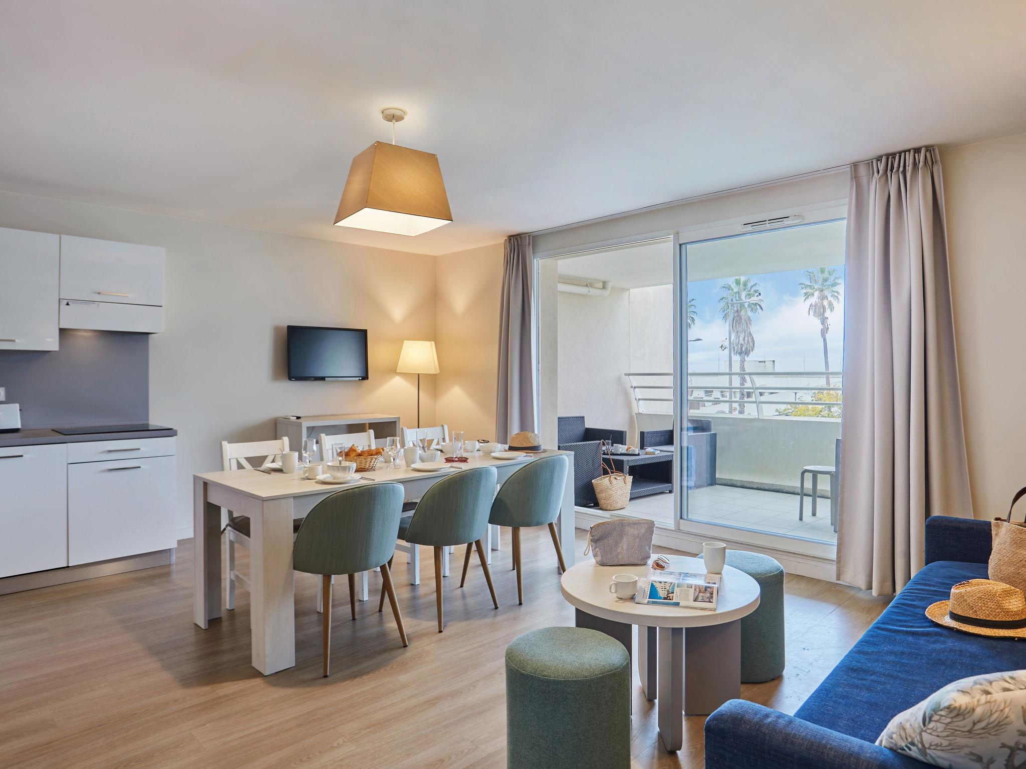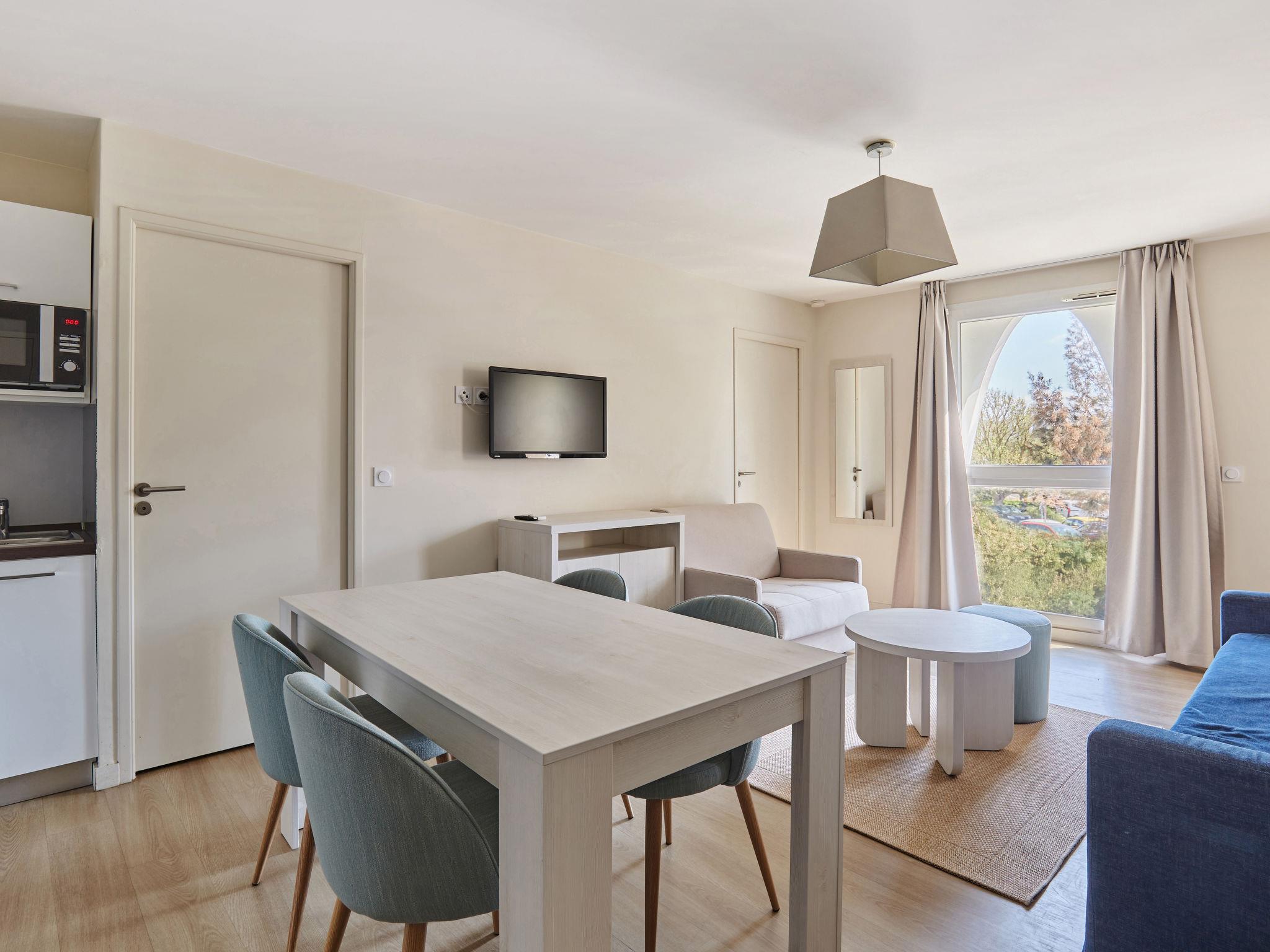 "Odalys Référence Les Dunes du Soleil", 2-room apartment 30 m2 on 3rd floor. Comfortable furnishings: living/sleeping room with 1 sofabed and 1 pull-out bed (1 pers.), dining table, TV and air conditioning. Exit to the balcony. 1 small room with 1 x 2 bunk beds. Small, open kitchen (dishwasher, 4 ceramic glass hob hotplates, kettle, microwave, electric coffee machine). Shower/WC. Electric heating. Balcony. Balcony furniture. View of the sea. Facilities: children's high chair, baby cot, hair dryer. Internet (WiFi, free). Please note: non-smokers only. Maximum 1 pet/ dog allowed. Smoke alarm, fire extinguisher.