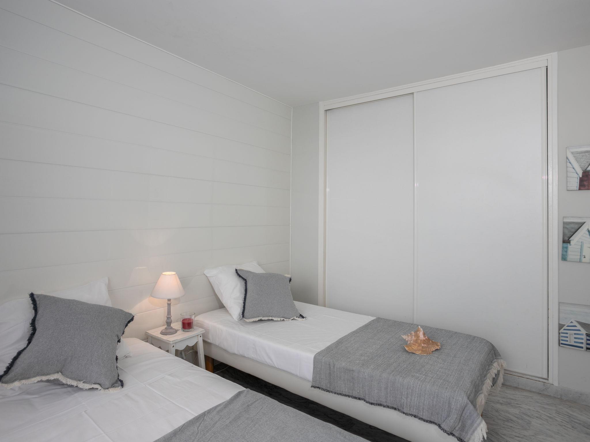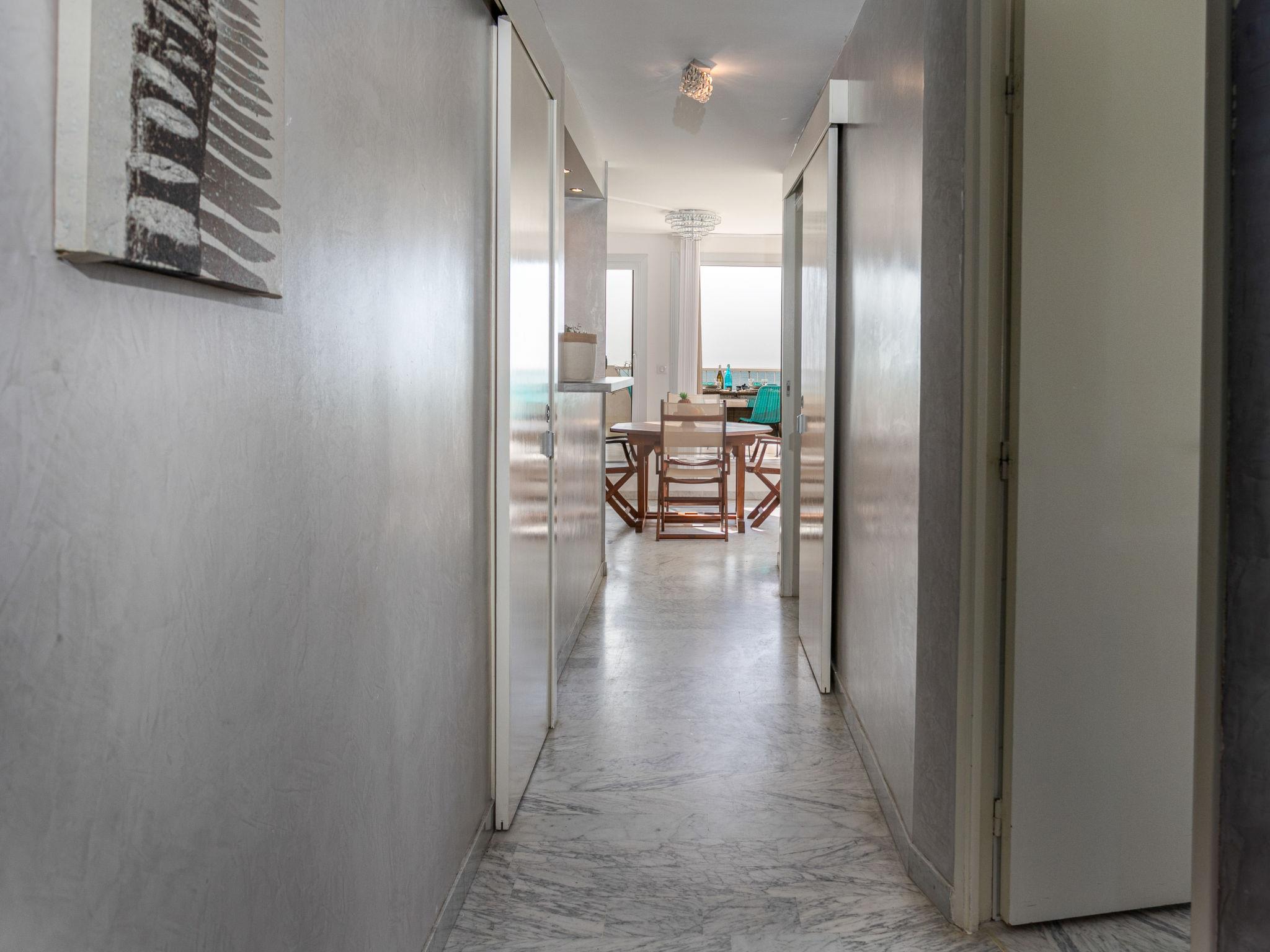 3-room apartment 63 m2 on 2nd floor, south facing position. Renovated, comfortable and beautiful furnishings: living/dining room with 1 double sofabed (140 cm, length 190 cm), TV (flat screen). Exit to the terrace. 1 room with 1 french bed (140 cm, length 190 cm), TV (flat screen). 1 room with 2 beds (90 cm, length 190 cm). Open kitchen (dishwasher, 3 ceramic glass hob hotplates, toaster, kettle, freezer, electric coffee machine, combination microwave) with hatch. Bathroom, shower, sep. WC. Air-conditioning. 3 balconies 10 m2, south-west facing position, large terrace 40 m2, south facing position. Terrace furniture, deck chairs. Marvellous view of the sea. Facilities: washing machine. Internet (WiFi, extra). Garage space n voiture standard (1 car), height 180 cm, width 220 cm. Please note: maximum 1 pet/ dog allowed. Smoke alarm.