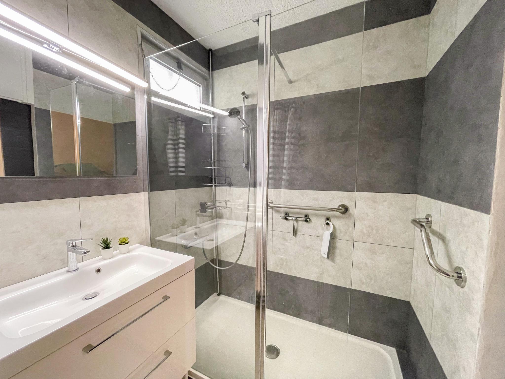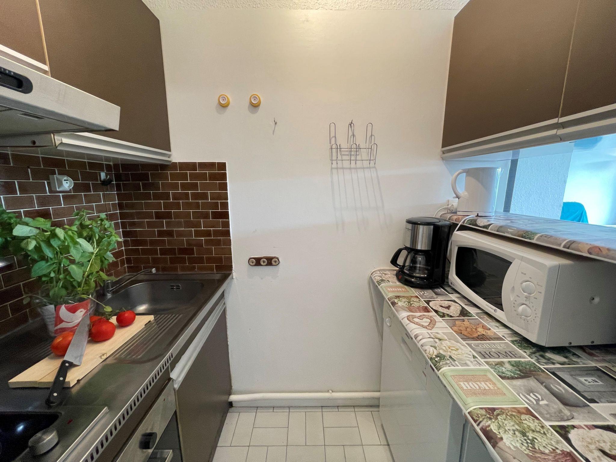1-room studio 37 m2, on the ground floor, south facing position. Partly renovated, comfortable furnishings: living/dining room with 1 double sofabed (140 cm, length 190 cm), TV (flat screen), air conditioning and forced-air heating. Sleeping alcove with 1 bed (90 cm, length 190 cm), 1 x 1 bunk beds (90 cm, length 190 cm). Kitchenette (oven, dishwasher, 2 ceramic glass hob hotplates, toaster, kettle, microwave, electric coffee machine). Shower/WC. Terrace 8 m2, south facing position, patio 10 m2, south facing position. View of the garden. Facilities: washing machine. Internet (WiFi, free). Garage, height 180 cm, width 230 cm. Please note: smoke alarm. Instead of an enclosed bedroom, some sleeping areas are located in an open-plan area (gallery, alcove, etc.).