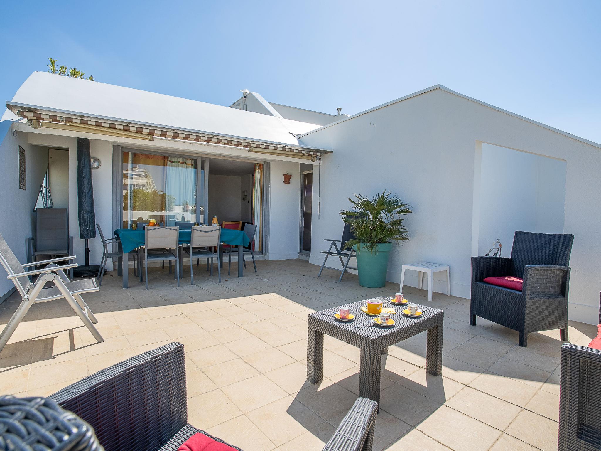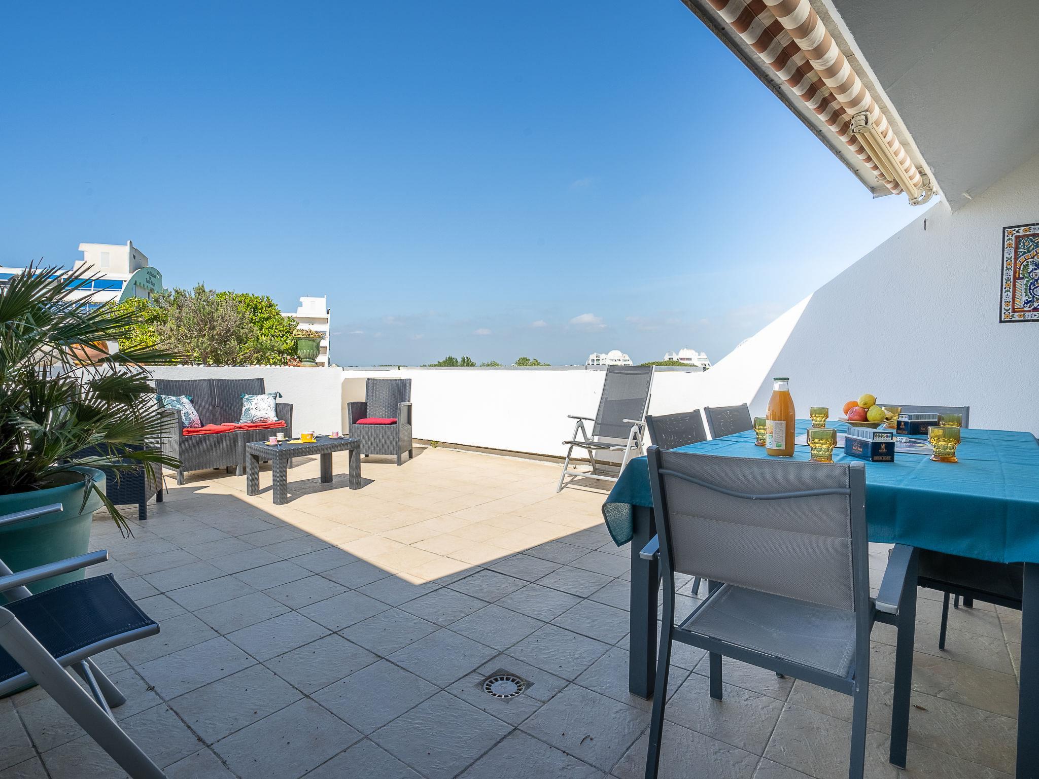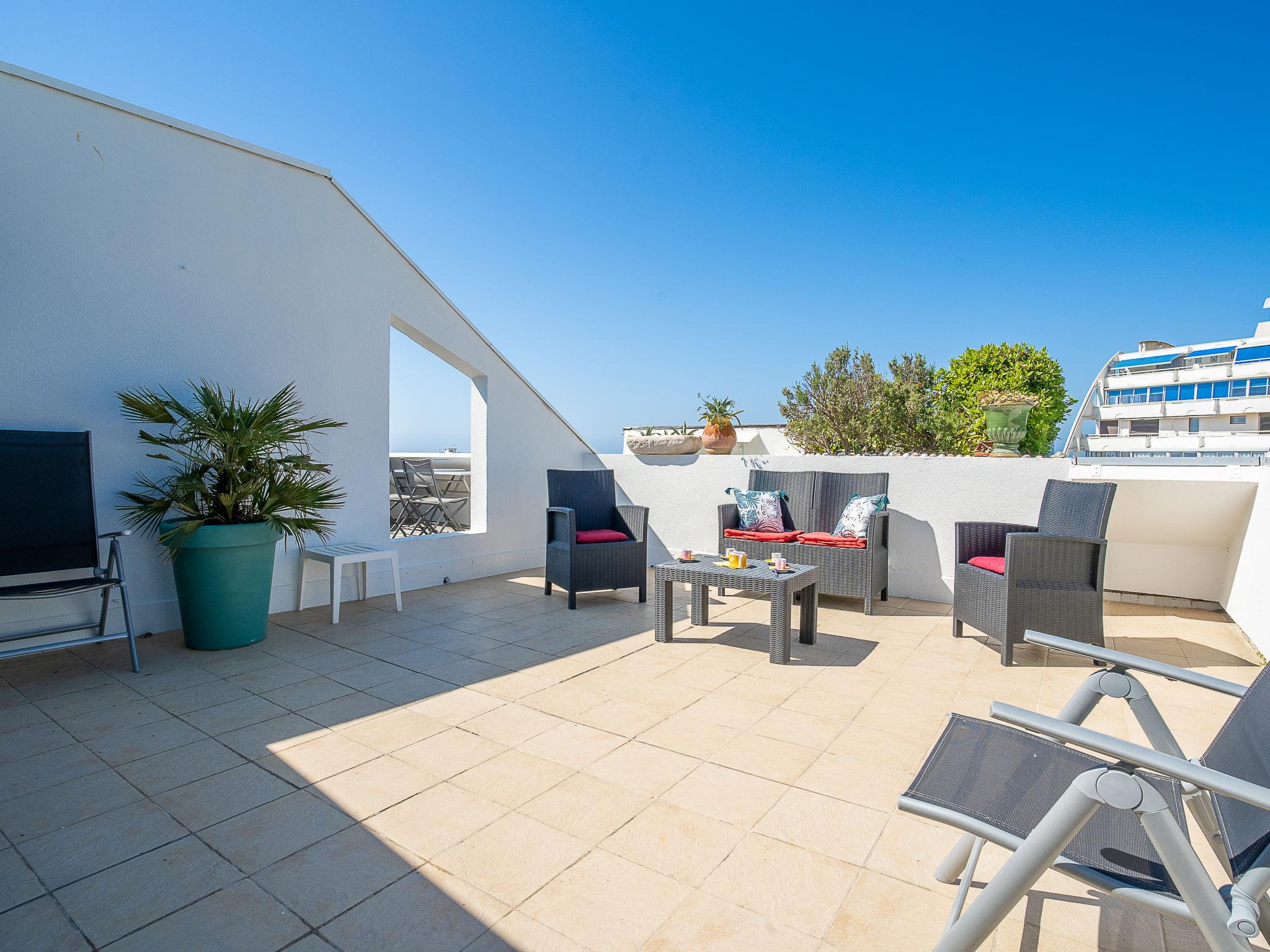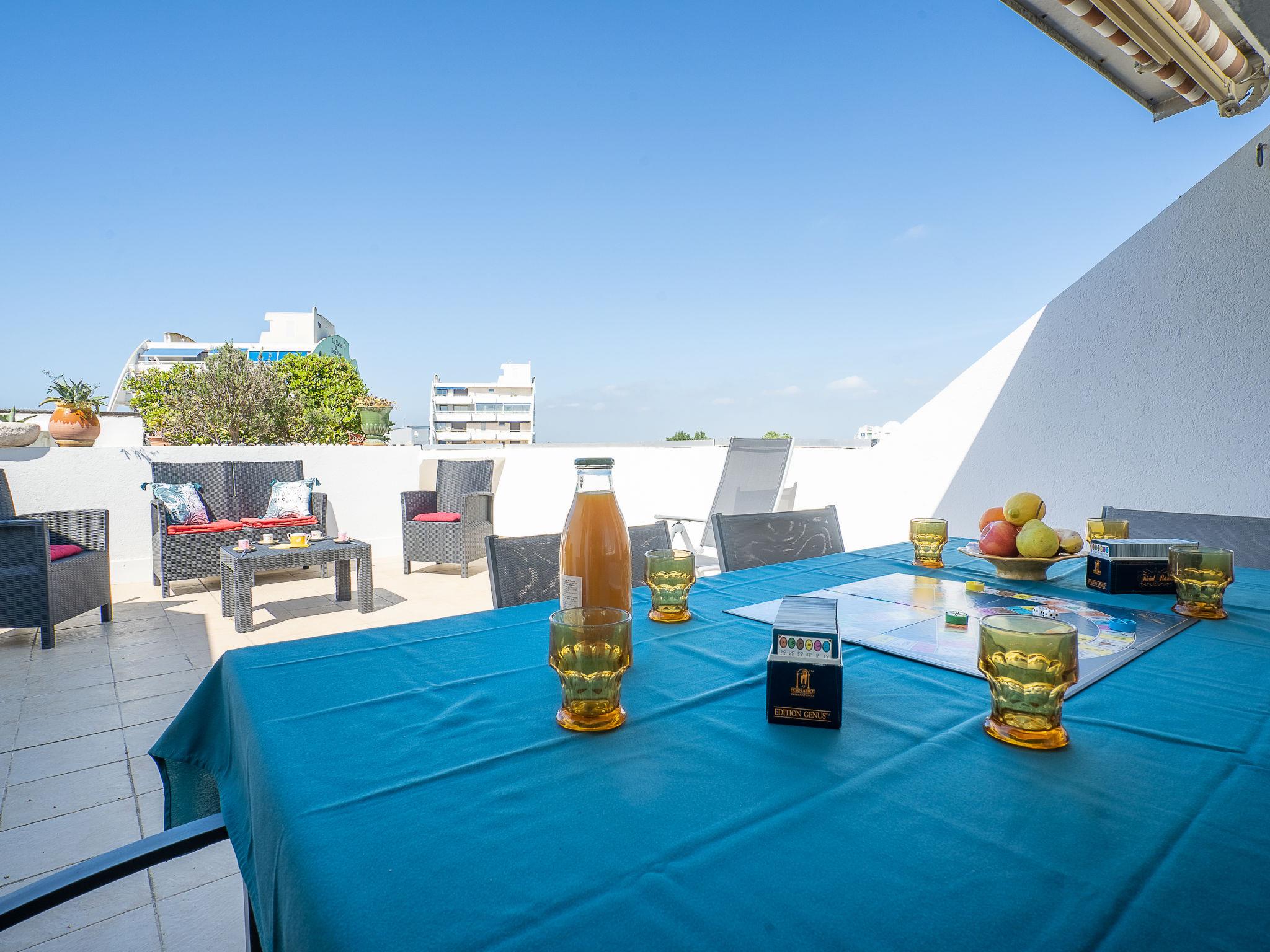 3-room apartment 53 m2 on 2 levels on 4th floor. Beautiful furnishings: 1 room with 1 french bed (140 cm), air conditioning. 1 children's room with 2 beds (90 cm), air conditioning. Exit to the loggia. Bathroom, sep. WC. Upper floor: (spiral staircase) living/dining room with TV (flat screen), air conditioning. Exit to the terrace. Open kitchen (oven, dishwasher, 4 ceramic glass hob hotplates, microwave, freezer). Heating. Terrace 35 m2, south-west facing position terrace 15 m2, south-west facing position. Terrace furniture, covered balcony. View of the sea. Facilities: washing machine. Internet (WiFi, extra). Parking. Please note: smoke alarm. Offer by a private individual according to Art. 155, IV of CGI.