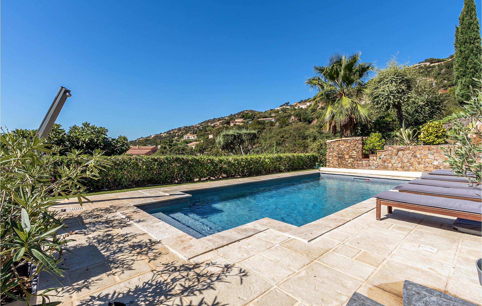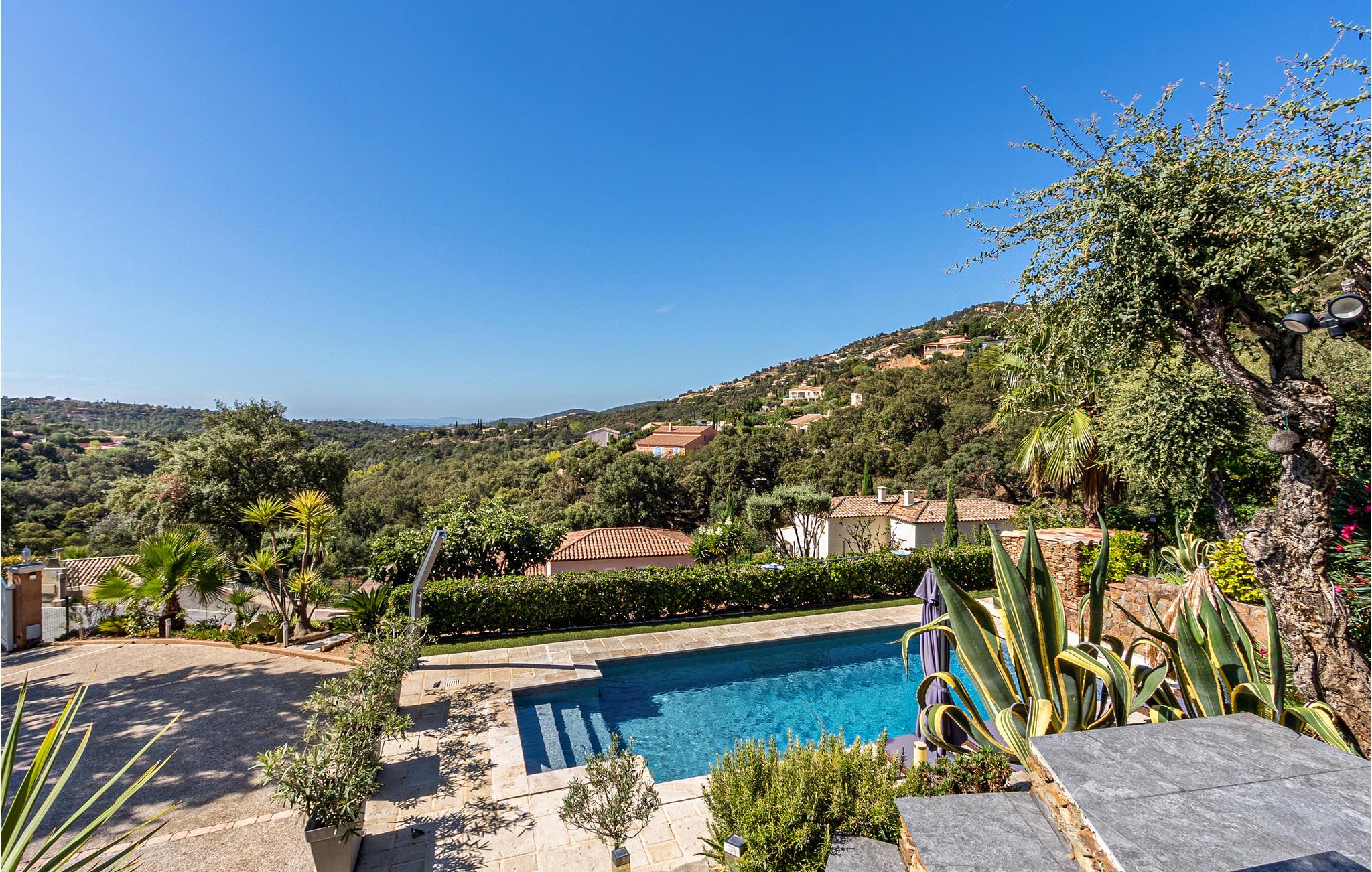Denne dejlige villa forkæler jer med en vidunderlig udsigt over et grønt bakkelandskab og middelhavet i de fjerne. Ferieboligen strækker sig over to etager og er meget flot indrettet. I den øverste etage er der to soveværelser, badeværelse og WC. Stueetagen byder på en stor stue med et amerikansk og meget godt udstyret køkken, et separat toilet, såvel som et soveværelse med dobbeltseng og walk- in closet, bad og WC. I de fleste rum er der store glasruder, som giver en herlig udsigt over kysten. Terrasserne inviterer til lange måltider i det fri eller bare til ren afslapning i det dejlige provencalske klima. Lidt neden for huset er poolområdet. Tag en frisk dukkert eller tag et solbad i liggestolene. Ved poolen er der en solardouche. Selve poolen bliver renset med salt, for at være sikker på at vandet er rent. En kilometer herfra ligger 18 hullers golfbanen Valcros. Tag på bådudflugt til de flotte Hyères-øer Porquerolles, Port-Cros og Le Levant. Overfor ligger øerne La Londe-les-Maures med fine strande på en længde af næsten tre kilometer. Men La Londe – les-Maures er meget mere end det: mange forskellige vandsportaktiviteter, vandrestier, vinavler, produktion af olivenolie og provencalske bondemarkeder.