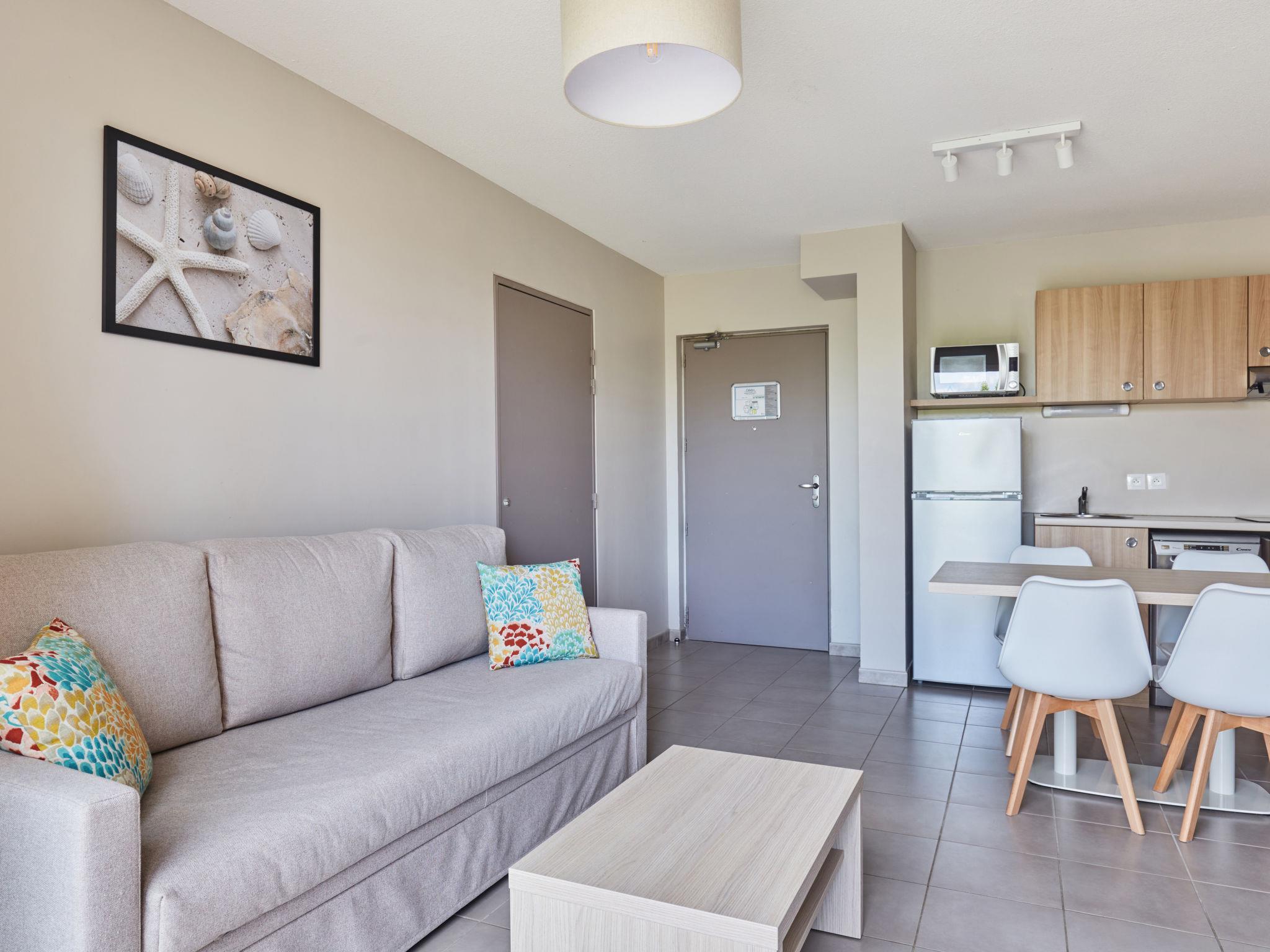 "Odalys Référence Les Océanides", 1-room apartment 23 m2. Bright, modern furnishings: living/sleeping room with 2 sleeping facilities and dining table. Kitchenette (2 ceramic glass hob hotplates, kettle, microwave, electric coffee machine). Bath/WC or shower/WC. Electric heating. Balcony or terrace. Balcony furniture. Facilities: children's high chair, baby cot. Internet (WiFi, free). Parking. Please note: non-smokers only. Maximum 1 pet/ dog allowed. Smoke alarm.