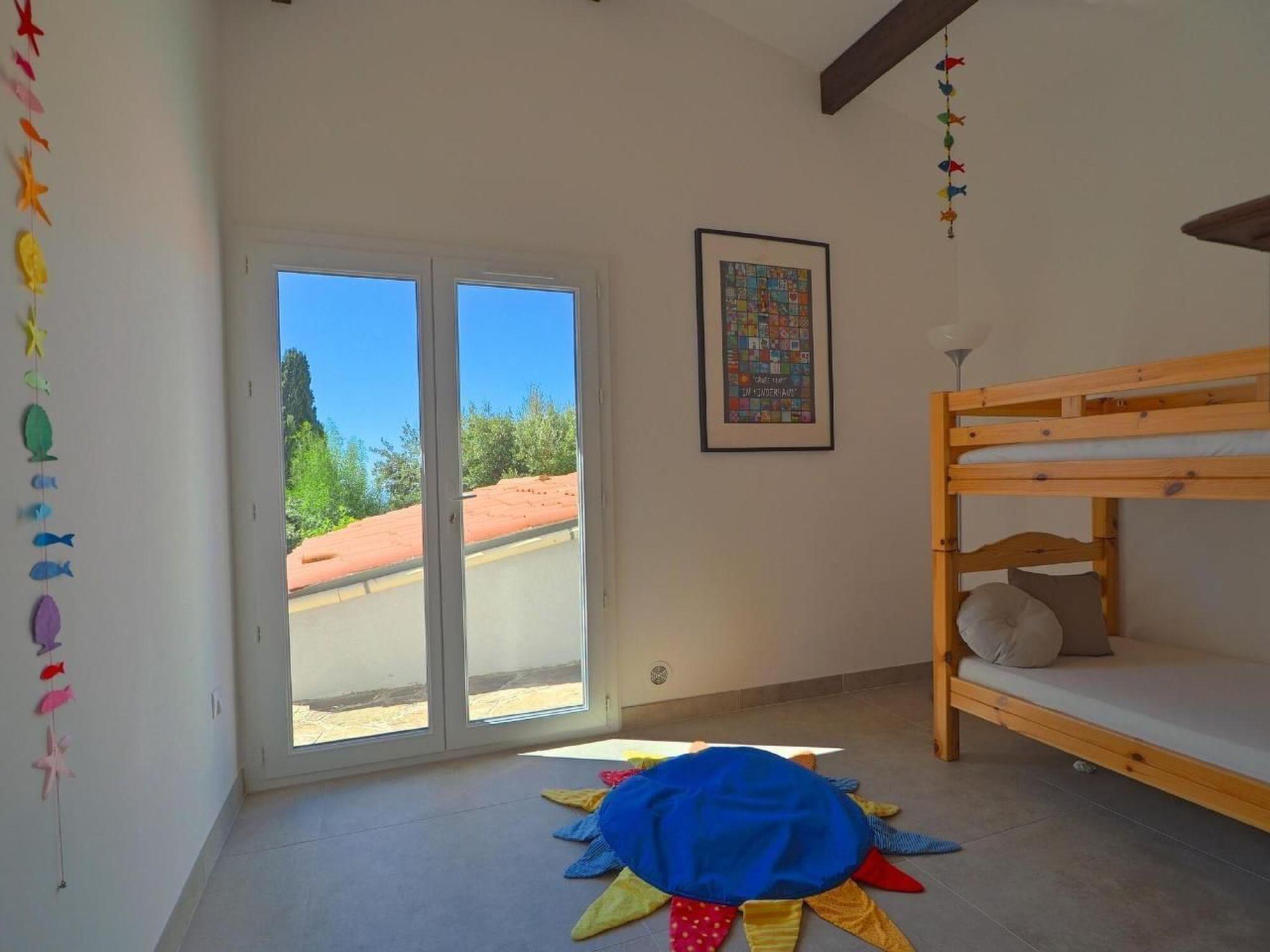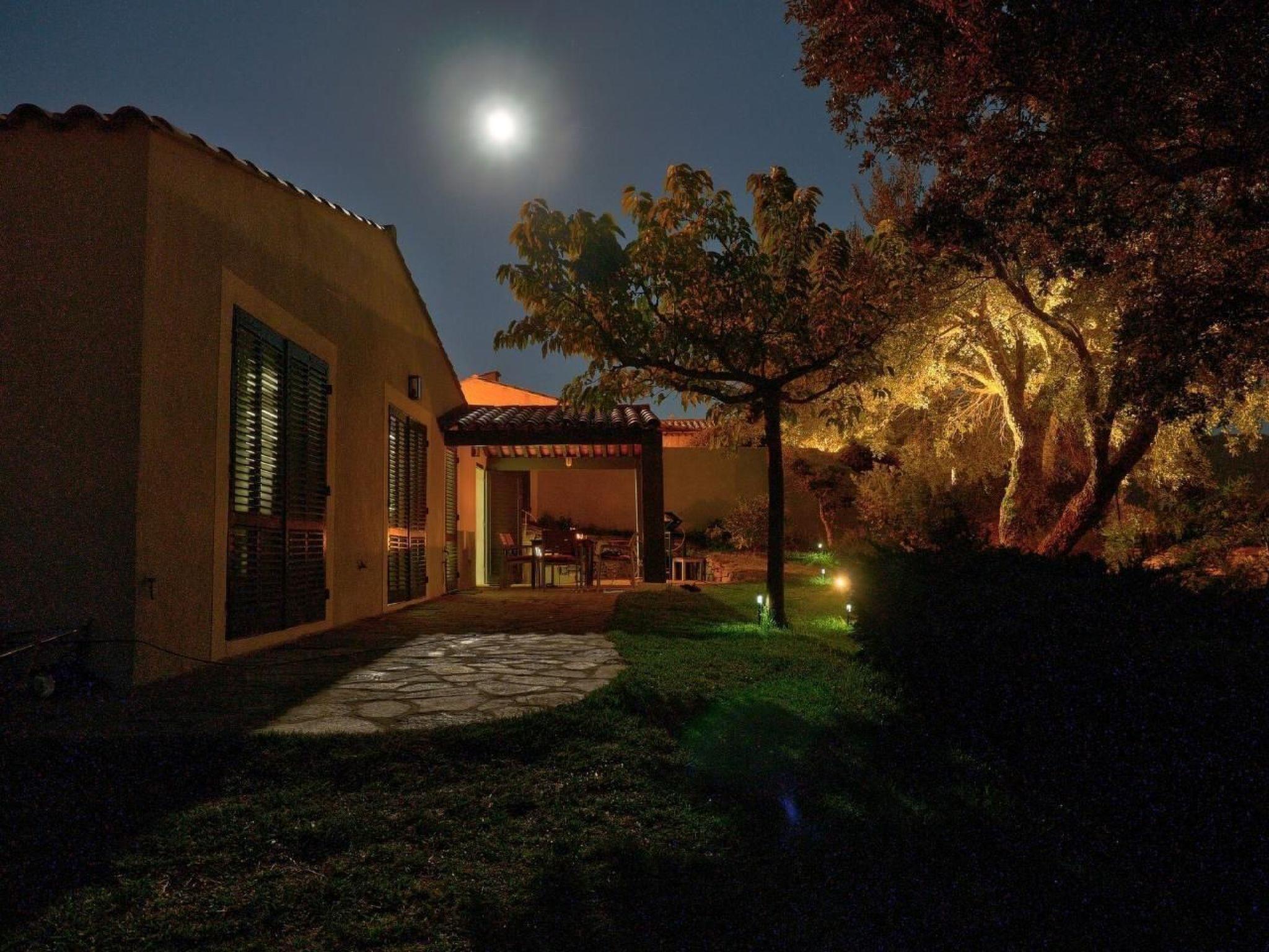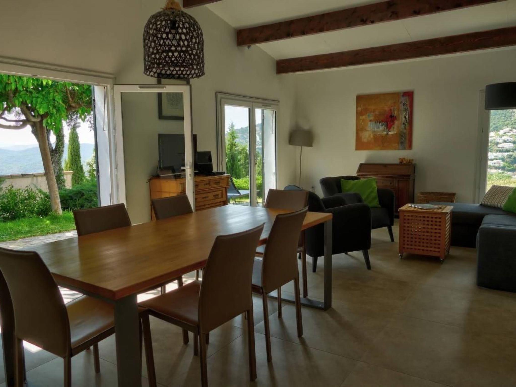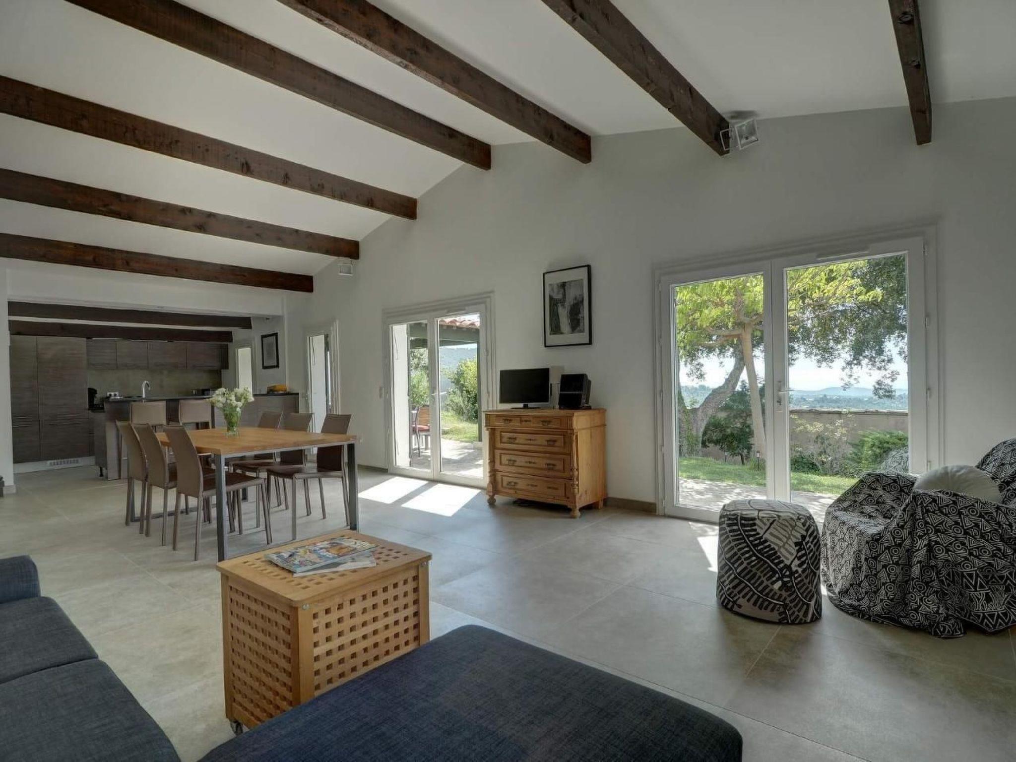 The renovated villa in Valcros (near La Londe les Maures) is located in a quiet residential area on a hill in the foothills of the Massif des Maures. From the detached house and the terraces you can enjoy a fantastic panoramic view of the entire bay of Hyeres with the Giens peninsula and the Ile de Porquerolles. The garden is shaded by two cork oaks and a patio cover, but also offers plenty of sunny spots depending on your taste and the time of year. The 12 x 6 metre pool is located in a slightly lower part of the garden. The house and garden are south-west facing, so you will always find a suitable spot with a good view. The house has an allocated parking space (further visitor parking spaces are also available), which is located at the end of a cul-de-sac. Access to the property is via several steps. The plots are arranged in such a way that you are undisturbed in the house and garden.