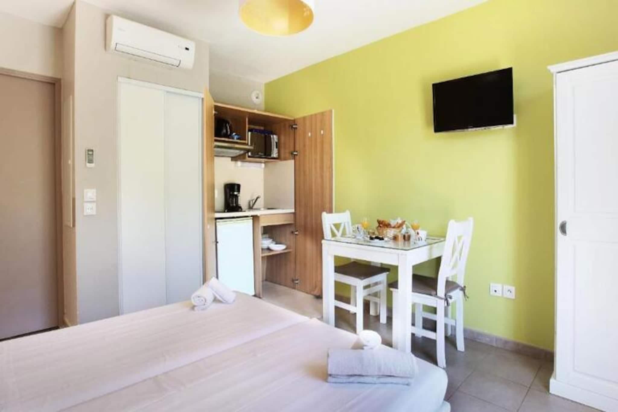 Denne hyggelige studiolejlighed er ideel til to personer og har en dobbeltseng, der kan omdannes til en sovesofa. Ejendommen er kæledyrsvenlig og tillader ét kæledyr mod et ekstra gebyr, med gratis Wi-Fi og sengetøj inkluderet i lejen. Beliggende i en bolig med forskellige faciliteter, kan gæsterne nyde gratis udvendig parkering og rekreative faciliteter. Der kræves depositum, og slutrengøring er inkluderet, eksklusive køkkenopgaver. Boligen ligger kun 400 meter fra stranden og byder på naturskønne gå- og cykelture med udsigt over De Gyldne Øer. Byen La Londe les Maures ligger i nærheden, med caféer, butikker og markeder. I løbet af juli og august tilbyder et hold familieaktiviteter samt programmer for børn og teenagere. Studiet har et fuldt udstyret tekøkken, et badeværelse med toilet og bruser samt en privat terrasse eller balkon. Gæsterne kan også nyde boligens udendørs swimmingpool, sauna og fitnessområde (mod ekstra gebyr), hvilket forbedrer deres ophold på denne smukke beliggenhed.