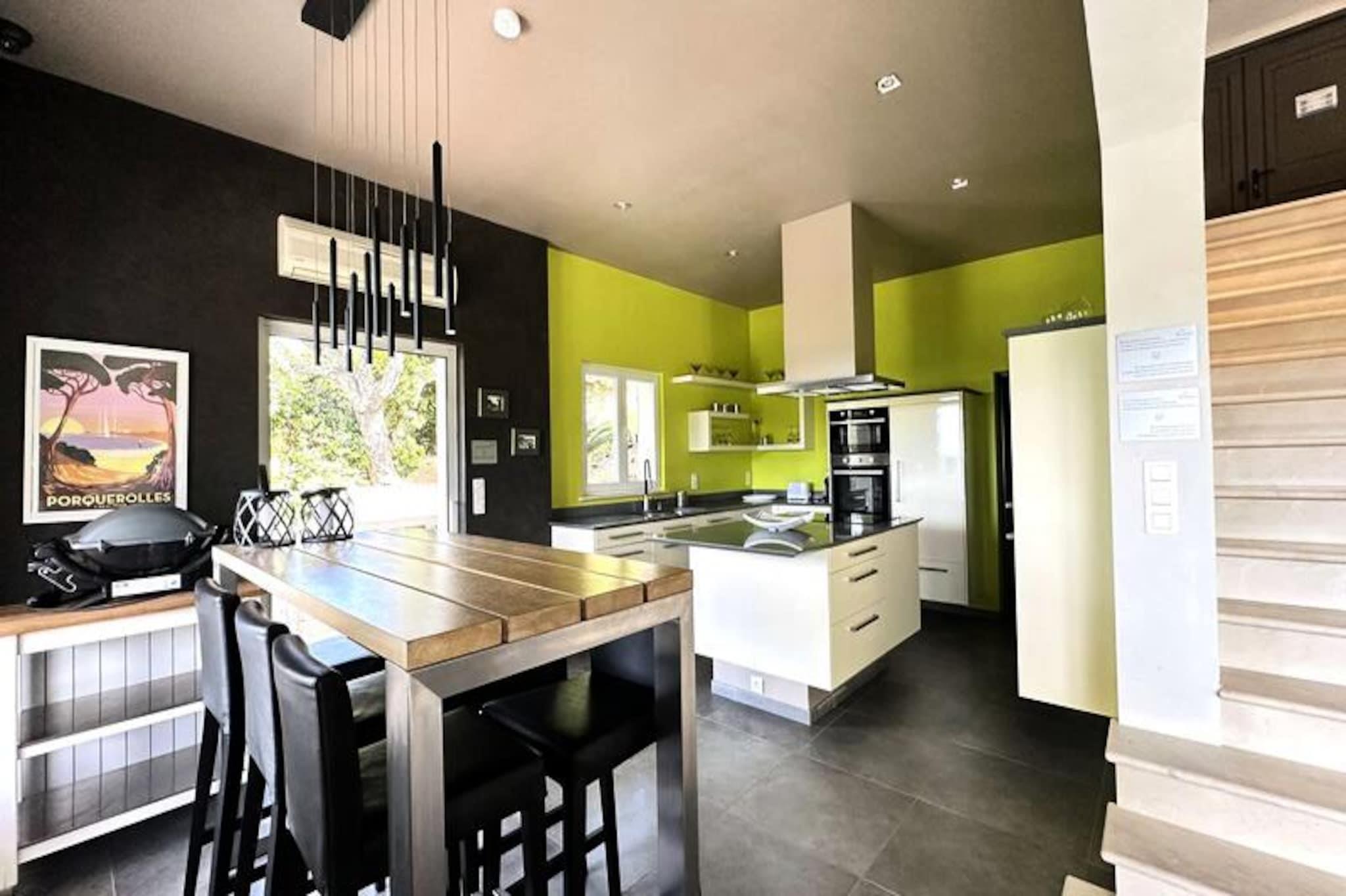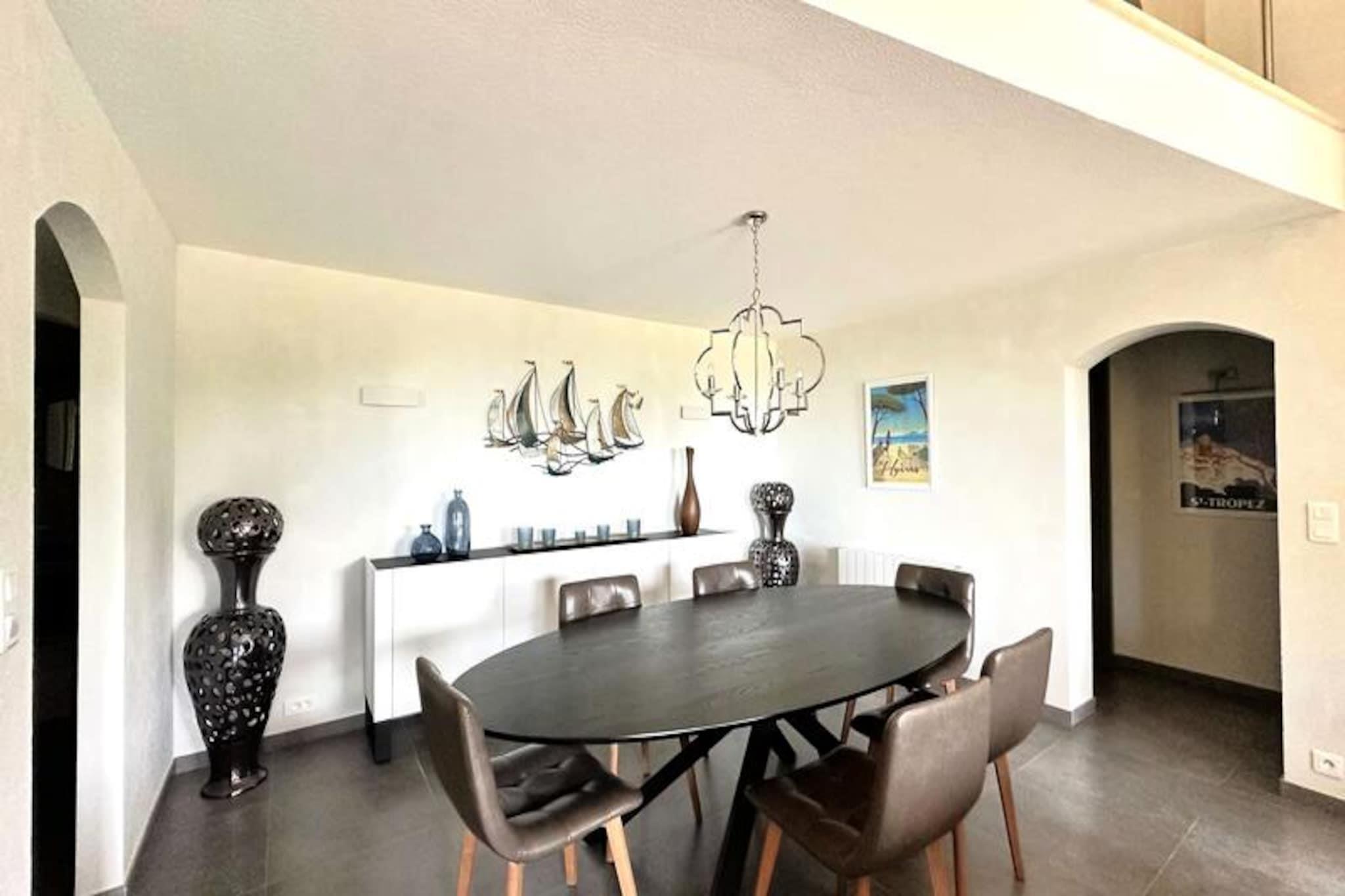 Nyd den fredfyldte charme i La Mandragora, en fantastisk villa beliggende i hjertet af Domaine de Valcros. Omgivet af frodigt grønt og kun få øjeblikke fra golfbanen, tilbyder dette idylliske tilflugtssted den perfekte flugt for familier eller venner, der søger ro i den maleriske Var-region. Forestil dig at vågne op til den blide middelhavsbrise, nyde din morgenkaffe på terrassen med panoramaudsigt over havet og tilbringe dine dage i fuldstændig afslapning. Villaen kan prale af 120 m² elegant opholdsstue beliggende på en vidtstrakt 1800 m² stor grund. Dens midtpunkt er den storslåede infinity-pool (9x5m), hvor du kan sole dig eller nippe til cocktails tilberedt i poolhusets bar. Indenfor er villaen omhyggeligt designet på tværs af to etager. Øverste etage har et soveværelse med aircondition, en queensize-seng og en privat terrasse med udsigt over havet, samt et rummeligt badeværelse og separat toilet. I stueetagen flyder den åbne stue og spisestue med pejs problemfrit over i et fuldt udstyret køkken, der alle åbner ud til en lang terrasse med betagende udsigt over poolen og kystlinjen. To ekstra soveværelser med aircondition, queensize-senge og rigelig opbevaringsplads tilbyder også direkte adgang til terrassen. La Mandragora har en perfekt beliggenhed, kun 15 minutter fra den charmerende by La Londe-Les-Maures, 16 minutter fra den uberørte L'Argentière-strand og inden for rækkevidde af L'Estagnol-stranden og færgeterminalen Îles d'Or. Uanset om du udforsker de gyldne strande i Hyères eller nyder lokale provencalske delikatesser, sikrer villaens beliggenhed uforglemmelige oplevelser. Med sin infinity-pool, petanquebane og luksuriøse faciliteter inviterer La Mandragora dig til at skabe dyrebare minder under Var-solen. En drømmeferie venter i dette udsnit af middelhavsparadiset.