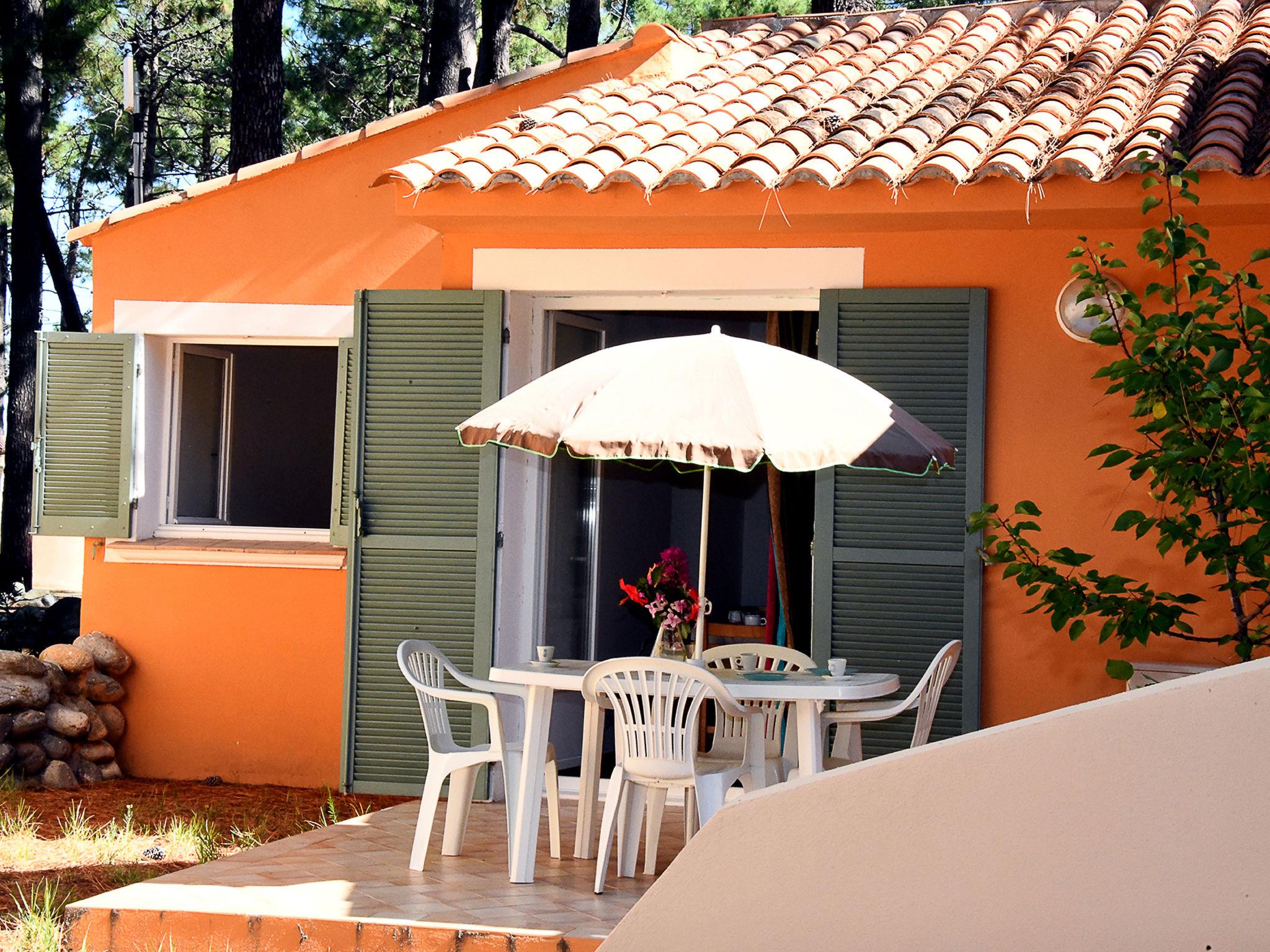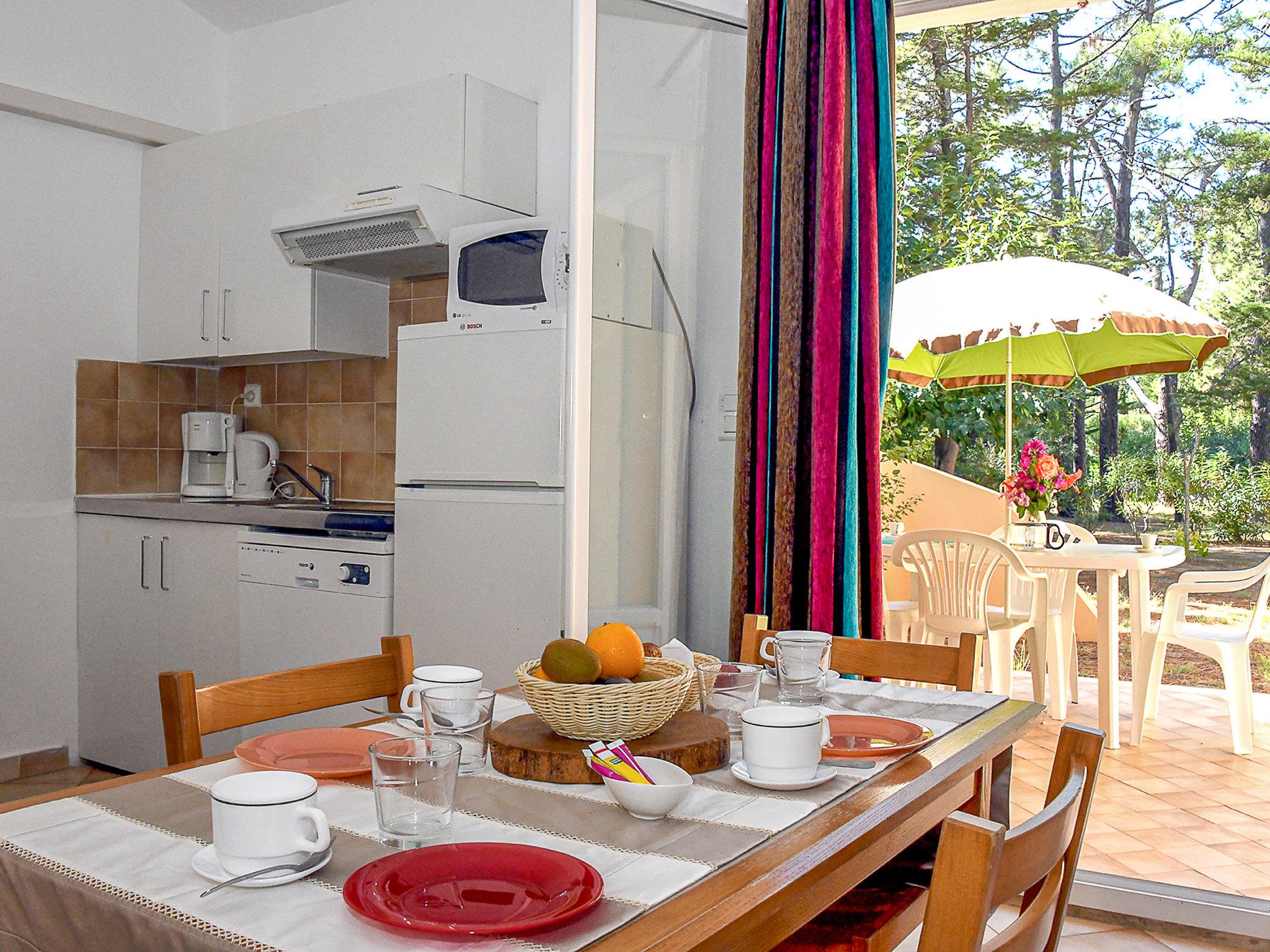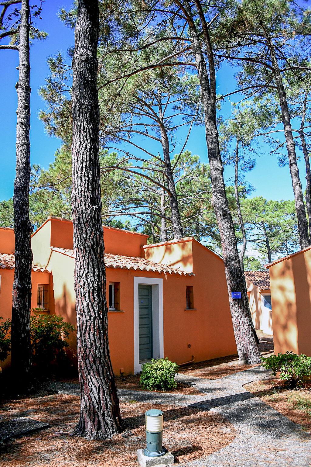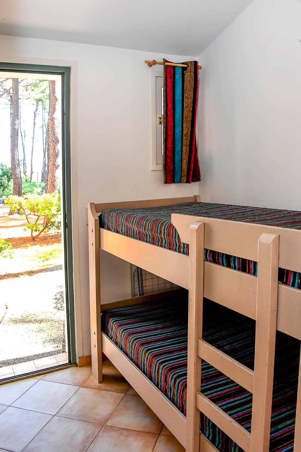 "T2 Cabine Type C", 2-room terraced house 32 to 35 m2. Object suitable for 4 adults + 2 children. Practical furnishings: living/dining room with 1 double sofabed (140 cm, length 190 cm), 1 x 2 bunk beds (90 cm, length 190 cm), TV (flat screen), air conditioning. Exit to the terrace. 1 room with 1 double bed (140 cm, length 190 cm). Kitchenette (dishwasher, 2 ceramic glass hob hotplates, kettle, microwave, electric coffee machine). Bath/WC. Electric heating. Balcony or terrace. Terrace furniture. View of the garden. Facilities: Internet (WiFi). Please note: maximum 2 pets/ dogs allowed. Smoke alarm.