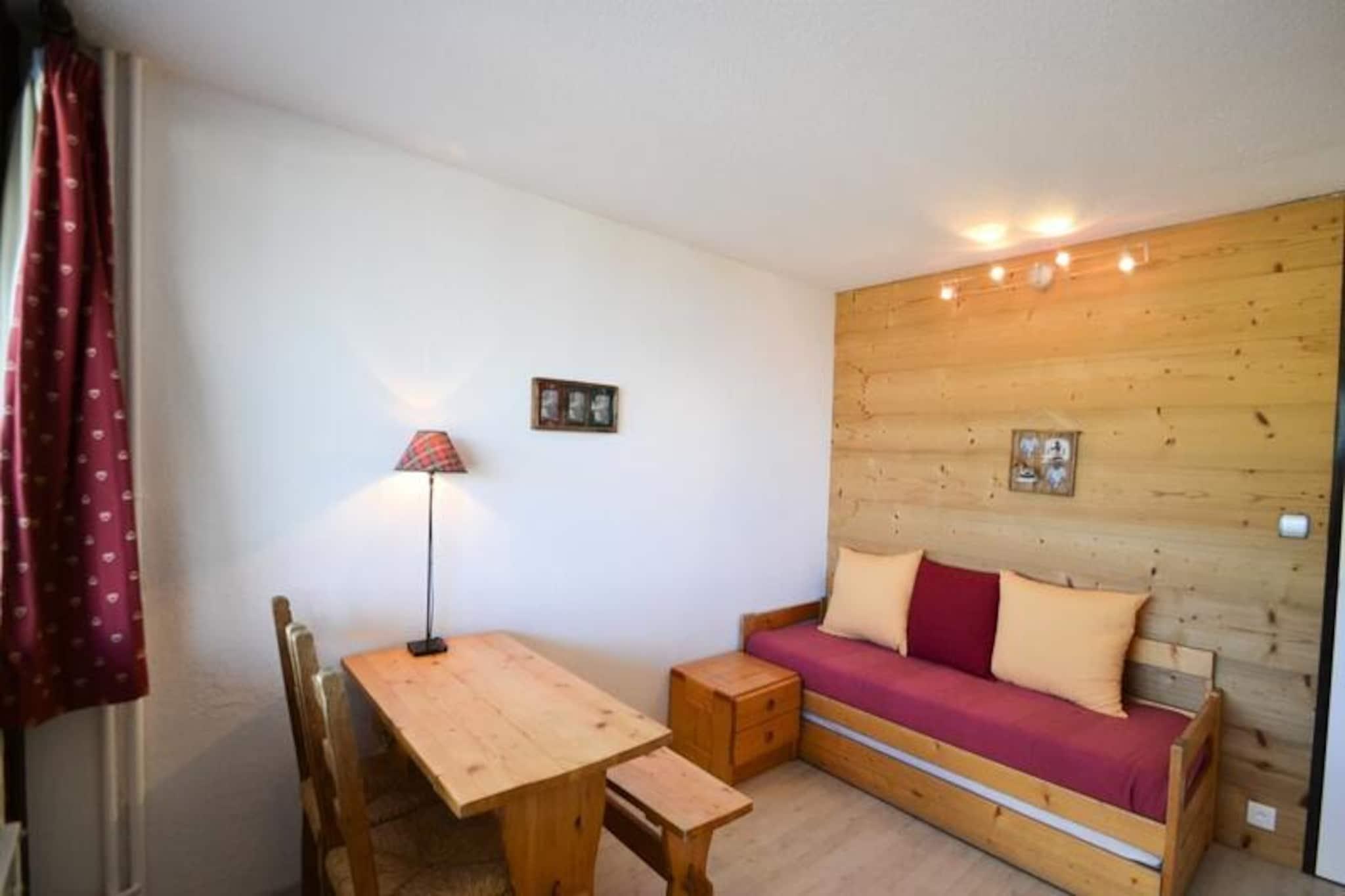 Højt over Tarentaise-dalen, hvor den majestætiske Mont Blanc pryder horisonten, inviterer dette charmerende studie i Residence Le France dig til at opleve magien i de franske alper. Ejendommen er perfekt beliggende i Plagne Centre og tilbyder direkte adgang til pisterne direkte til skiløb, hvilket sikrer, at dine alpine eventyr begynder i det øjeblik, du træder udenfor. Uanset om du er her for at grave dig gennem uberørt sne eller sole dig i den fredfyldte skønhed på sommerstierne, er dette hyggelige tilflugtssted din port til uforglemmelige bjergøjeblikke. \n\nStudioet er designet til to gæster og har en kompakt, men funktionel indretning. Det lille køkken, udstyret med elektriske kogeplader, mikrobølgeovn og køleskab, er ideelt til at tilberede hurtige måltider, inden du tager afsted. Stuen fungerer også som spiseplads og soveplads med to komfortable udtrækssenge og et tv til afslappende aftener. Badeværelset har badekar og toilet, mens laminatgulvet tilføjer et varmt præg til interiøret. Selvom studiolejligheden vender mod nord uden balkon, tilbyder den en betagende udsigt over Mont Blanc, hvilket gør hvert blik ud af vinduet til en påmindelse om de naturlige vidundere, der omgiver dig.\n\nResidence Le France kan prale af en uovertruffen beliggenhed, forbundet med butikker via et indendørs galleri og tilbyder praktiske faciliteter såsom et skirum. Indgangen på Plagne Villages-siden sikrer nem adgang til både pisterne og lokale attraktioner. Om vinteren kan du nyde problemfri skioplevelser, mens sommeren åbner op for muligheder for vandreture, cykling og udforskning af regionens betagende landskaber.\n\nUanset om du søger spændende udendørsaktiviteter eller en fredelig alpin flugt, kombinerer denne studiolejlighed komfort, praktisk anvendelighed og nærhed til naturen, hvilket gør den til et ideelt valg for par eller solorejsende, der ønsker at fordybe sig i de franske alpers skønhed.
