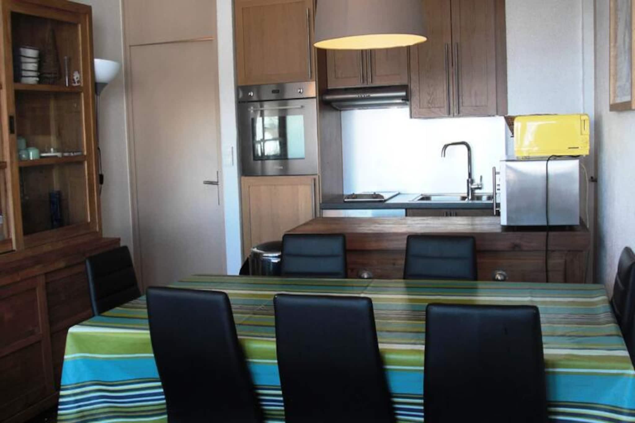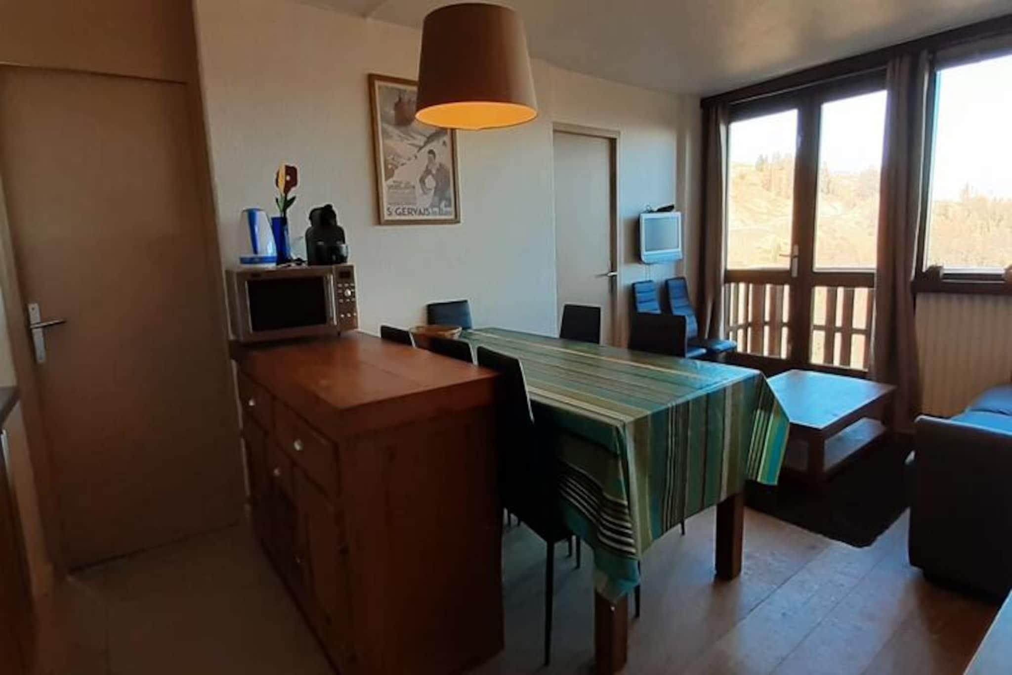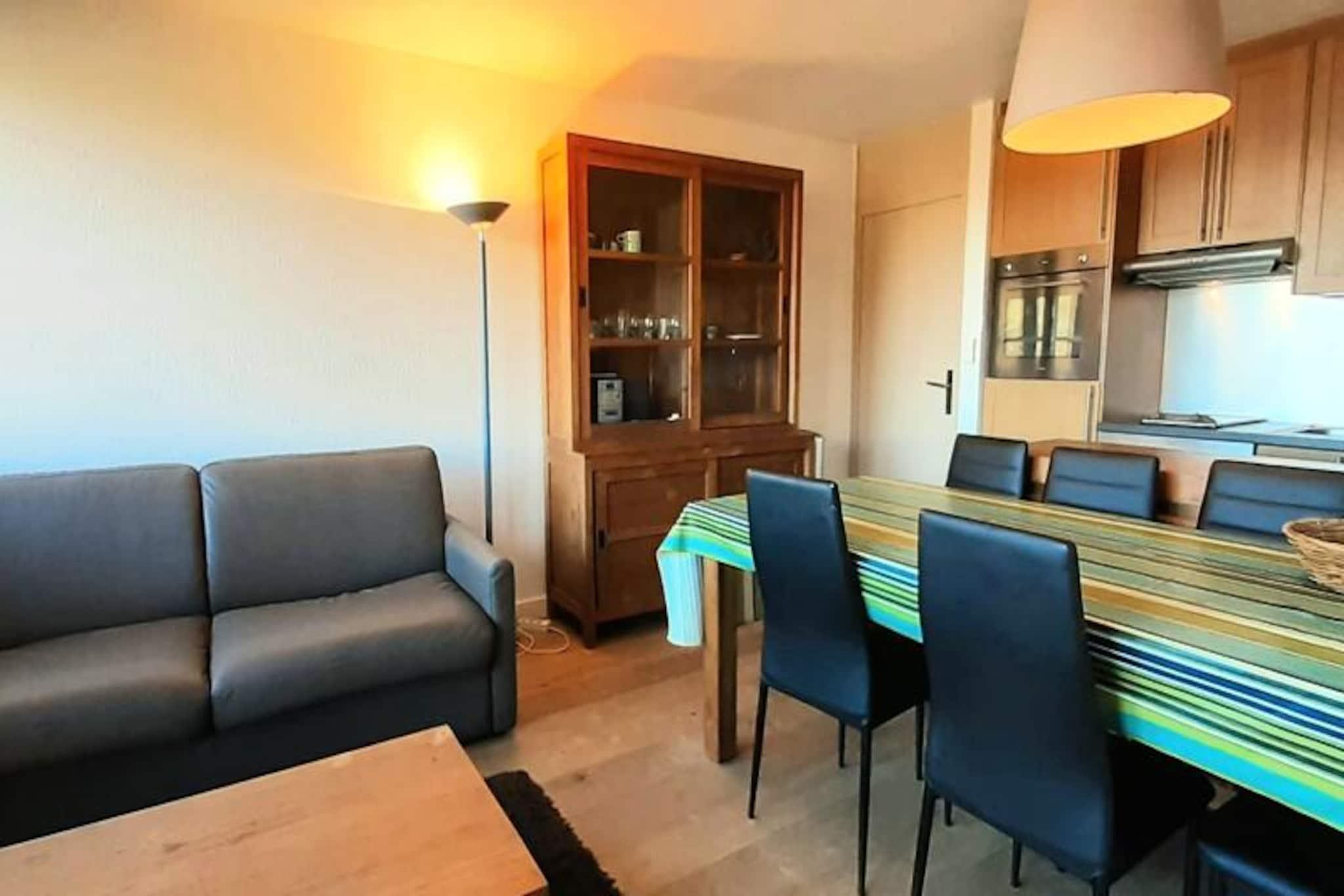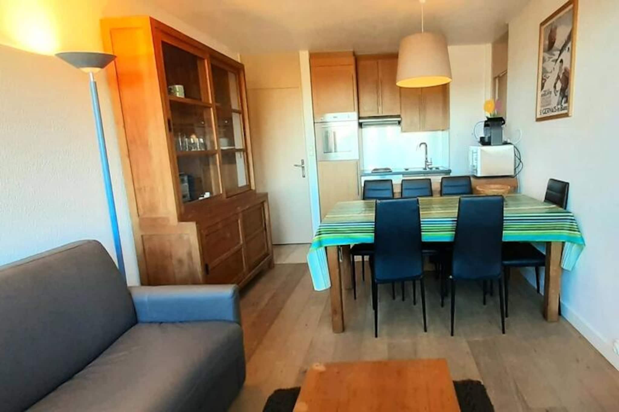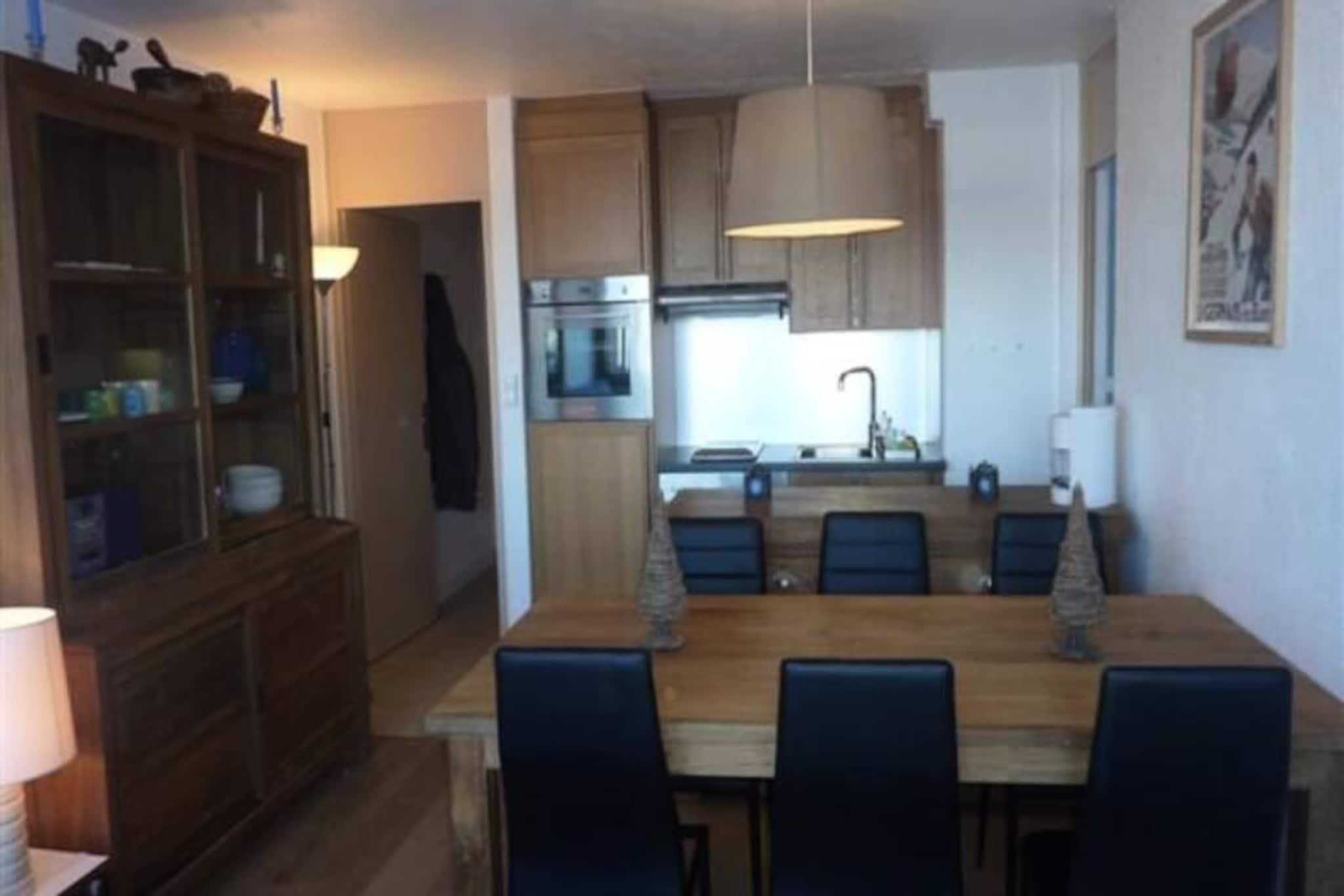 Højt over Tarentaise-dalen tilbyder denne charmerende lejlighed i Le Mustag Residence et hyggeligt tilflugtssted for din alpine ferie. Beliggende i hjertet af Plagne Centre, i en højde af 1970 meter, giver den nem adgang til det pulserende feriestedsliv, samtidig med at du nyder en betagende udsigt over de omkringliggende bjerge og dale. Uanset om du er her for de snedækkede pister eller de solbeskinnede sommerstier, er dette den perfekte base for dine eventyr. Lejligheden på 43 m² har komfortabel plads til op til seks gæster, hvilket gør den ideel til familier eller små grupper. Den lyse stue inviterer dig til at slappe af med sin hyggelige sofa og tv, mens det åbne køkken er fuldt udstyret med moderne apparater, herunder opvaskemaskine, ovn, mikrobølgeovn og keramisk kogeplade, hvilket sikrer, at du har alt, hvad du behøver for at tilberede måltider efter en dag med udforskning. De to soveværelser har en dobbeltseng i det ene og to sæt køjesenge i det andet, hvilket tilbyder fleksible sovemuligheder. Et badeværelse med badekar og toilet fuldender rummet, og et privat skirum giver ekstra bekvemmelighed for vintersportsentusiaster. Plagne Centre er det bankende hjerte af feriestedet med butikker, restauranter og aktiviteter kun 50 meter fra din dør. Klatringen til La Grande Rochette, et af de mest fantastiske 360° panoramaer i Alperne, er let tilgængeligt og tilbyder uforglemmelige udsigter. Om vinteren gør ski-in/ski-out det nemt at komme ud på pisterne, mens sommeren byder på muligheder for vandreture, mountainbiking og at nyde den alpine skønhed. Uanset om du søger spændende eventyr eller rolige øjeblikke omgivet af naturen, kombinerer denne lejlighed komfort, bekvemmelighed og en uovertruffen beliggenhed. Gør dit ophold i de franske alper virkelig mindeværdigt med dette indbydende bjergparadis.