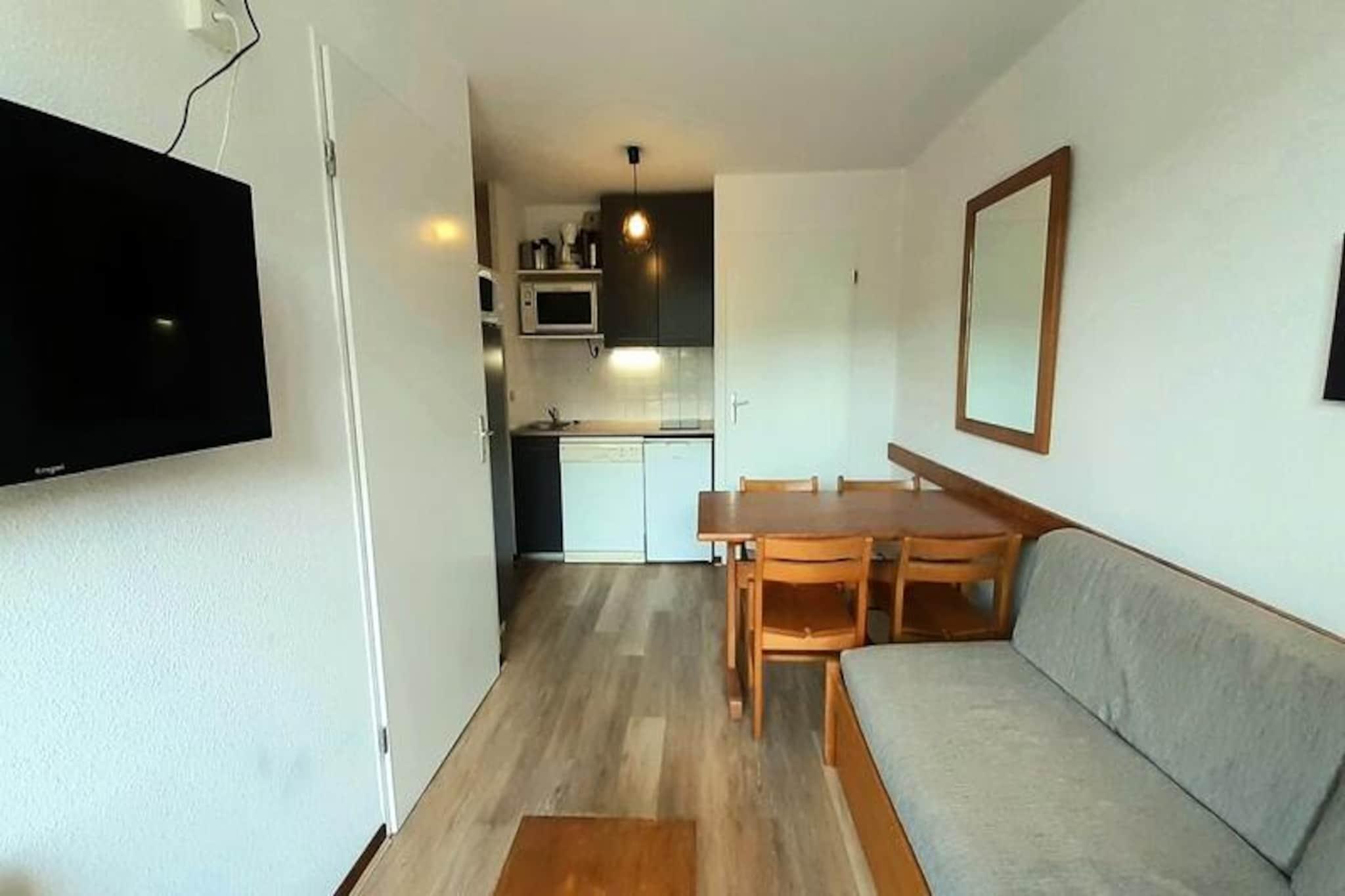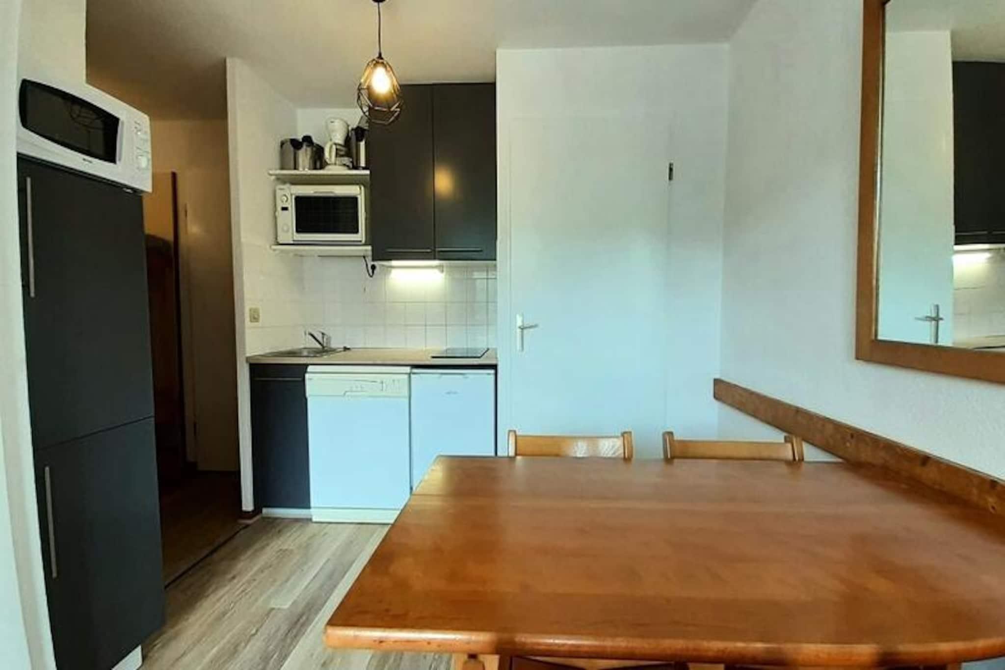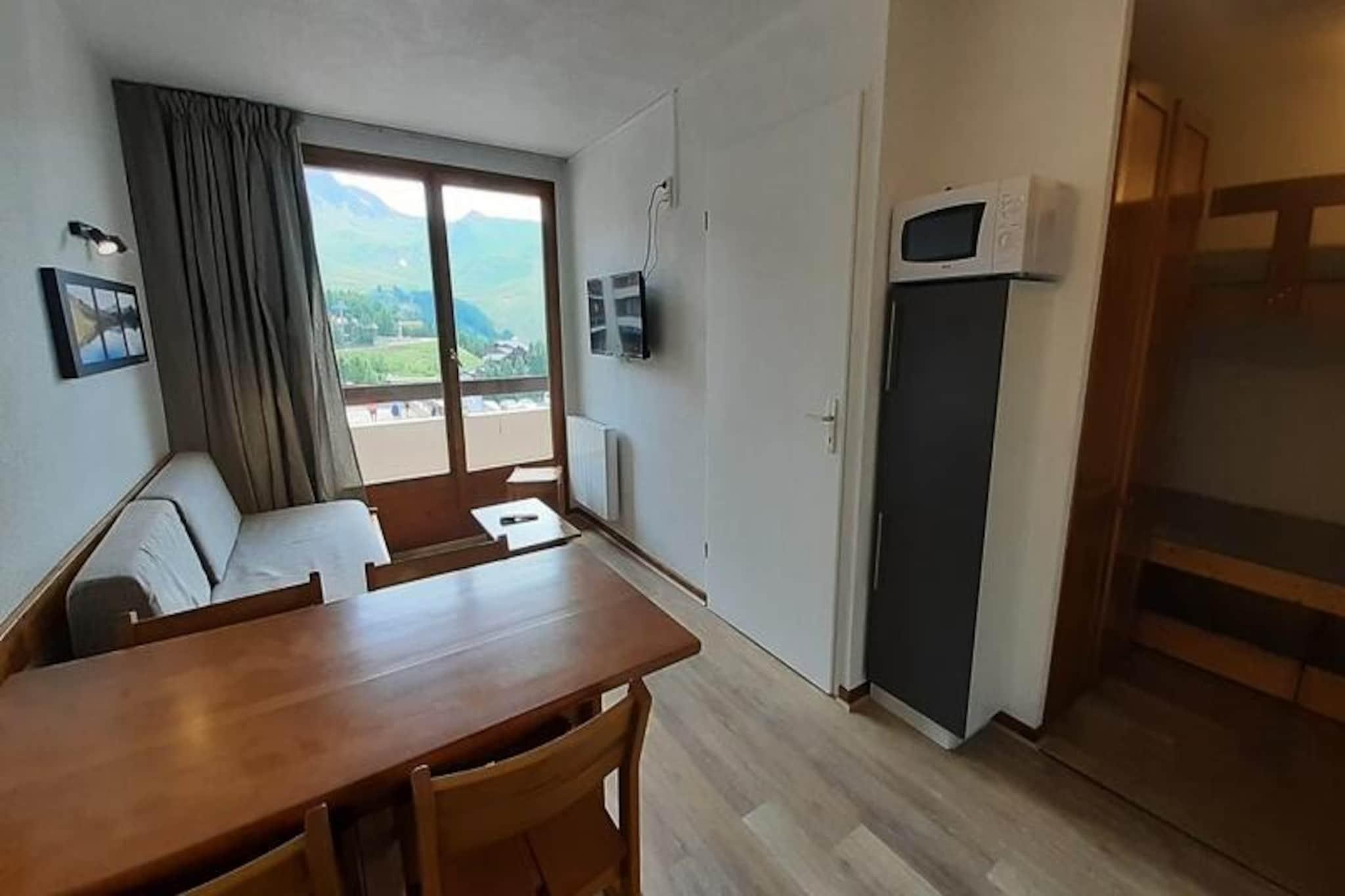 Nyd Plagne Soleils gyldne glød, hvor denne charmerende etværelseslejlighed tilbyder et hyggeligt tilflugtssted midt i de betagende franske alper. Perfekt beliggende i hjertet af feriestedet tilbyder denne bolig direkte adgang til pisterne, hvilket sikrer, at dine alpine eventyr begynder kun få skridt fra din dør. Med sin sydvestvendte balkon kan du nyde solen og den panoramaudsigt over bjergene, hvilket gør hvert øjeblik her uforglemmeligt. Uanset om du er skiløber, der søger spændende nedkørsler, eller vandrer, der er ivrig efter at udforske rolige gangstier, lover Plagne Soleil noget særligt for enhver smag. Denne omhyggeligt designede lejlighed på 26 m² har komfortabel plads til op til fem gæster. Stuen har en sovesofa og et tv, hvilket skaber et indbydende rum til at slappe af efter en dag på pisterne. Det åbne køkken er fuldt udstyret med moderne apparater, herunder ovn, mikrobølgeovn, keramisk kogeplade, køleskab og opvaskemaskine, hvilket gør det nemt at tilberede solide måltider. Soveværelset har en hyggelig dobbeltseng, mens et separat soveområde med en køjeseng sikrer komfort for familier eller grupper. Et badeværelse med badekar og et separat toilet gør dit ophold mere behageligt. Yderligere faciliteter såsom skiboks og elevator forbedrer din oplevelse. Plagne Soleil lever op til sit navn med sin solrige beliggenhed og centrale beliggenhed i skiområdet. En gratis shuttle forbinder dig med den nærliggende Plagne Village, hvilket udvider dine muligheder for at spise, shoppe og udforske. Familier vil sætte pris på nærheden til børnehaven, mens alle gæster kan nyde den pulserende atmosfære på feriestedet. Uanset om du er her for vintersport eller sommervandreture, er denne lejlighed din port til Alpernes skønhed og spænding. Vælg dette dejlige tilflugtssted til din næste bjergferie og skab minder, der vil vare hele livet.