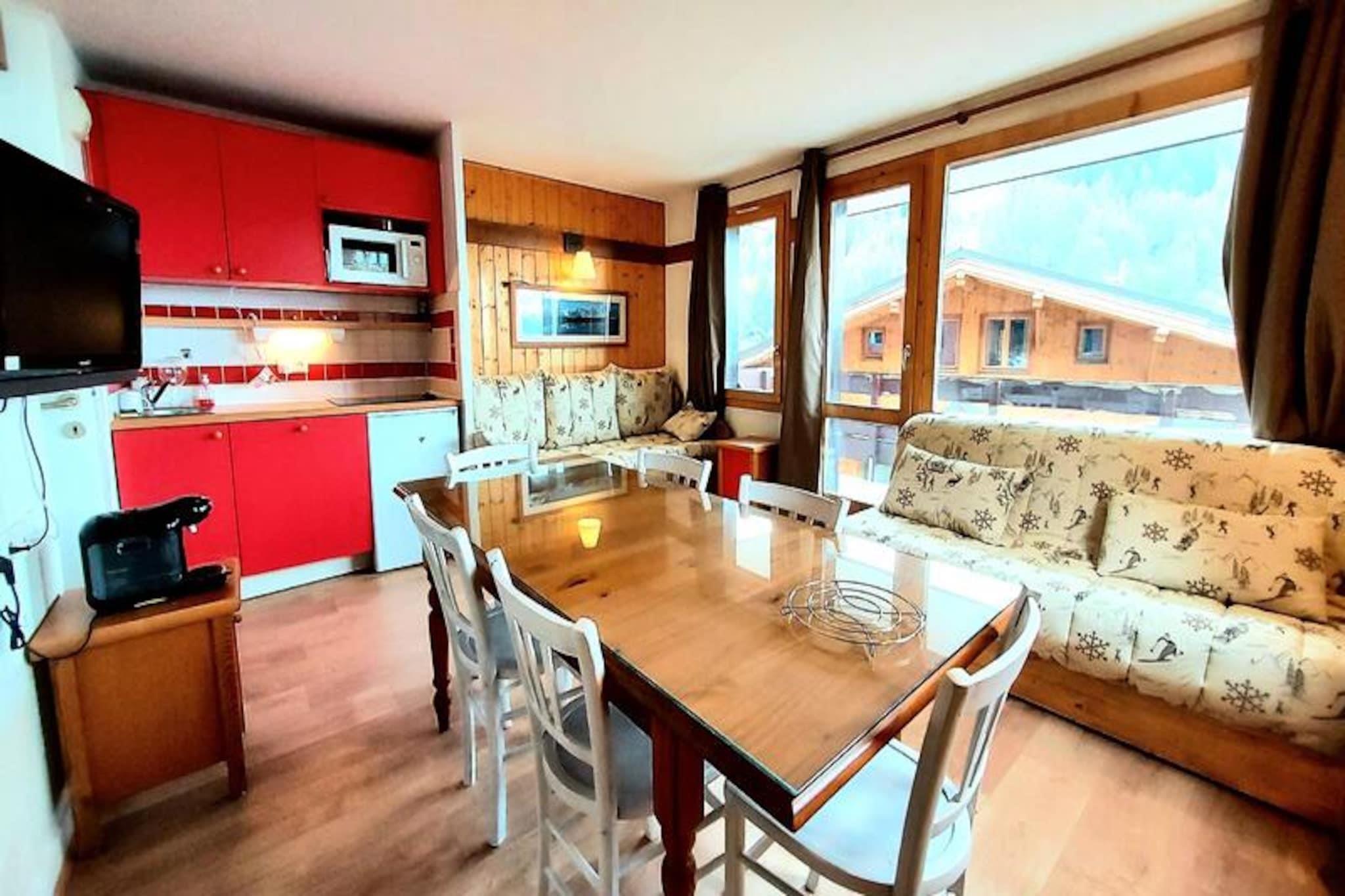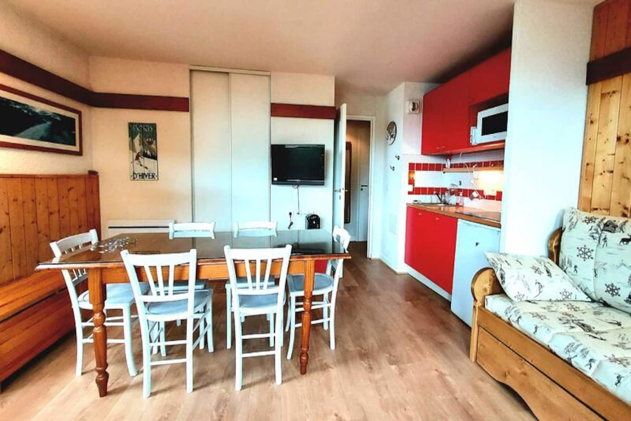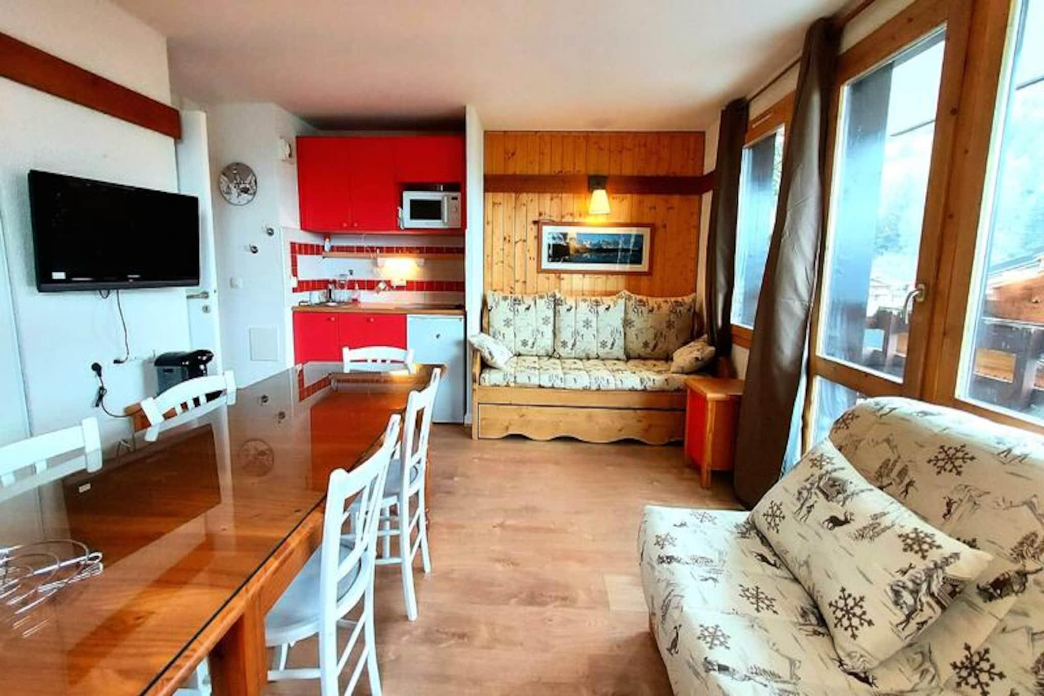 I det rolige hjerte af Plagne 1800, omgivet af frodige alpine skove, tilbyder denne charmerende lejlighed med et soveværelse et perfekt tilflugtssted for familier og små grupper, der søger både eventyr og afslapning. Boligen, som er en del af et malerisk kompleks i chaletstil, kombinerer rustik bjergcharme med moderne bekvemmeligheder og skaber en varm og indbydende atmosfære til din ferie. Den vestvendte balkon tilbyder et roligt sted at slappe af med en fantastisk udsigt over de omkringliggende tinder, mens solen går ned over Alperne. Indenfor er den 32 m² store lejlighed blevet omhyggeligt renoveret for at maksimere komfort og funktionalitet. Den lyse stue har en hyggelig sofa med en udtræksseng, perfekt til afslapning efter en dag på pisterne. Det åbne køkken er fuldt udstyret med moderne apparater, herunder køleskab, opvaskemaskine, keramisk kogeplade og mikrobølgeovn, hvilket gør det nemt at tilberede solide måltider. Soveværelset, komplet med en køjeseng og en enkeltseng, er ideelt for familier med børn. Yderligere faciliteter inkluderer et skiskab, en overdækket parkeringsplads og adgang til Plagne Lauzes wellness-område med en opvarmet udendørs pool (afhængigt af tilgængelighed). Plagne 1800 er et familievenligt feriested kendt for sin fredelige atmosfære og bekvemme faciliteter. Butikker og restauranter ligger kun en kort gåtur væk, og der kører gratis shuttlebusser hele dagen og forbinder dig med det bredere Paradiski-område. Uanset om du står på ski om vinteren eller vandrer gennem alpine enge om sommeren, tilbyder denne beliggenhed uendelige muligheder for udendørs eventyr. Med sin førsteklasses beliggenhed, hyggelige interiør og adgang til wellnessfaciliteter er denne lejlighed den perfekte base for at skabe uforglemmelige minder i de franske alper. Lad skønheden i Plagne 1800 inspirere din næste bjergferie.