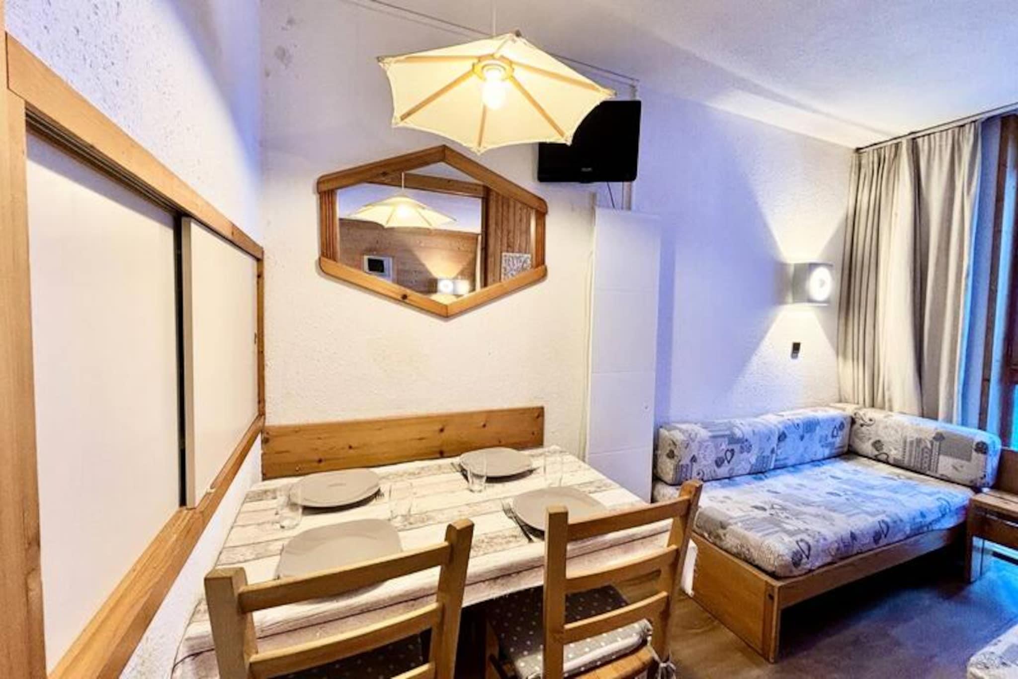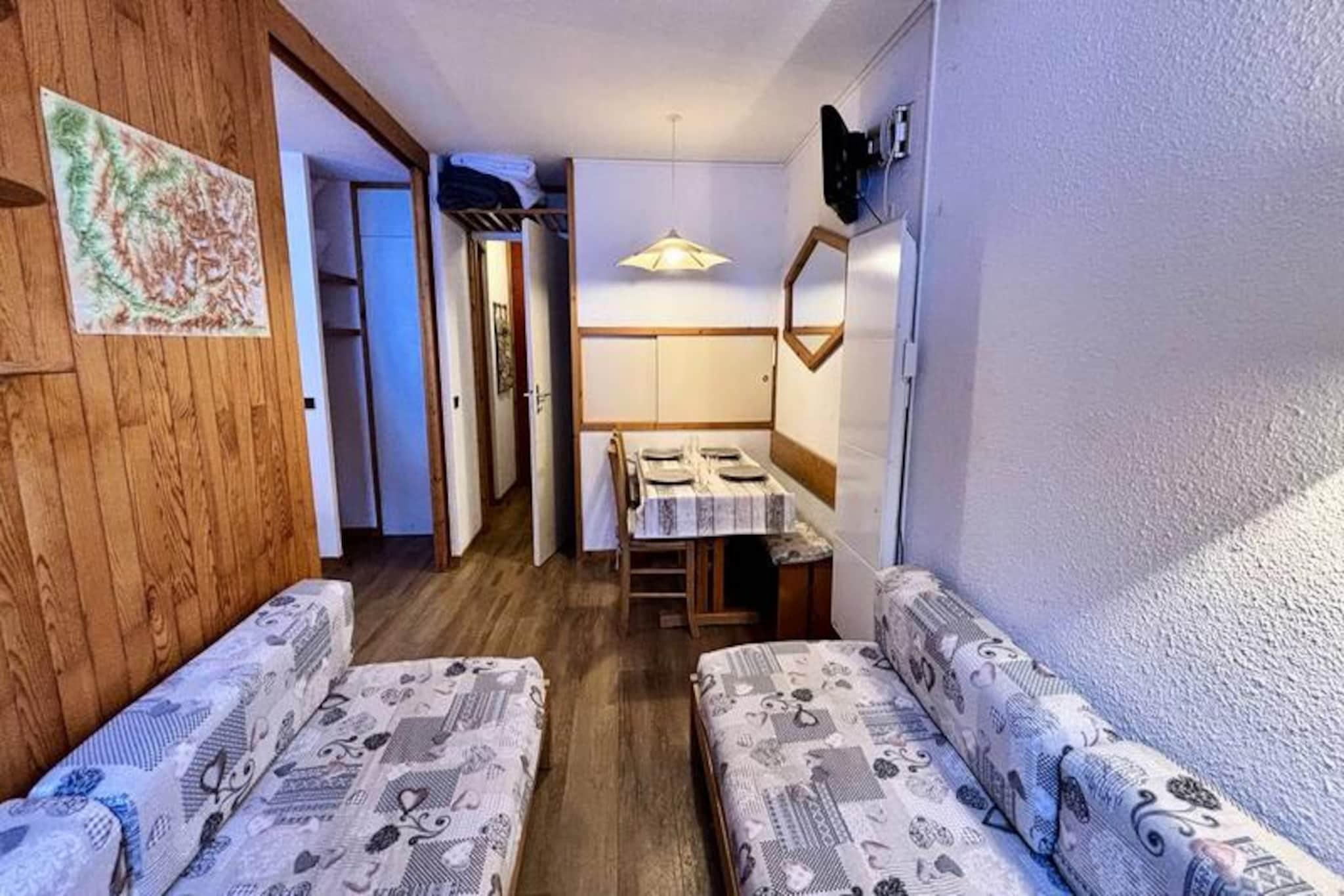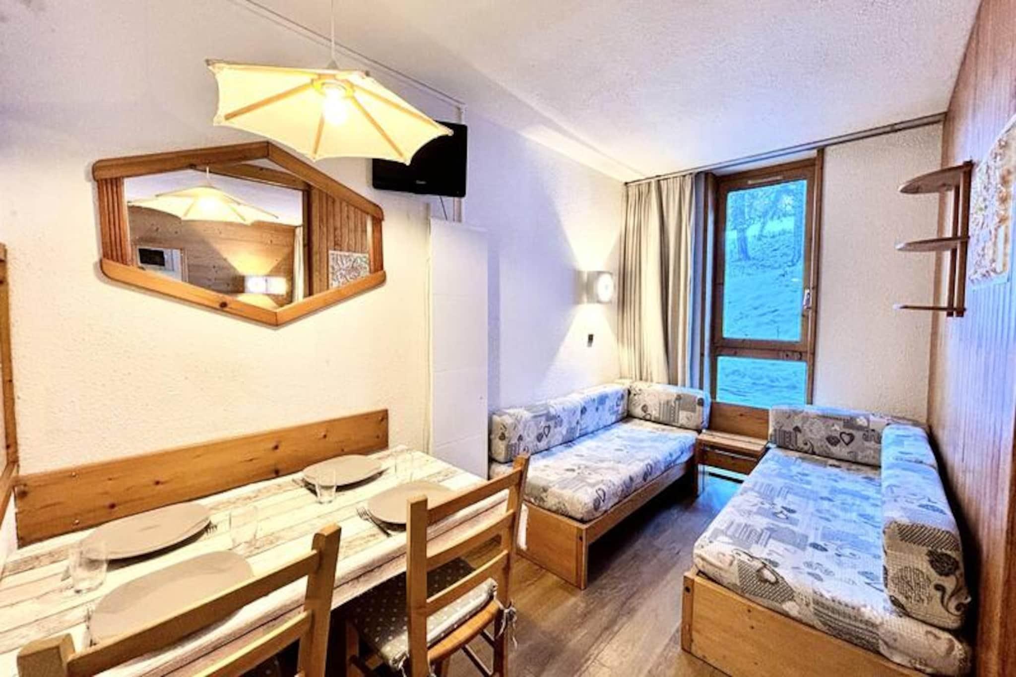 Midt i Les Coches' fredfyldte skønhed tilbyder dette charmerende 27 m² store studie et hyggeligt alpint tilflugtssted for op til fire gæster. Med sin beliggenhed i stueetagen og sydvendte terrasse med udsigt over de fortryllende grantræer er det det perfekte sted at slappe af efter en dag med bjergeventyr. Studiets smarte design inkluderer en flytbar skillevæg, der skaber et fleksibelt opholdsrum, der sikrer både komfort og privatliv under dit ophold. \n\nIndenfor finder du et veludstyret tekøkken med mikrobølgeovn, opvaskemaskine, keramiske kogeplader, køleskab, elektrisk kaffemaskine, brødrister og endda et raclette-sæt for en ægte smag af Alperne. Opholdsstuen har fire enkeltsenge og et tv, mens badeværelset og det separate toilet øger komforten. Lejligheden er røgfri, kæledyrsfri og har behagelige dyner til en god nats søvn. Der er et skiskab i boligen for nem adgang til pisterne.\n\nSelve boligen er en blanding af traditionel træ- og stenarkitektur, der er problemfrit forbundet med nærliggende bygninger for ekstra bekvemmelighed. Beliggende i hjertet af Les Coches, er du kun få skridt fra butikker, restauranter og den livlige Place du Carreau, hvor sæsonbestemte aktiviteter bringer landsbyen til live. Familier vil sætte pris på nærheden til dagplejen og ESF-skiskolen, mens parkeringskælderen sikrer problemfri ankomst.\n\nUanset om du er her for at sno dig gennem Paradiski-pisterne eller udforske sommerløjperne, tilbyder dette studie en indbydende base for din alpine flugt. Book nu og fordyb dig i charmen og eventyret i de franske alper.