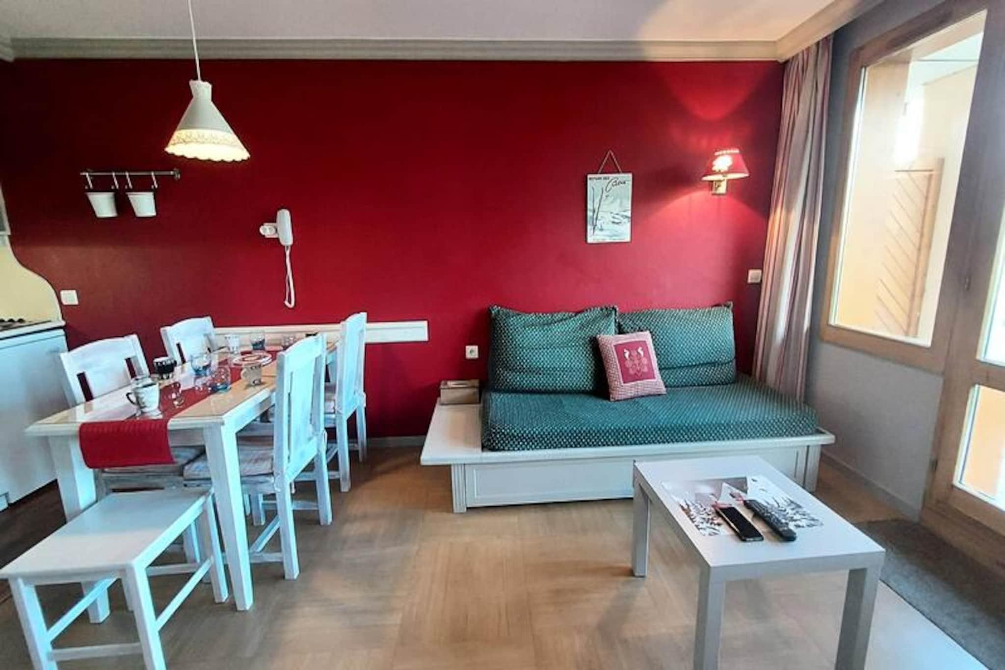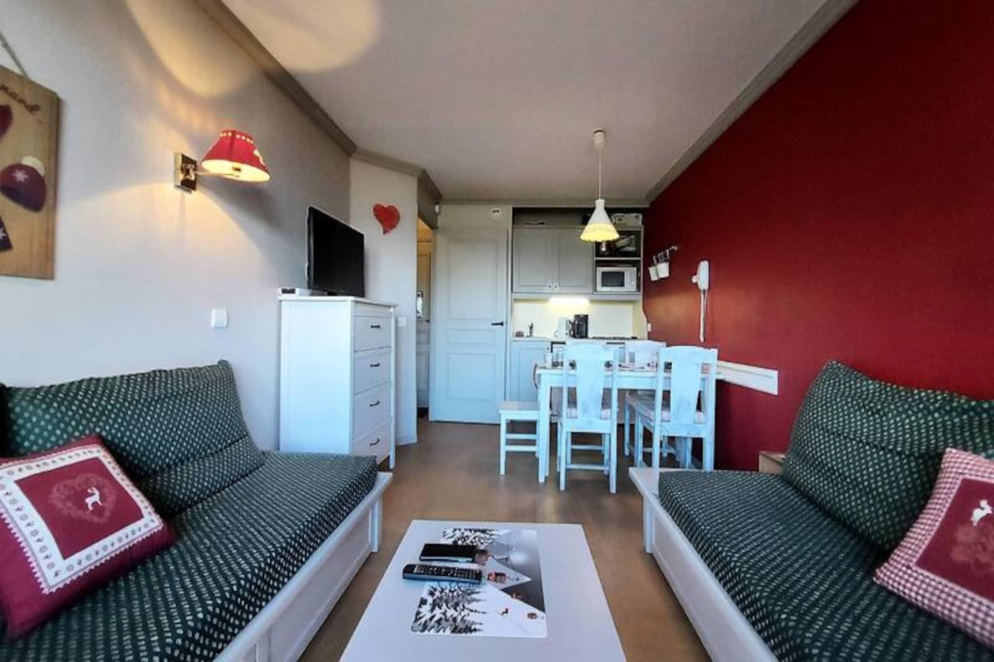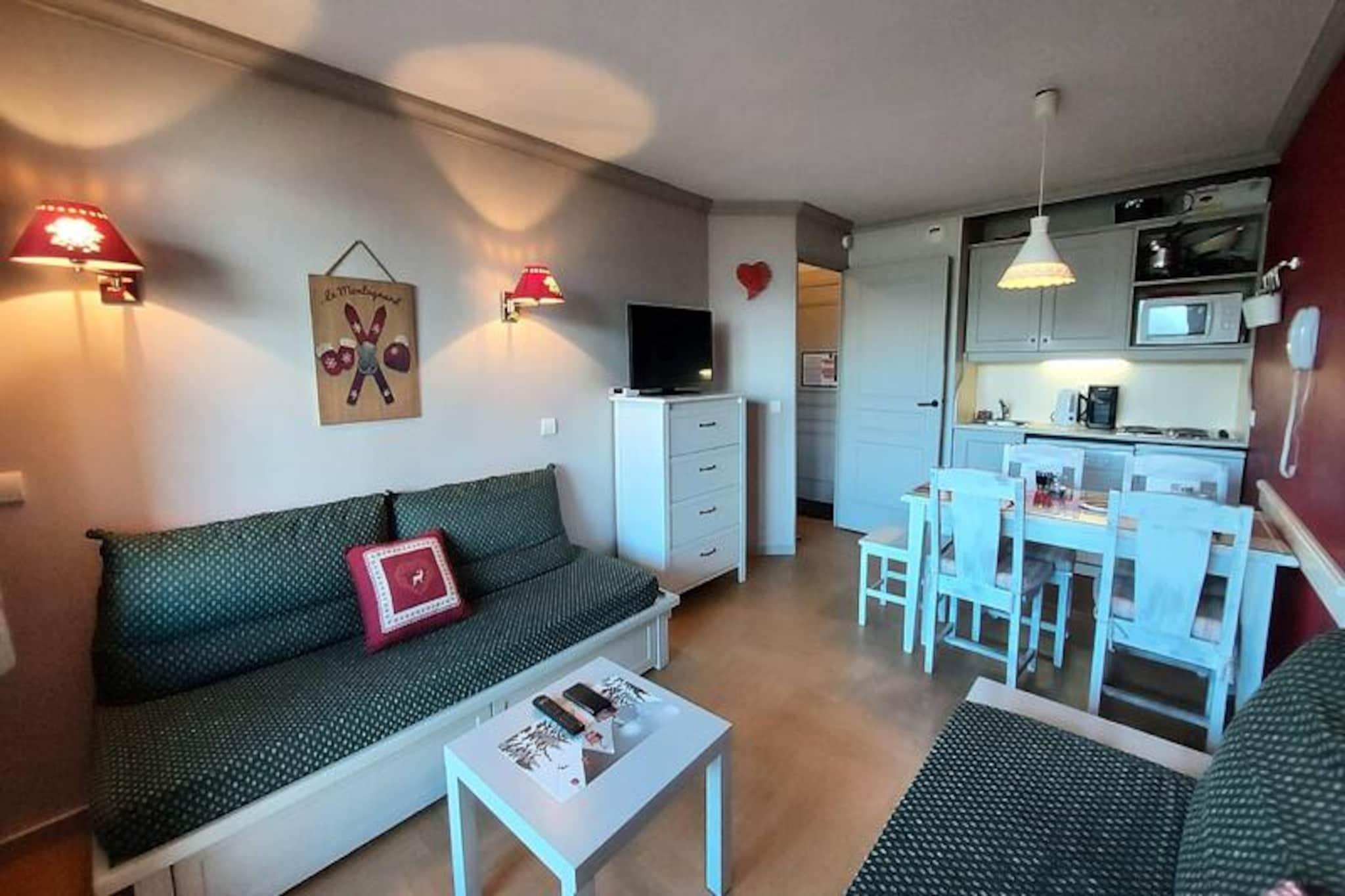 Med en betagende udsigt over Mont Blanc tilbyder denne charmerende lejlighed på 29 m² et hyggeligt tilflugtssted for op til fem gæster i hjertet af de franske alper. Beliggende i det maleriske Forêt-distrikt, kendt for sin traditionelle arkitektur af træ, sten og skifer, tilbyder boligen ski-in/ski-out adgang til det berømte Montchavin-skiområde. Uanset om du er en ivrig skiløber eller en elsker af alpin ro, lover denne ejendom en uforglemmelig bjergferie. \n\nIndvendigt er lejligheden omhyggeligt designet til komfort og bekvemmelighed. Soveværelset har en dobbeltseng og et tv, mens stuen tilbyder to enkeltsenge, en udtræksseng og endnu et tv/dvd til afslappende aftener. Det fuldt udstyrede køkken inkluderer mikrobølgeovn, opvaskemaskine, elektriske kogeplader, køleskab, Senseo-kaffemaskine og endda et raclette-sæt til at nyde lokale kulinariske lækkerier. Et separat badeværelse og toilet bidrager til den praktiske anvendelighed, mens den nordvendte terrasse inviterer dig til at nyde den friske bjergluft og den fantastiske udsigt over dalen. Wi-Fi er tilgængelig i boligen, og et skiskab sikrer, at dit udstyr altid er klar til pisterne. \n\nBeliggenheden er ideel til at udforske Paradiski-området, med et shuttle-stoppested i nærheden, der giver nem adgang til feriestedets centrum. Om vinteren forvandles området til et skiløberparadis, mens sommeren byder på muligheder for vandreture, cykling og afslapning i de fredfyldte alpine landskaber. Der er parkering i nærheden af ??ejendommen, hvilket gør det til et problemfrit valg for rejsende. \n\nUanset om du er her for at sno dig gennem pudrede pister, nyde charmen ved Montchavin eller blot slappe af i skyggen af ??Mont Blanc, tilbyder denne lejlighed den perfekte base for dine alpine eventyr. Den er røgfri og kæledyrsfri, og er et paradis af komfort og stil i en af ??Frankrigs mest fantastiske bjergregioner.