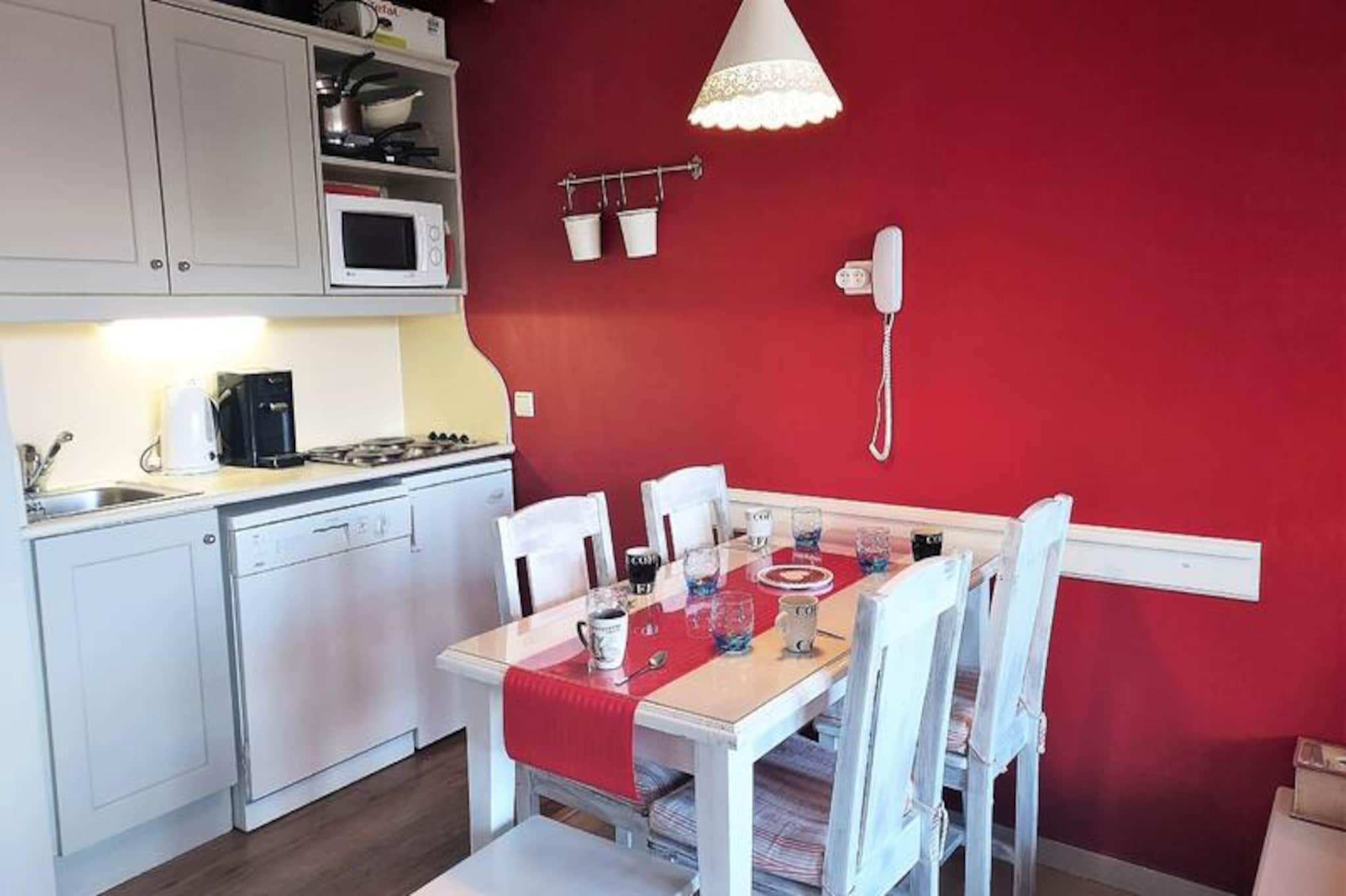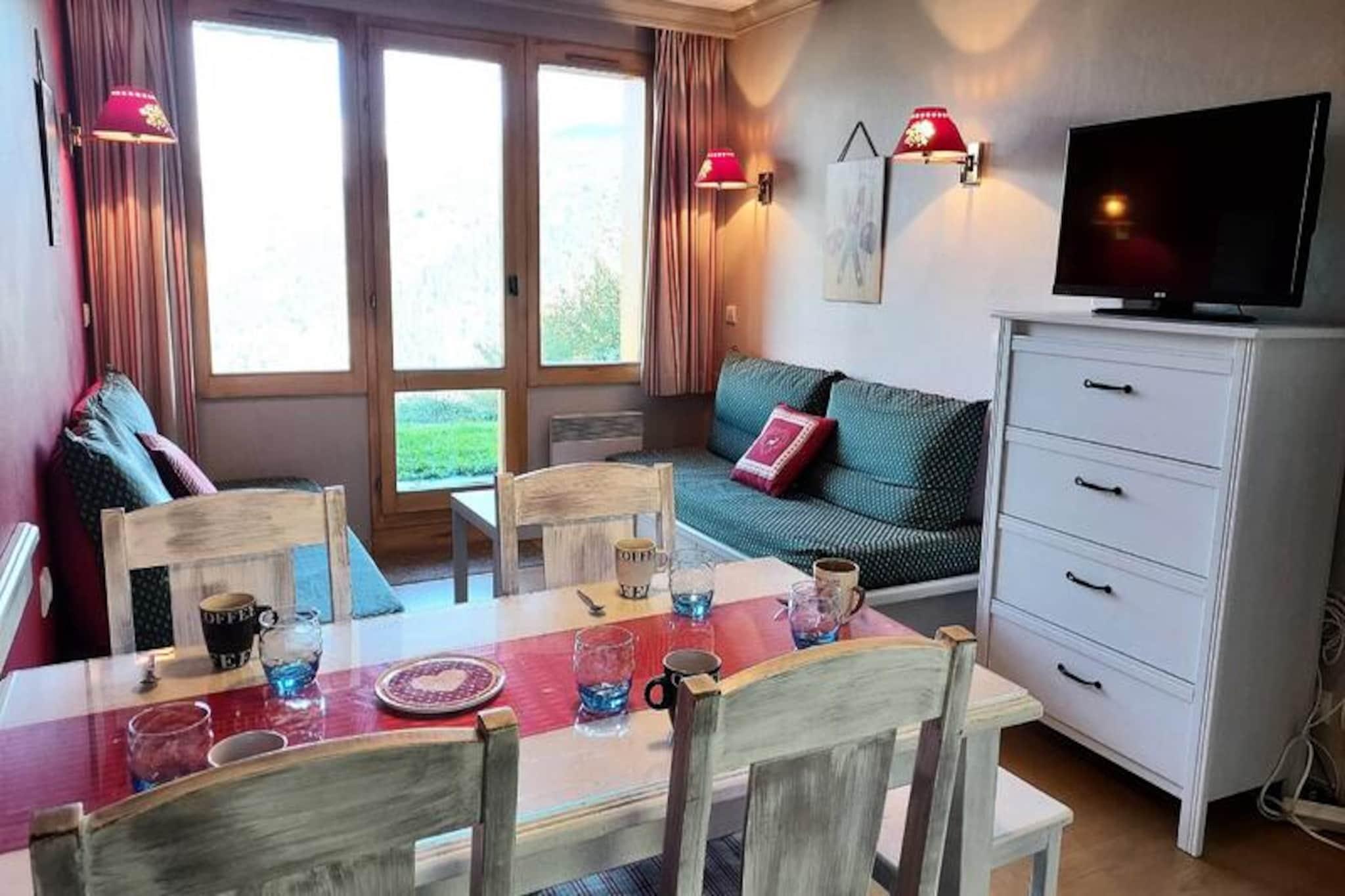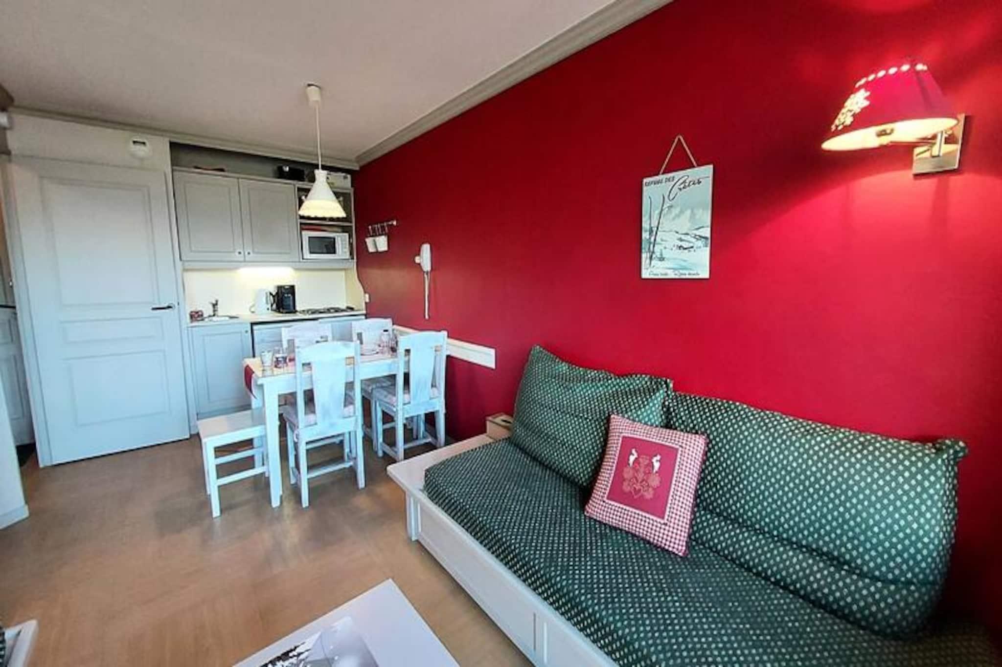 Med en betagende udsigt over Mont Blanc tilbyder denne charmerende lejlighed på 29 m² et hyggeligt tilflugtssted for op til fem gæster i hjertet af de franske alper. Beliggende i det maleriske Forêt-distrikt, kendt for sin traditionelle arkitektur af træ, sten og skifer, tilbyder boligen ski-in/ski-out adgang til det berømte Montchavin-skiområde. Uanset om du er en ivrig skiløber eller en elsker af alpin ro, lover denne ejendom en uforglemmelig bjergferie. \n\nIndvendigt er lejligheden omhyggeligt designet til komfort og bekvemmelighed. Soveværelset har en dobbeltseng og et tv, mens stuen tilbyder to enkeltsenge, en udtræksseng og endnu et tv/dvd til afslappende aftener. Det fuldt udstyrede køkken inkluderer mikrobølgeovn, opvaskemaskine, elektriske kogeplader, køleskab, Senseo-kaffemaskine og endda et raclette-sæt til at nyde lokale kulinariske lækkerier. Et separat badeværelse og toilet bidrager til den praktiske anvendelighed, mens den nordvendte terrasse inviterer dig til at nyde den friske bjergluft og den fantastiske udsigt over dalen. Wi-Fi er tilgængelig i boligen, og et skiskab sikrer, at dit udstyr altid er klar til pisterne. \n\nBeliggenheden er ideel til at udforske Paradiski-området, med et shuttle-stoppested i nærheden, der giver nem adgang til feriestedets centrum. Om vinteren forvandles området til et skiløberparadis, mens sommeren byder på muligheder for vandreture, cykling og afslapning i de fredfyldte alpine landskaber. Der er parkering i nærheden af ??ejendommen, hvilket gør det til et problemfrit valg for rejsende. \n\nUanset om du er her for at sno dig gennem pudrede pister, nyde charmen ved Montchavin eller blot slappe af i skyggen af ??Mont Blanc, tilbyder denne lejlighed den perfekte base for dine alpine eventyr. Den er røgfri og kæledyrsfri, og er et paradis af komfort og stil i en af ??Frankrigs mest fantastiske bjergregioner.