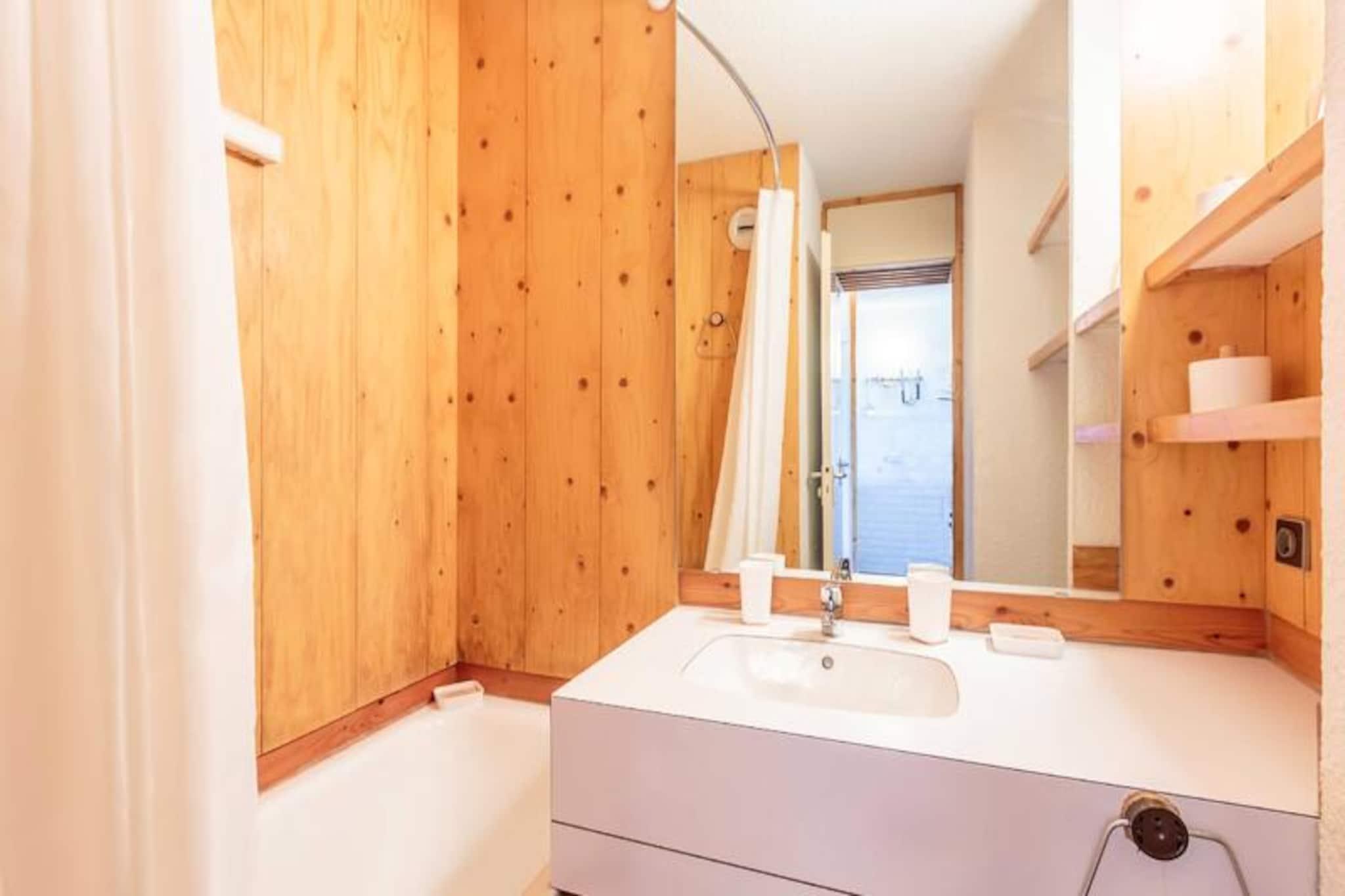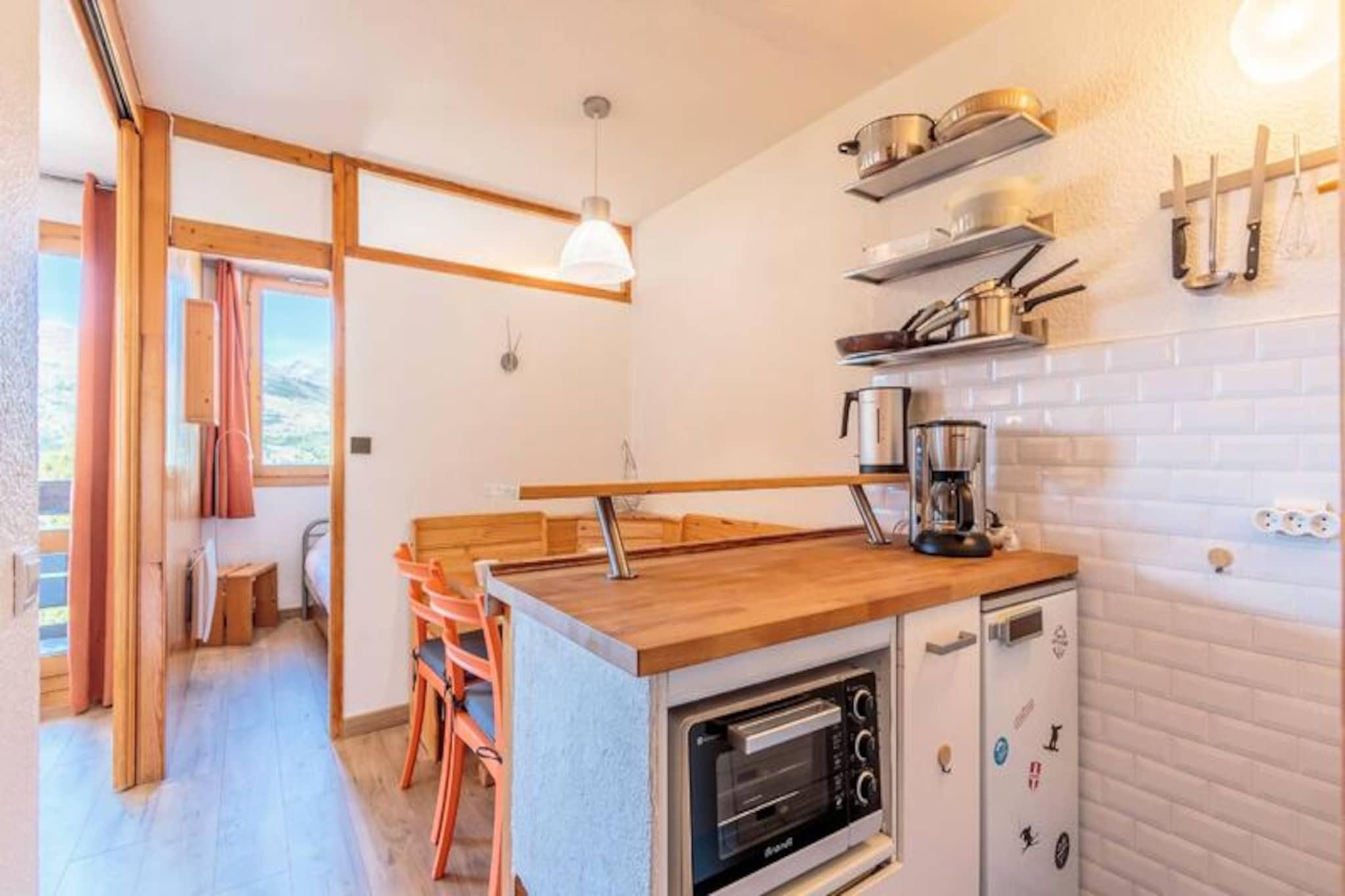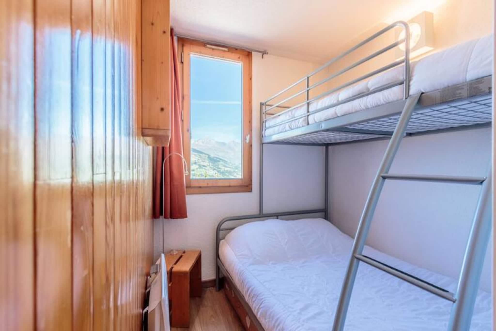 I udkanten af ??den charmerende landsby Les Coches tilbyder denne hyggelige lejlighed et dejligt alpint tilflugtssted med en fantastisk udsigt over Mont Blanc fra den nordvendte balkon. Perfekt beliggende i hjertet af feriestedet giver den nem adgang til pisterne og den pulserende Place des Commerces, hvor lokale butikker, restauranter og aktiviteter skaber en livlig atmosfære for besøgende året rundt. Uanset om du søger spændende skieventyr eller rolige bjergture, sætter denne ejendom scenen for uforglemmelige øjeblikke i de franske alper. \n\nLejligheden, der ligger på anden sal i en stor bolig, er omhyggeligt designet til at rumme op til fire gæster. Den har et komfortabelt soveværelse med køjesenge, en stue med sovesofa, tv og radio samt et veludstyret køkkenområde med ovn, opvaskemaskine, mikrobølgeovn, keramiske kogeplader, køleskab og essentielle apparater som kaffemaskine og brødrister. Et separat badeværelse og toilet sikrer bekvemmelighed, mens skiboksen i bygningen tilføjer praktiske fordele for vintersportsentusiaster. Boligen tilbyder også underjordisk parkering, som kan reserveres på forhånd for ekstra bekvemmelighed. Les Coches er en perle i Paradiski-området, der tilbyder direkte adgang til skiløjper i verdensklasse og en række aktiviteter for alle aldre. ESF-skiskolen og daginstitutionen ligger kun få skridt væk, hvilket gør det til et ideelt valg for familier. Om sommeren forvandles området til et paradis for vandrere og cyklister med stier, der fører til betagende panoramaer og fredfyldte alpine enge. Den pulserende Place du Carreau er vært for arrangementer og aktiviteter, der bringer lokalsamfundet sammen og sikrer underholdning og afslapning under hele dit ophold. Uanset om du er tiltrukket af spændingen ved skiløb eller roen i bjerglandskaber, kombinerer denne lejlighed komfort, bekvemmelighed og charme, hvilket gør den til den perfekte base for dine alpine eventyr.