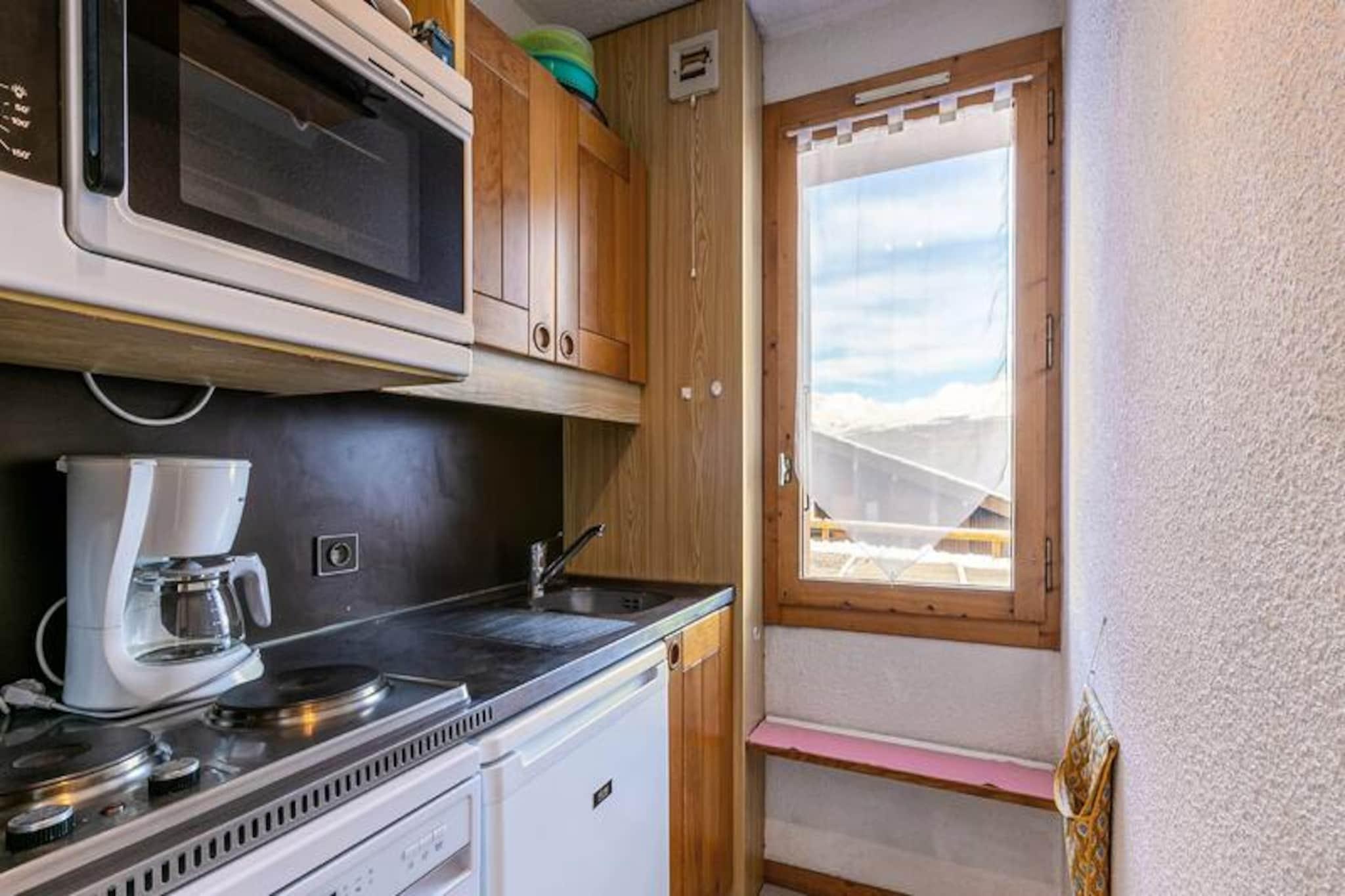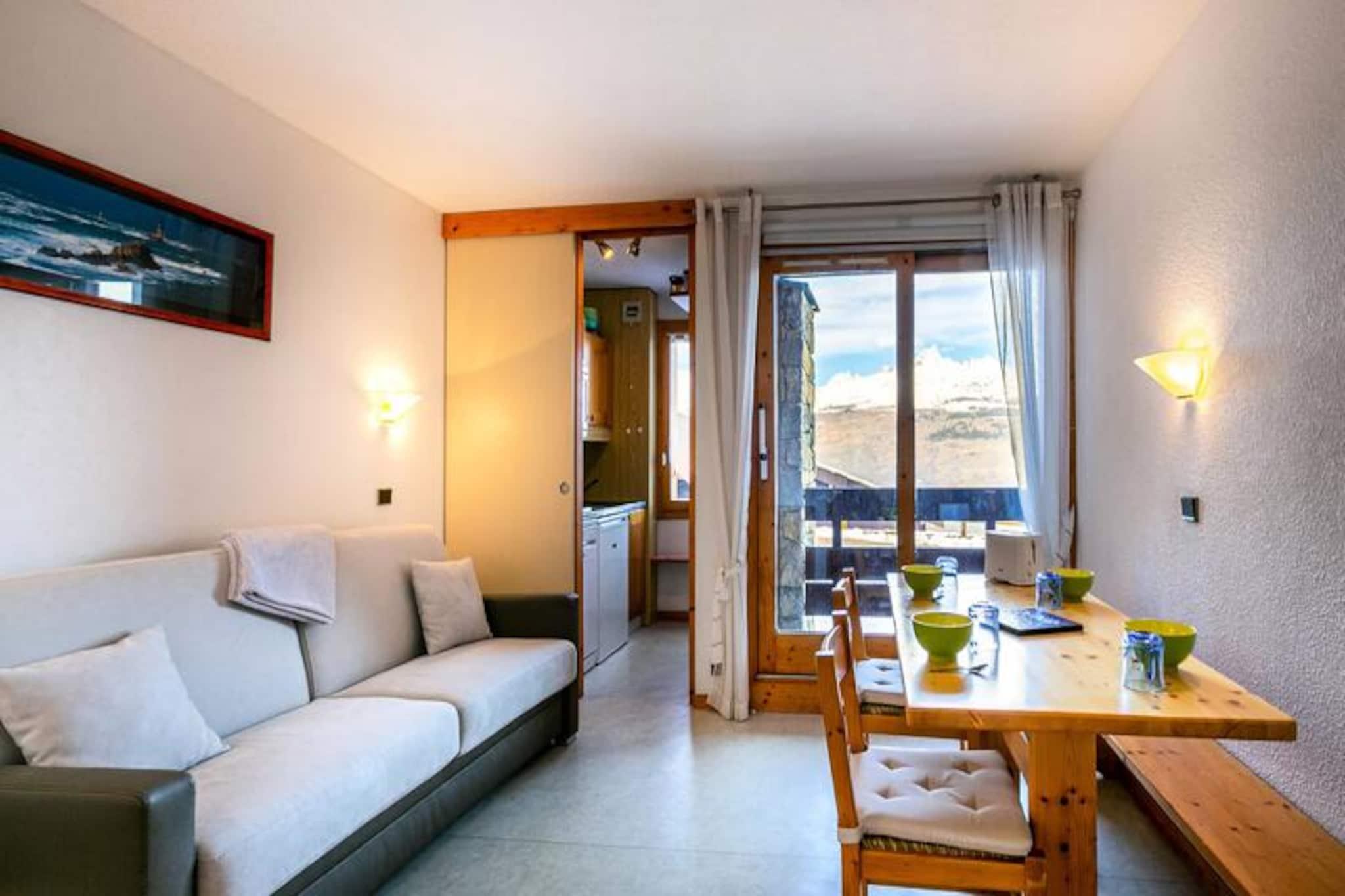 Forestil dig at vågne op til det betagende syn af Mont Blanc fra din private balkon, hvor den friske alpeluft sætter tonen for en dag med eventyr. Denne charmerende lejlighed på 26 m², beliggende i det rolige Observatoire-distrikt i Les Coches, tilbyder et indbydende tilflugtssted for op til fire gæster. Med sin hyggelige atmosfære og gennemtænkte faciliteter er det den perfekte base for at udforske de franske alpers skønhed. Lejligheden har et komfortabelt soveværelse med køjesenge og en stue udstyret med sovesofa, tv og radio. Det separate tekøkken er fuldt udstyret med mikrobølgeovn, opvaskemaskine, elektriske kogeplader og endda et raclette-sæt til en ægte alpin spiseoplevelse. Et moderne brusebad og separat toilet bidrager til bekvemmeligheden, mens den nordvendte balkon tilbyder en fantastisk udsigt over dalen og Mont Blanc. Skientusiaster vil sætte pris på skiboksen i bygningen og nærheden til pisterne, kun 100 meter væk. L'Équerre ligger mindre end 300 meter fra butikkerne og feriestedets centrum og kombinerer ro med tilgængelighed. Gågaden gør det nemt at nå Les Coches' livlige centrum på under fem minutter, mens de fredelige omgivelser sikrer et afslappende ophold. Der er offentlig parkering lige foran boligen, hvilket øger bekvemmeligheden. Uanset om du er her for skiløb i verdensklasse, naturskønne vandrestier eller blot for at nyde den alpine charme, tilbyder denne lejlighed alt, hvad du behøver for en uforglemmelig ferie. Med Mont Blanc som baggrund og pisterne lige uden for døren er hvert øjeblik her et minde i sin vorden.