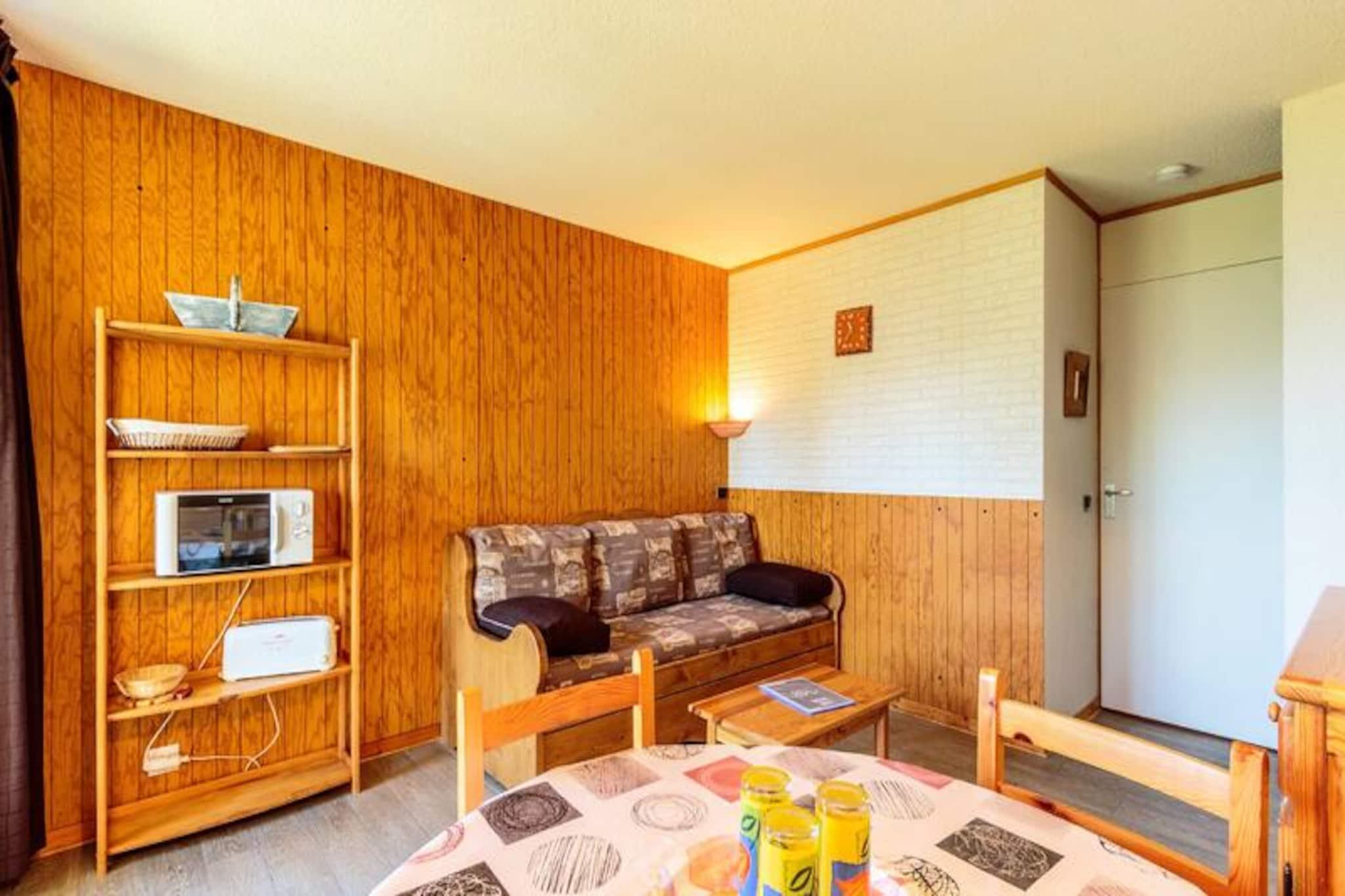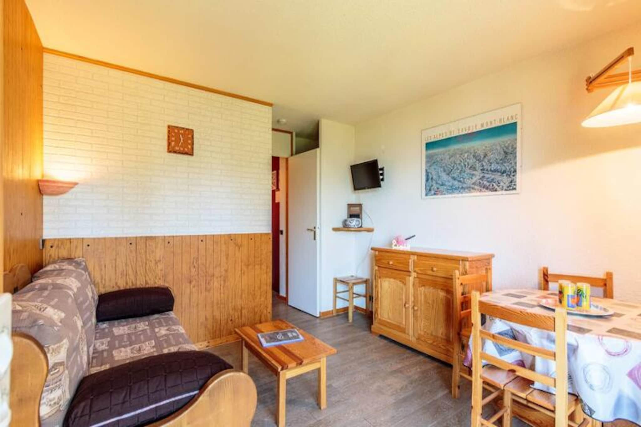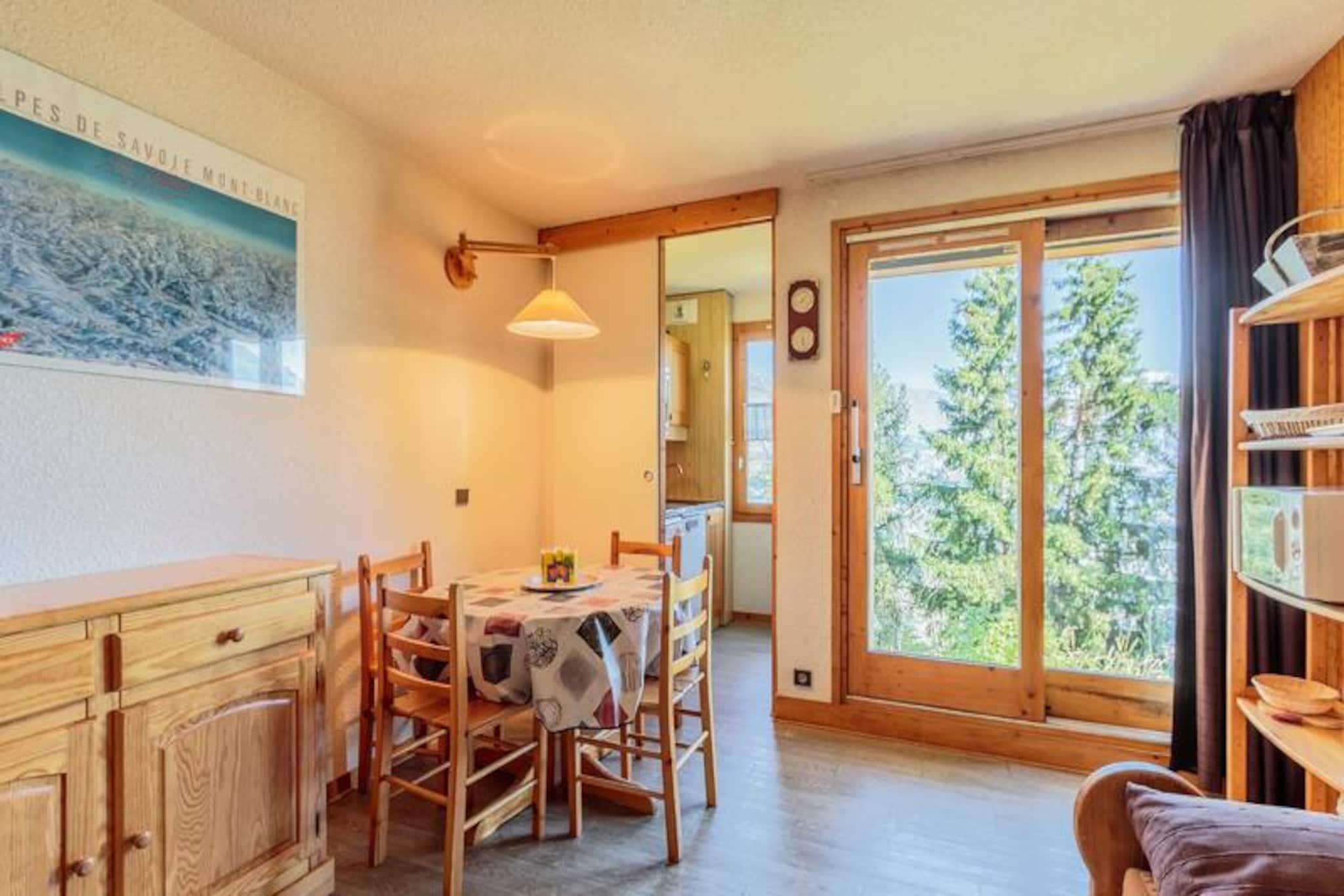 Med sin hyggelige charme og betagende udsigt er denne 23 m² store studiohytte det perfekte alpine tilflugtssted for op til tre gæster. Beliggende i stueetagen i det fredelige Observatoire-distrikt i Les Coches, tilbyder denne ejendom en rolig oase med nem adgang til pisterne og resortets faciliteter. Forestil dig at vågne op til den friske bjergluft og træde ud på din private nordvendte terrasse, hvor panoramaudsigt over dalen og det ikoniske Mont Blanc skaber en postkort-perfekt baggrund for din ferie. \n\nIndenfor er studioet omhyggeligt designet til at maksimere komfort og funktionalitet. Hytteområdet har køjesenge, mens stuen har en enkeltseng, et tv og en radio til hyggelige aftener derhjemme. Det veludstyrede køkken inviterer dig til at tilberede solide bjergmåltider, komplet med ovn, mikrobølgeovn, opvaskemaskine og endda et raclette- og fondue-sæt til autentiske alpine spiseoplevelser. Et moderne brusebad med toilet sikrer bekvemmelighed, mens lejligheden er udstyret med tæpper til at holde dig varm efter en dag på pisterne. Bemærk venligst, at dette er en ikke-ryger ejendom, og kæledyr er velkomne mod et mindre tillægsgebyr.\n\nLa Pendule ligger kun 100 meter fra skiløjperne og 250 meter fra feriestedets centrum og tilbyder uovertruffen bekvemmelighed. Offentlig parkering er i nærheden, og gåstien sikrer nem adgang til butikker, restauranter og afterski-aktiviteter. Observatoire-distriktet er kendt for sin ro og fantastiske udsigter, hvilket gør det til en favorit blandt besøgende, der søger både afslapning og eventyr.\n\nUanset om du er her for at grave dig gennem uberørt sne eller udforske de livlige sommerstier, placerer denne charmerende studiohytte dig i hjertet af begivenhederne, samtidig med at den tilbyder et fredeligt fristed at slappe af i. Lad Mont Blancs charme og Tarentaise-dalens skønhed gøre din alpine ferie virkelig uforglemmelig.