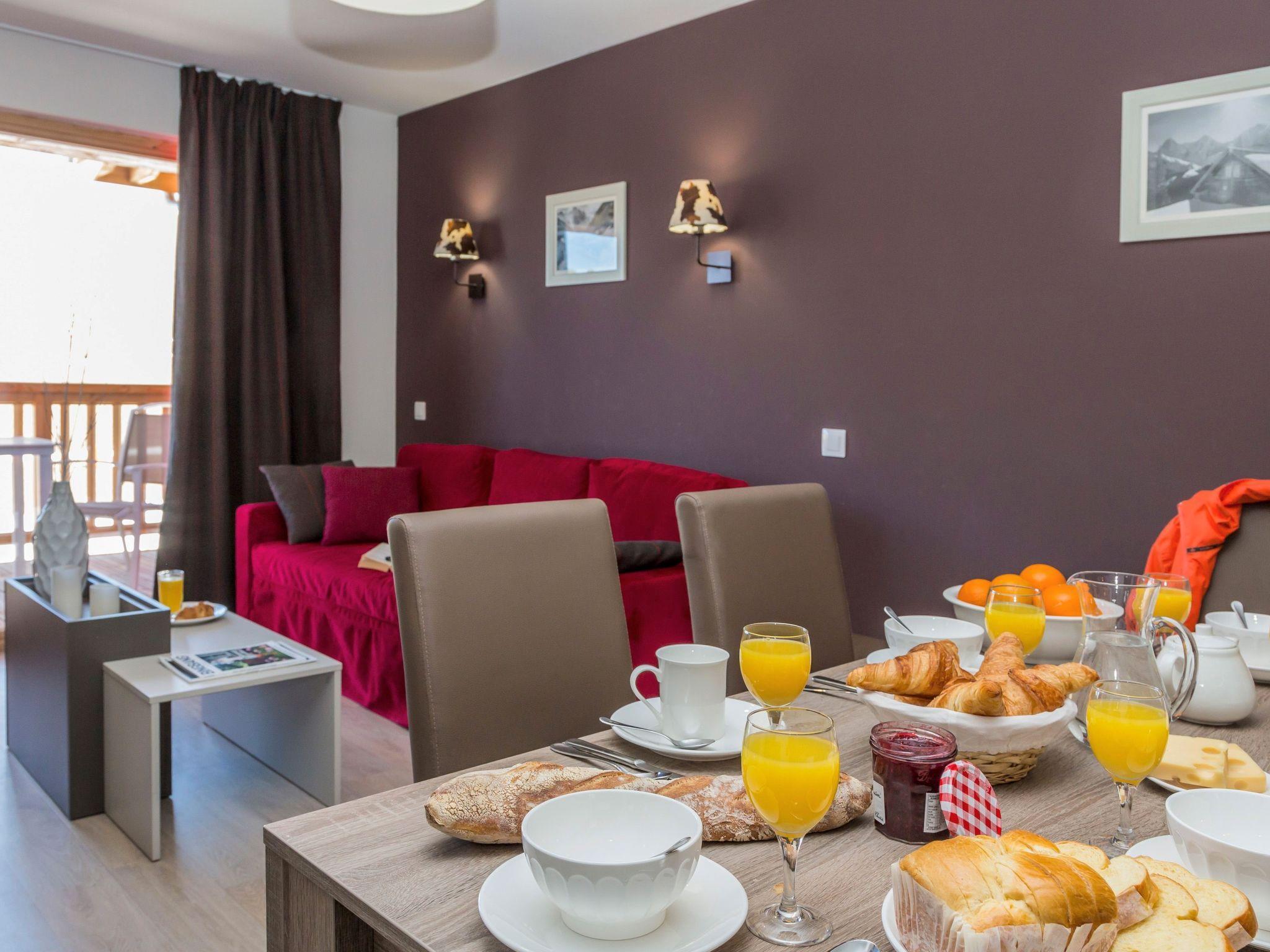 "Odalys Référence Front de Neige", 2-room apartment 32 m2. Modern and tasteful furnishings: living/sleeping room with 1 pull-out bed (2 pers.), dining table and satellite TV. 1 room with 2 sleeping facilities. Small, open kitchen (dishwasher, 4 ceramic glass hob hotplates, toaster, kettle, microwave, electric coffee machine). Sep. WC, bath or shower. Electric heating. Balcony or terrace. Beautiful view of the mountains. Facilities: hair dryer. Internet (WiFi, free). Maximum 1 pet/ dog allowed.