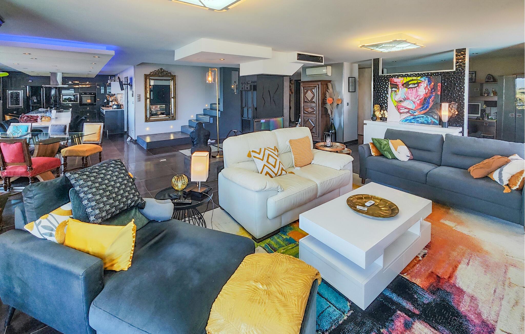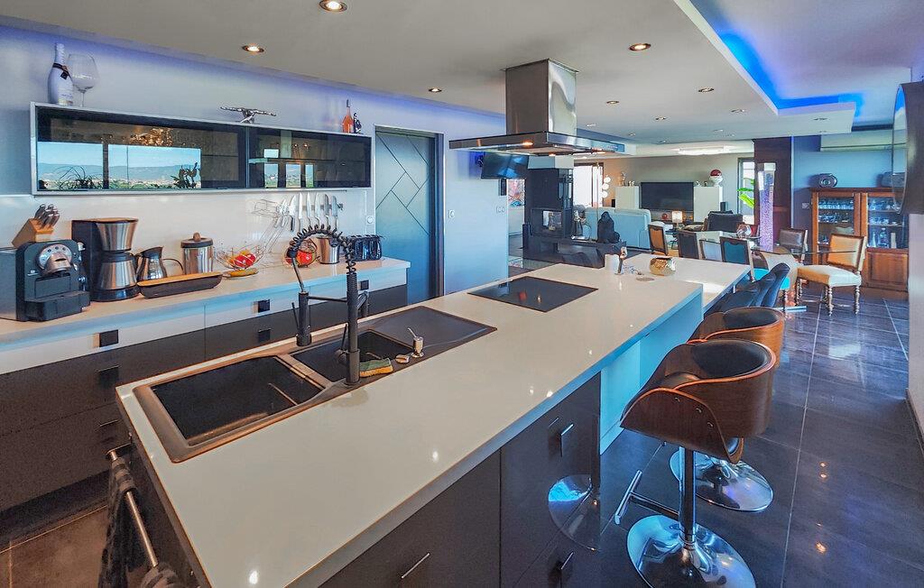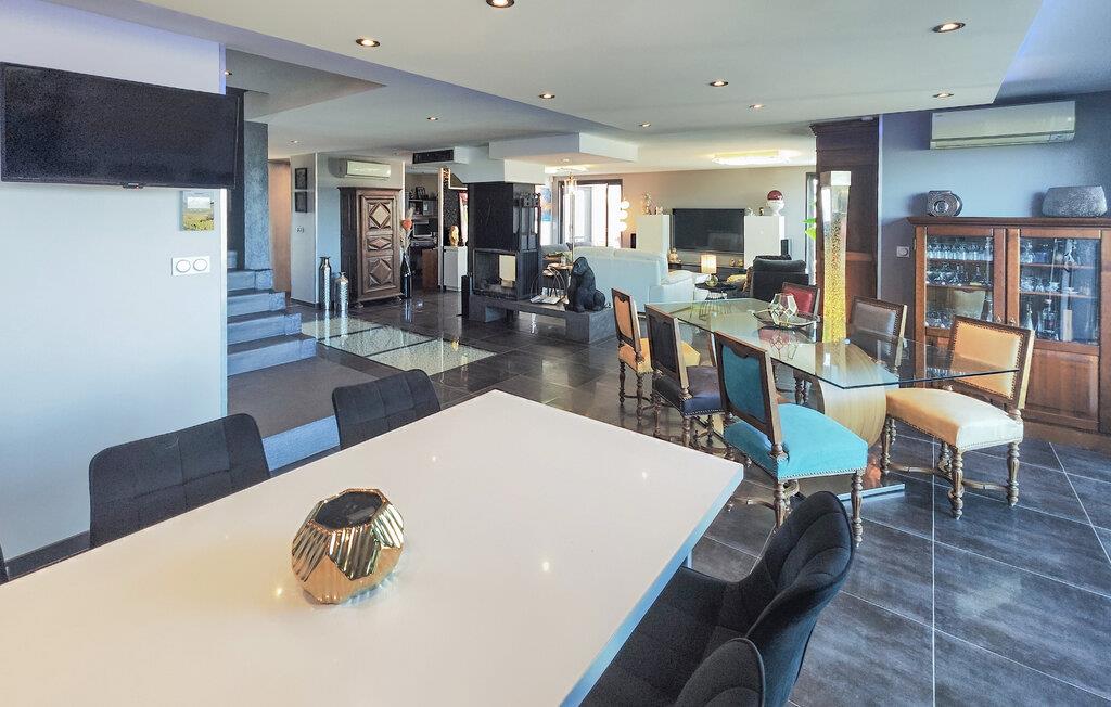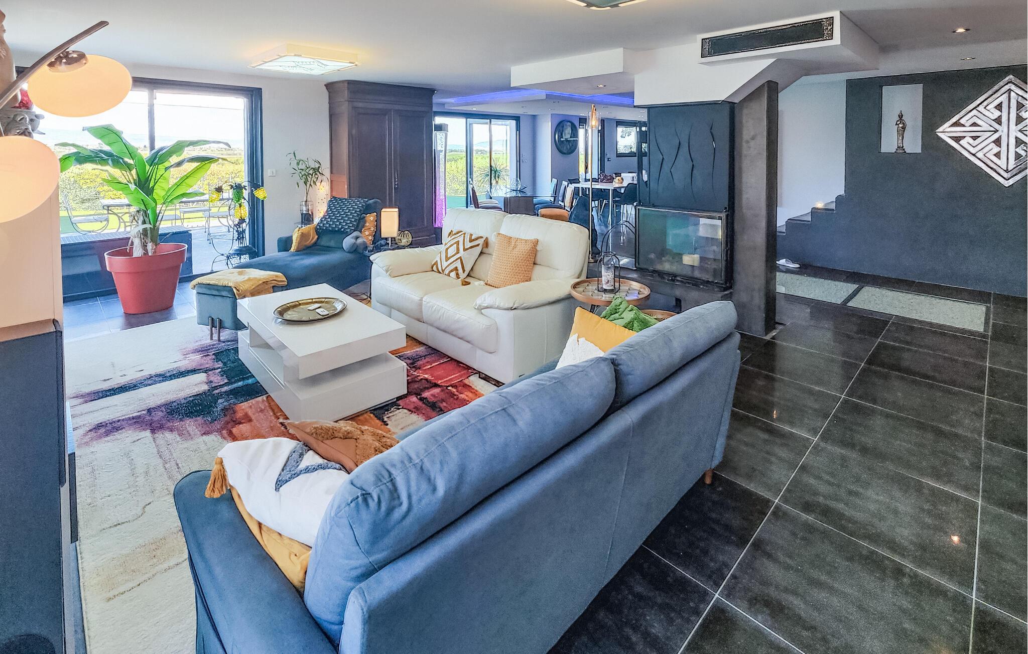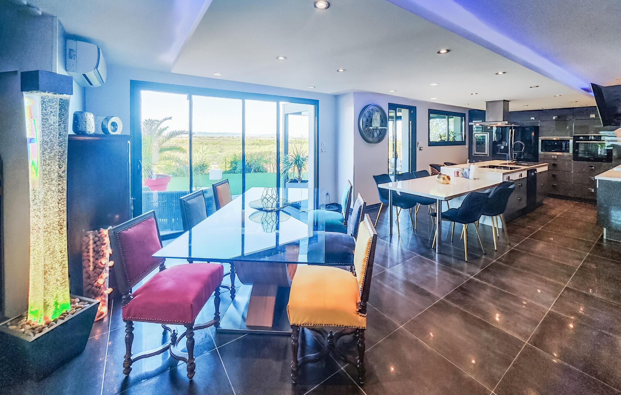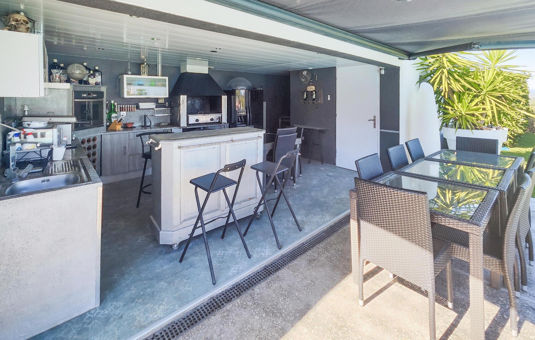 Velkommen til dette rummelige feriehus, som vil forkæle jer med elegant, smagfuldt møbleret interiør og adskillige ekstrafunktioner under en solrig ferie med familien. Glæd jer til hyggelige madlavningsaftener i det moderne køkken, hold jer i form på motionscyklen, stream en spændende serie i den behagelige sofa, eller fordyb jer i jeres ferielæsning i et af de mange indbydende retræter i huset.