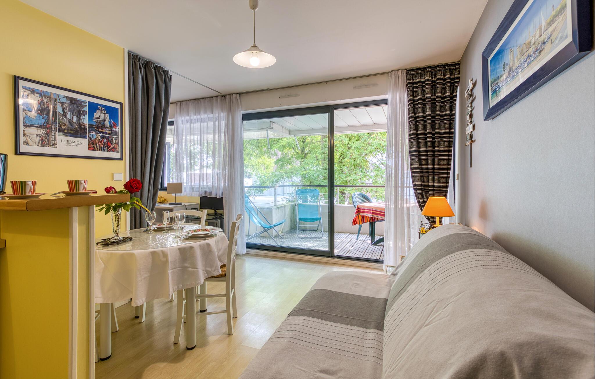Oplev afslappende dage i denne hyggelige etværelseslejlighed med rummelig balkon. Den muntre, praktiske indretning skaber en atmosfære, mens I kan nyde storbyfølelsen på altanen. Nærheden til den gamle havn og den historiske gamle bydel gør denne bolig til det perfekte udgangspunkt for jeres opdagelsesture i La Rochelle. Begynd dagene med en kop kaffe i morgensolen, inden I udforsker kysten til fods eller på cykel.