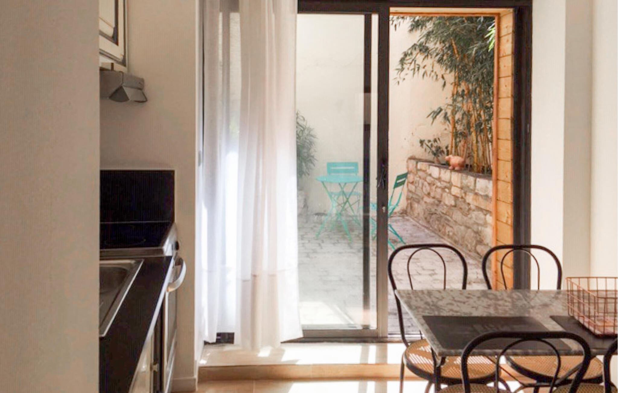 Åbn terrassedøren, og tag plads i den lille siddegruppe. Lad dagen slutte her med et glas vin. Nyd den rolige atmosfære i det beplantede hjørne med store plantekrukker, som giver gården sin særlige charme. Find ro væk fra mylderet, og slap uforstyrret af i det fri.