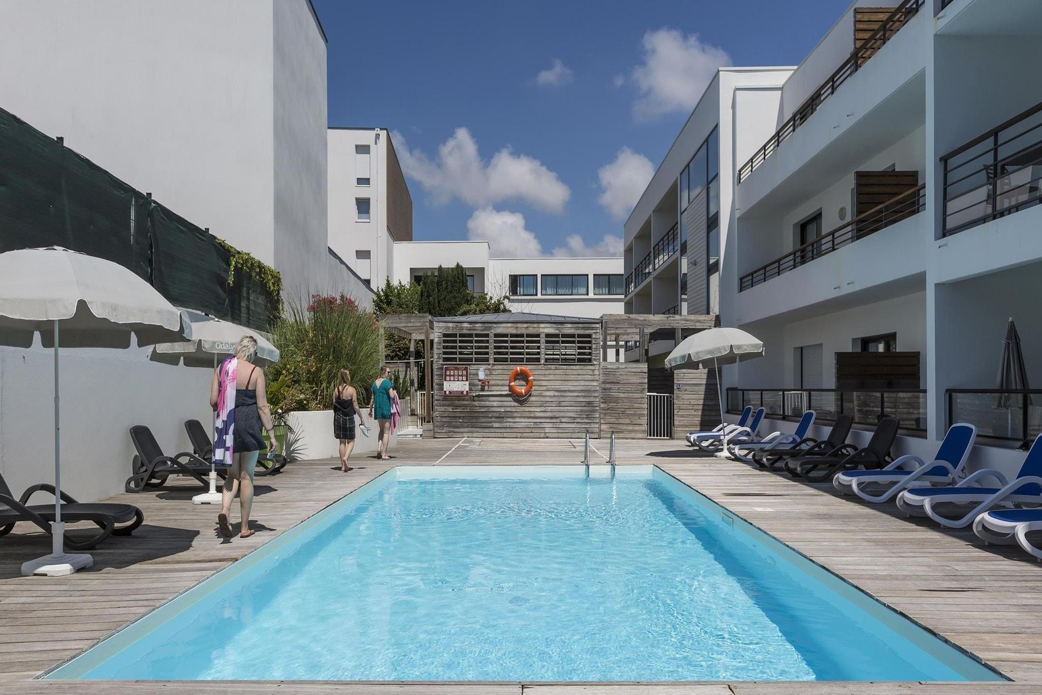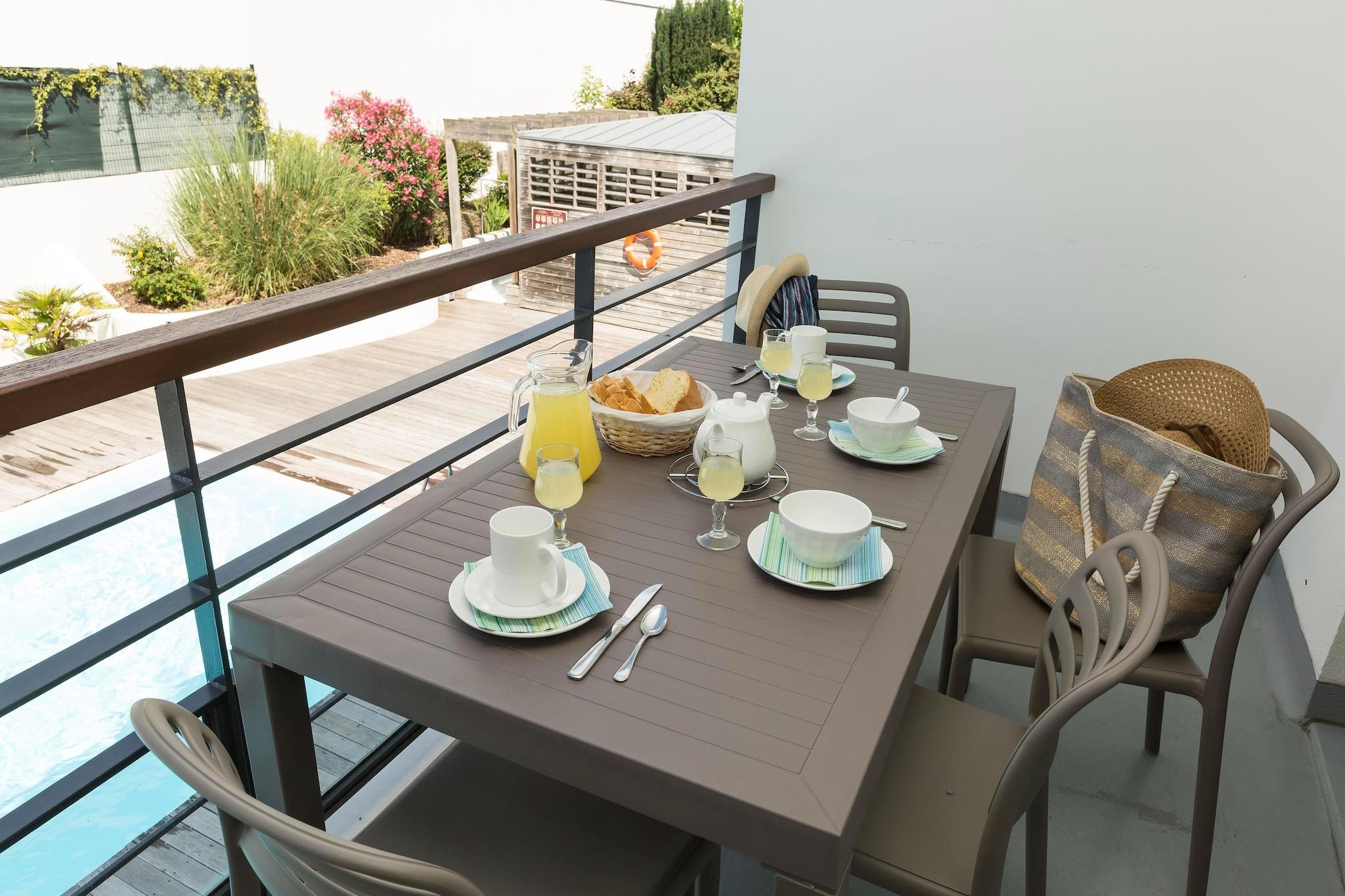 Oplev denne lyse lejlighed i stueetagen i den stilfulde hvide Résidence l'Archipel, perfekt egnet til en afslappende kystferie. Det er pænt møbleret og byder på en rummelig stue med to enkeltsovesofaer og et tv samt et fuldt udstyret tekøkken med opvaskemaskine til nem madlavning. Med to soveværelser - det ene med en dobbeltseng og det andet med enten to enkeltsenge eller en dobbeltseng - og et badeværelse med badekar med bruser, blander dette hjem komfort og funktionalitet. Træd udenfor til en balkon eller terrasse med havemøbler, og nyd bekvemmeligheden ved en reserveret parkeringsplads. Blot 15 minutters gang fra sandstranden og 1,4 km fra La Rochelles ikoniske gamle havn placerer denne lejlighed dig tæt på det bedste ved Atlanterhavskysten. Kæledyr er hjerteligt velkomne her - udforsk de mange hundevenlige parker, naturskønne vandrestier og nærliggende grønne områder, perfekt til gåture og leg med dine lodne ledsagere. Efter en dag udendørs kan du slappe af i den fælles opvarmede pool, der er åben fra april til september, en sand oase for gæster. Nyd det lokale køkken på nærliggende caféer og bistroer, der byder kæledyr velkommen på deres terrasser. Nyd frisk fisk og skaldyr, regionale specialiteter og lækre kager, mens dine kæledyr slapper af ved din side. Tag aftenture gennem den charmerende havn eller slap af ved hundevenlige strande og parker, hvilket gør dit ophold til en dejlig blanding af kultur, komfort og kæledyrsvenlig sjov.