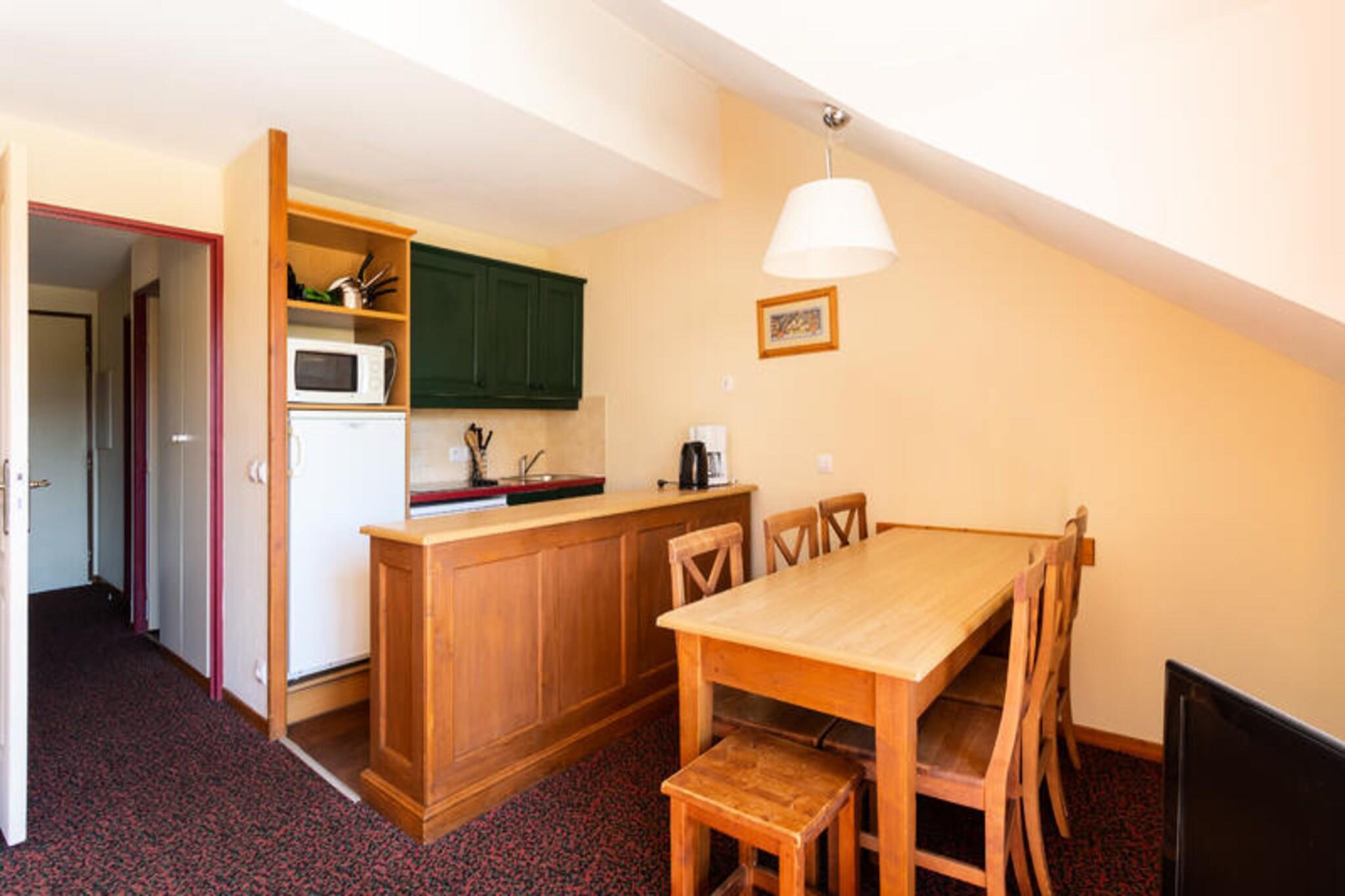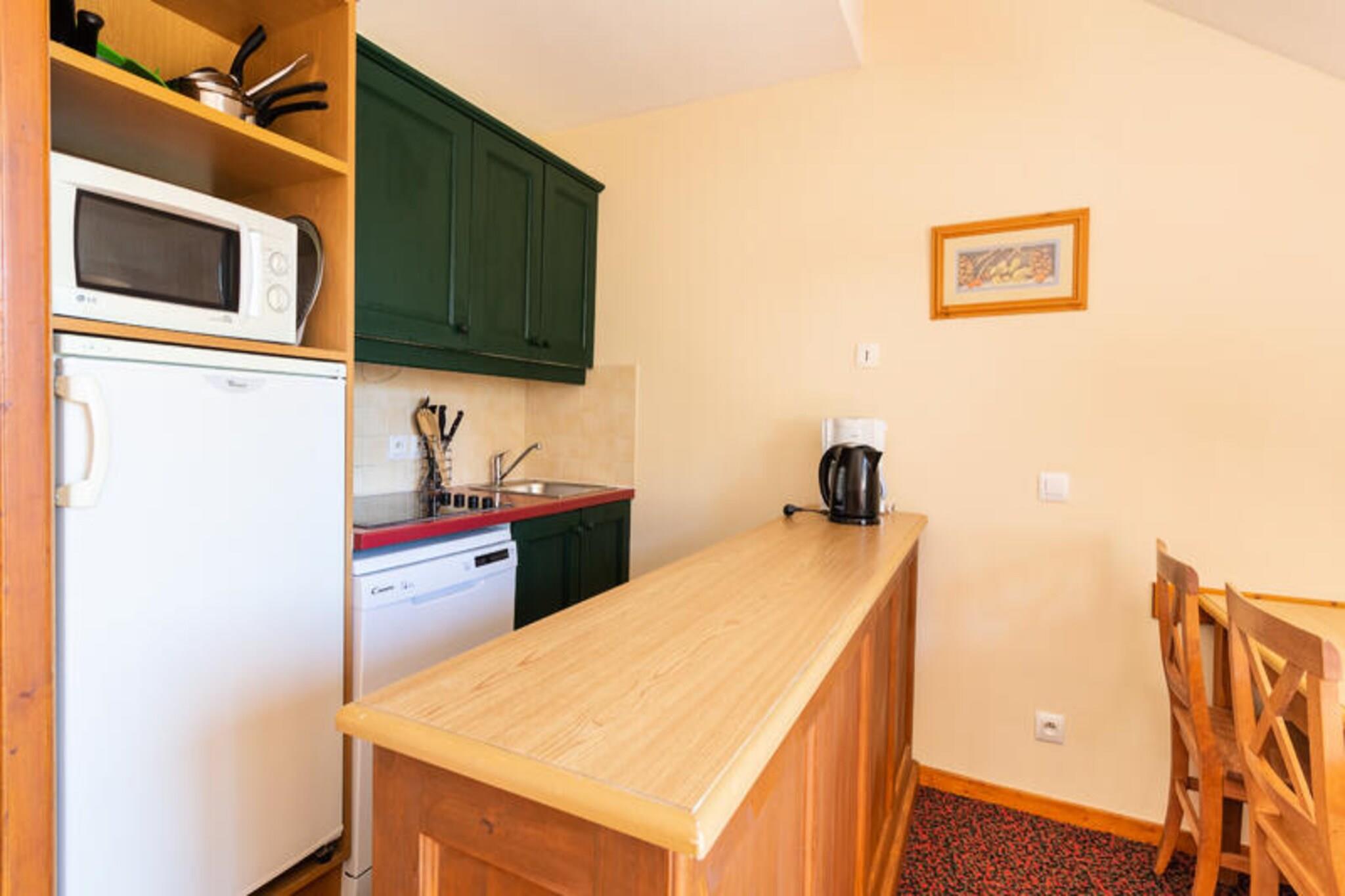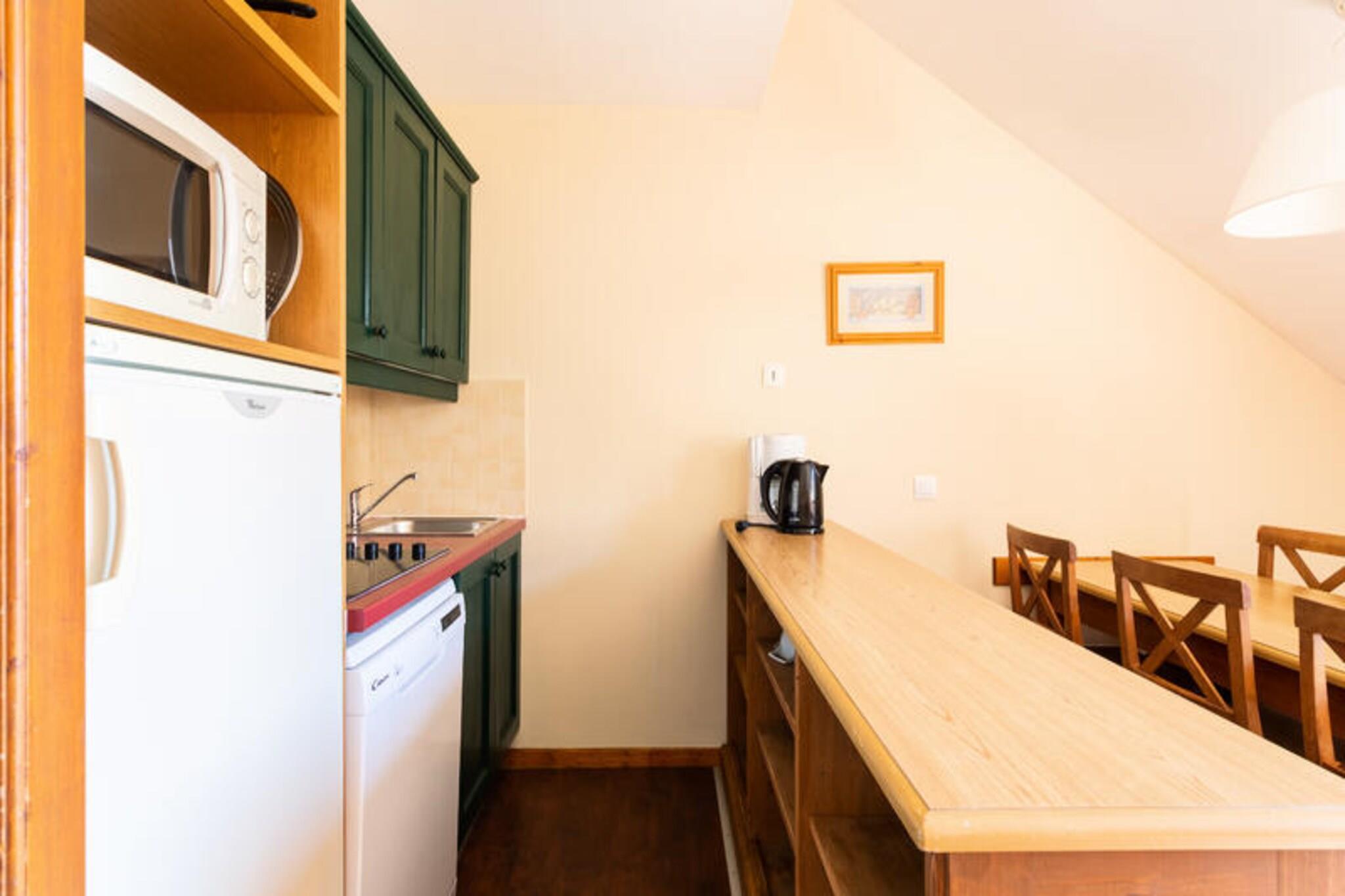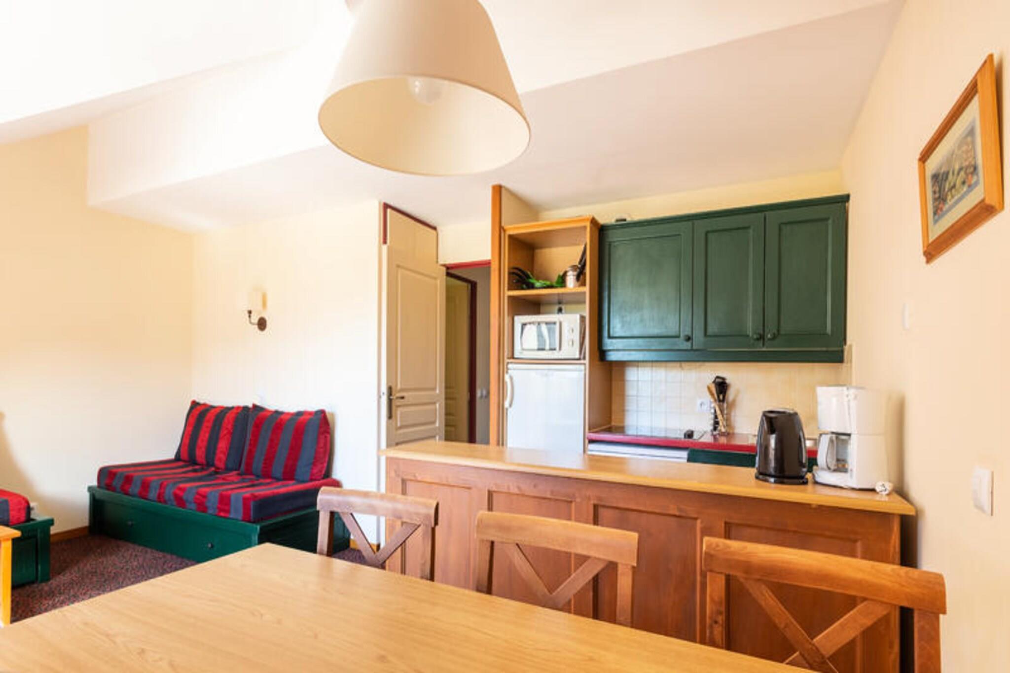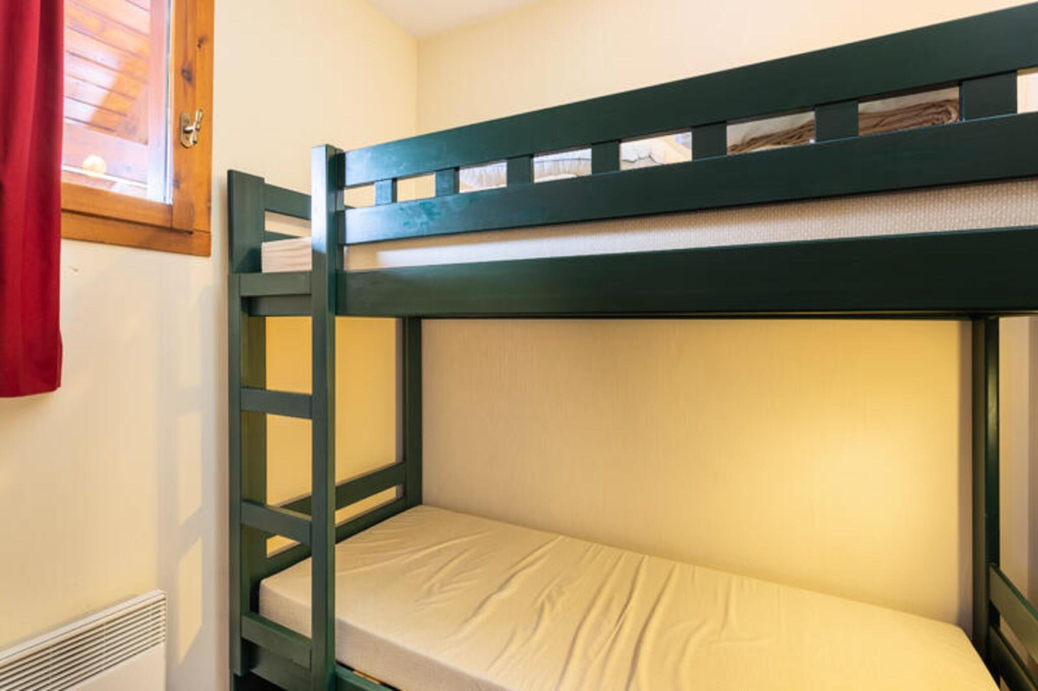 This cozy apartment offers a comfortable stay for up to four people, with one bedroom featuring a double bed and a cabin area with two single bunk beds. The living room includes two single sofa beds, one with a trundle bed, ensuring ample sleeping space. The apartment is pet-friendly with an additional charge, allowing you to bring your furry companions. Guests can enjoy the convenience of free Wi-Fi, while linens and towels are available upon request for an extra fee. A separate toilet and two bathrooms provide added comfort for your stay. Located in the heart of Serre-Chevalier 1400, this apartment places you within walking distance of shops, restaurants, bars, and various other amenities at the Pré Long shopping center. The nearby Tourist Office offers valuable information about the region’s hiking trails and activities. For outdoor enthusiasts, the resort's activities are just steps away, and you’ll also find the municipal swimming pool close by. The free shuttle service and a bus stop at the foot of the residence make it easy to explore the area, including skiing and other mountain activities. The apartment includes a fully equipped American-style kitchen, ideal for preparing your meals. The spacious living area features a dining table and comfortable seating. You can unwind on the balcony, which boasts stunning mountain views to the east. The apartment offers a cozy and well-maintained space with essential amenities like a washing machine. Enjoy the nearby outdoor parking and relax at the municipal swimming pool or take advantage of the nearby sauna, available for a fee.