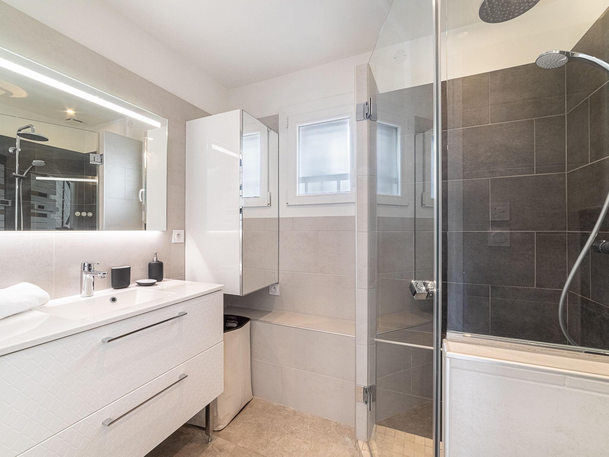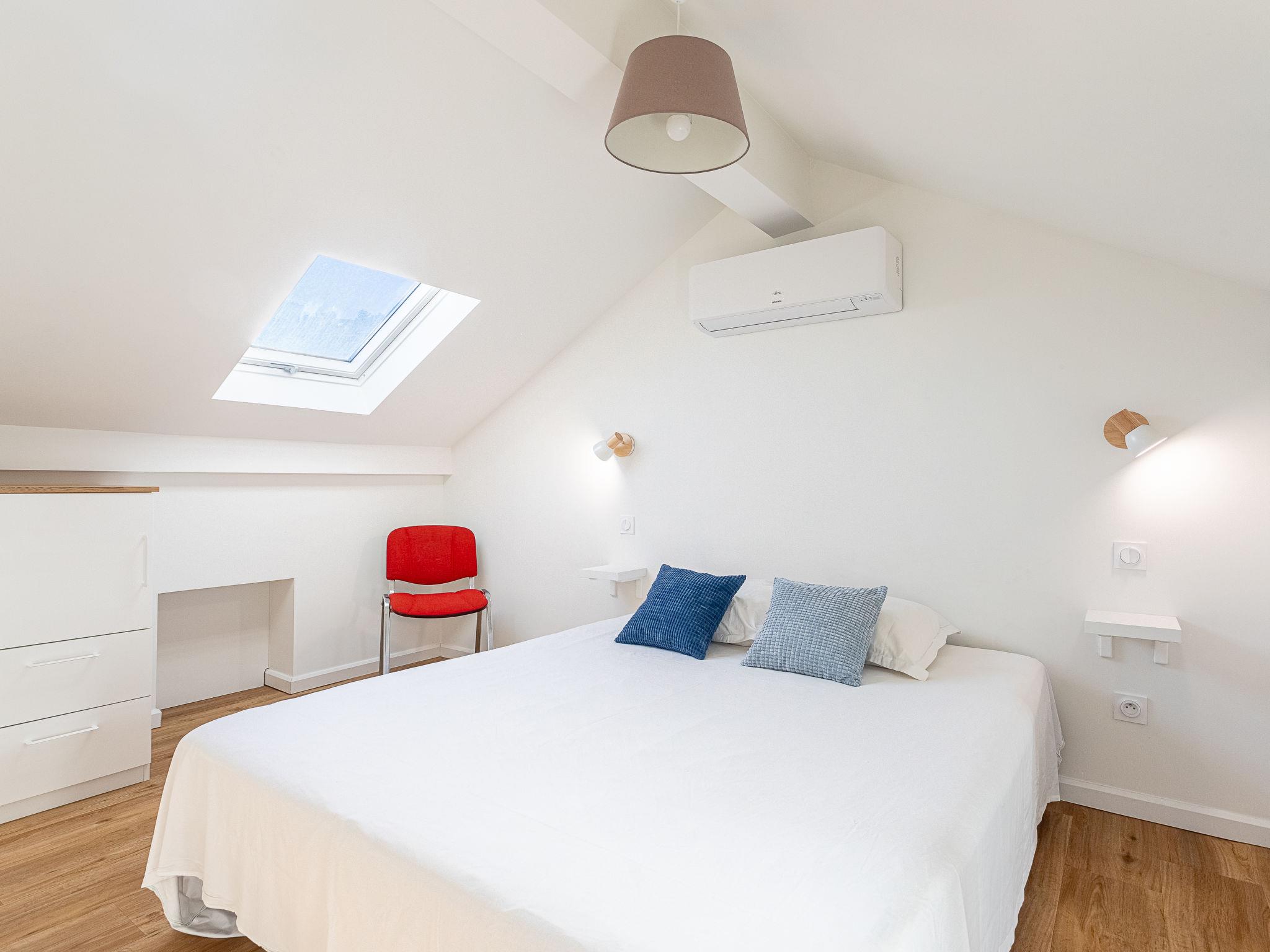 3-room terraced house 55 m2. With sloping ceilings, comfortable furnishings: living/dining room with panoramic window with 1 sofabed (140 cm, length 190 cm). 1 small room 8 m2 with Dressing room with 1 double bed (140 cm, length 190 cm). Kitchenette (4 hot plates, oven, dishwasher, toaster, kettle, microwave, electric coffee machine, Capsules for coffee machine (NESPRESSO) extra) with dining table. Shower/WC. Electric heating, air-conditioning. Upper floor: (steep stair) with sloping ceilings, 1 room 11 m2, ceiling height 130 - 210 cm with rooflight with 1 french bed (160 cm, length 190 cm). Sep. WC. Terrace 30 m2, south facing position and west facing position. Barbecue. Facilities: washing machine, dryer. Internet (WiFi, free). Please note: smoke alarm. Offer by a private individual according to Art. 155, IV of CGI.