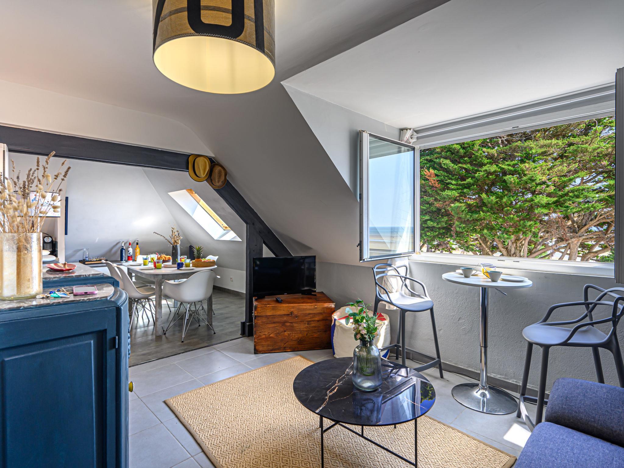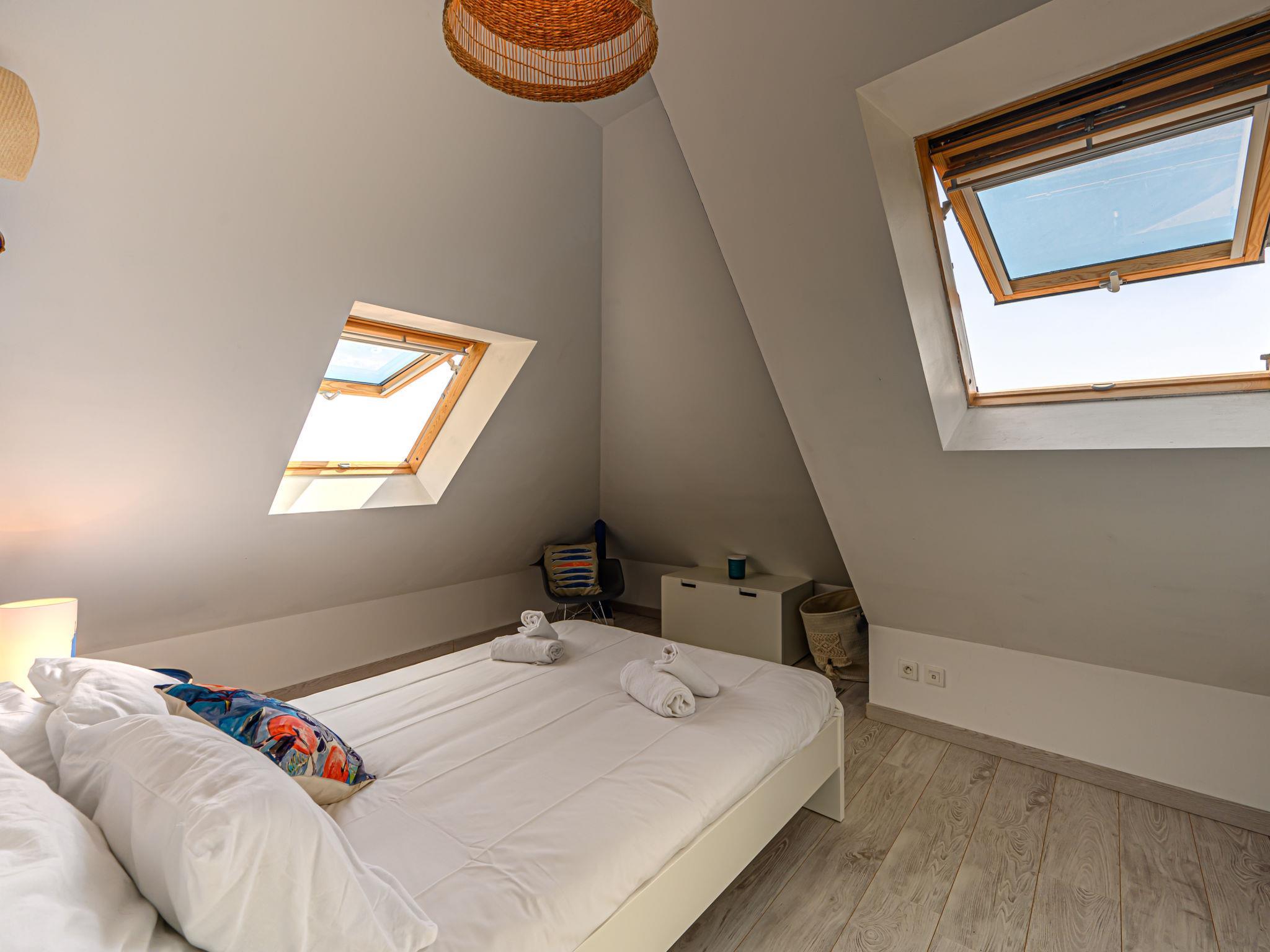 4-room apartment 55 m2 on 3rd floor. Comfortable furnishings: living/dining room with TV (flat screen). 2 rooms with sloping ceilings, each room with 1 french bed (1 x 140 cm, length 190 cm). 1 room with sloping ceilings with 1 bed (90 cm, length 190 cm), 1 french bed (1 x 140 cm, length 190 cm). Open kitchen (oven, dishwasher, 3 ceramic glass hob hotplates, toaster, kettle, electric coffee machine, Capsules for coffee machine (Nespresso) extra). Shower/WC. Electric heating. Very beautiful view of the sea. Facilities: washing machine, iron, hair dryer. Internet (WiFi, extra). Please note: smoke alarm. Offer by a private individual according to Art. 155, IV of CGI. 56258000154FF