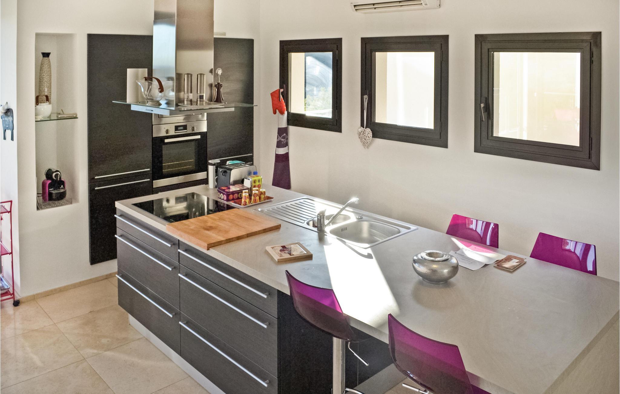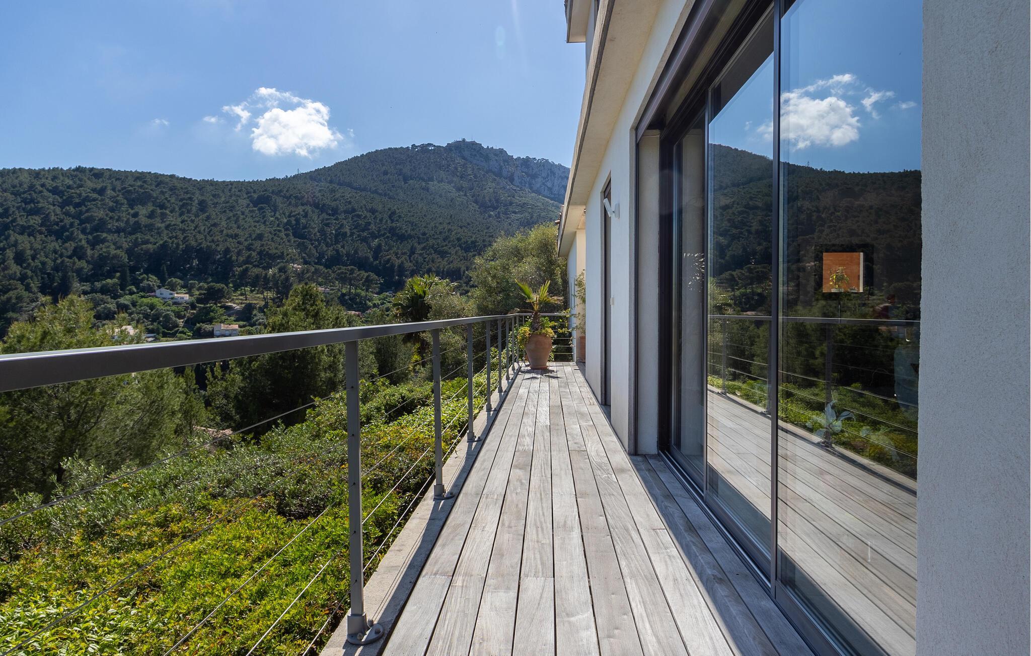 Dette feriehus ligger mellem Mont Faron og Mont Soudon og har fantastiske udsigter over bugten ved Le Pradet og Îles d'Or. Alle værelser, inkl. soveværelset, har store glasdøre og havudsigter, mens der fra stuen er adgang til en træterrasse med et overdækket område, hvor I kan sidde og nyde jeres mad. Her finder I også swimmingpoolen. Køkkenet har udgang til en separat patio, hvor I kan spise jeres morgenmad. Le Pradet er et skønt badested mellem Hyères og Toulon der strækker sig over en 7 km lang kyst. Vilde bugter veksles med sandstrande og omgives af smukke middelhavsplanter. Îles d'Or er kystens smukke juveler og fulde af turbulent historie. Indertrappe uden gelænder.