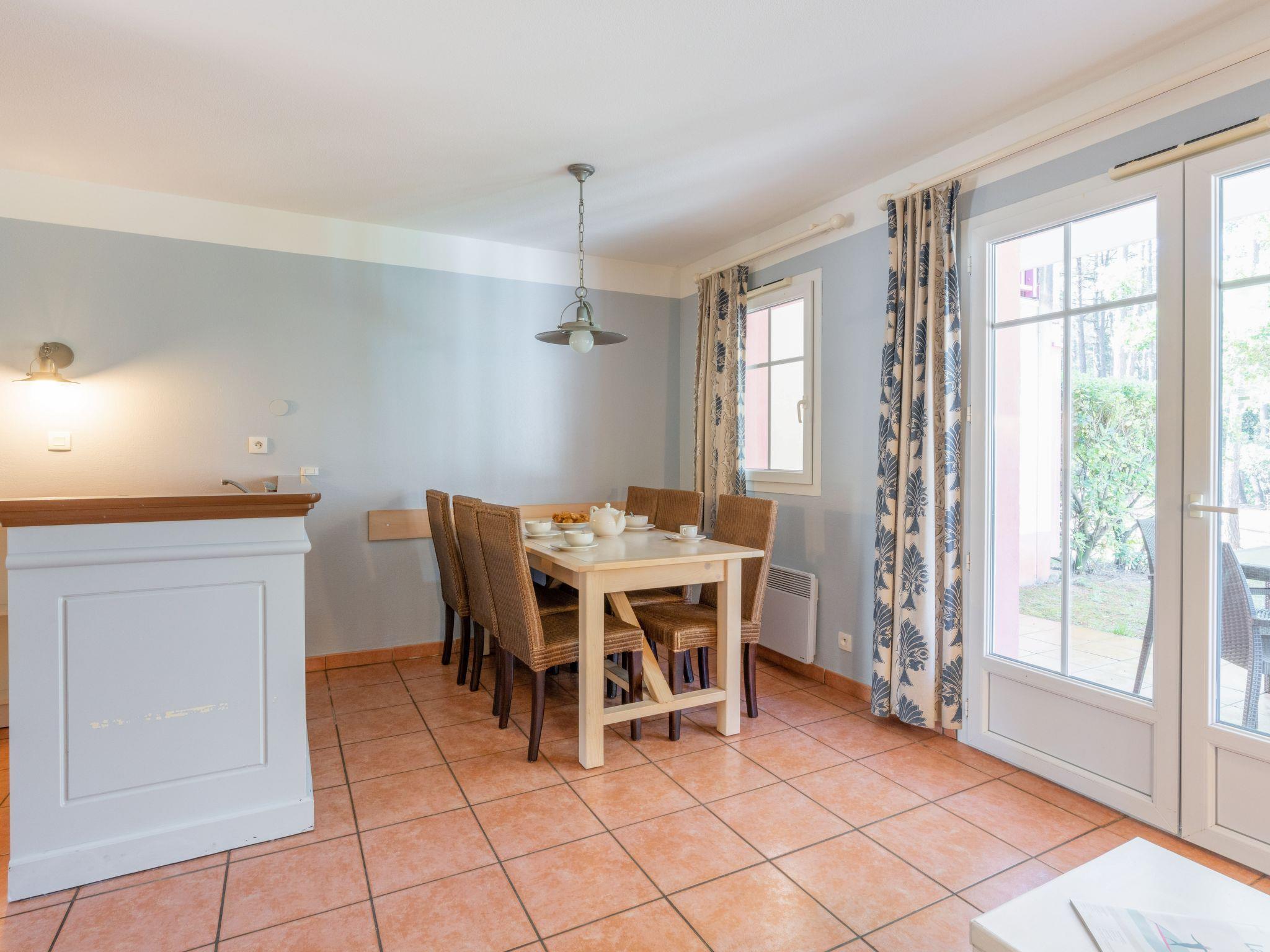 Holiday village "Domaine Golf Resort". In the resort, 2 km from the centre, 2 km from the sea, 3 km from the lake, 2 km from the beach, on the golf course. For shared use: garden (fenced), swimming pool fenced (400 m2, seasonal availability: 15.May. - 15.Sep. pool opening hours: 10:00-19:45). Children's pool, children's playground. In the complex: washing machine (for shared use, extra). Parking on the premises. Shop 2 km, supermarket 2 km, bus stop "Marie Curie" 1.7 km. Golf course (18 hole) 500 m, tennis 1 km, riding stable 15 km.