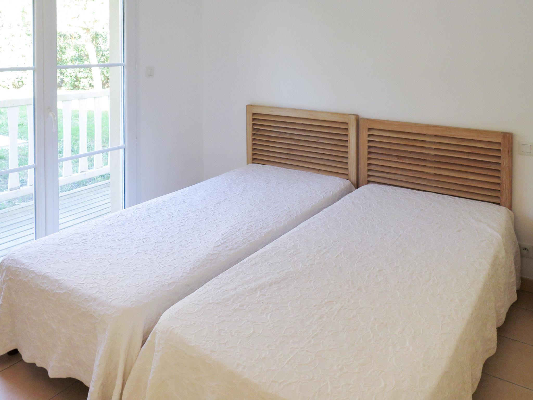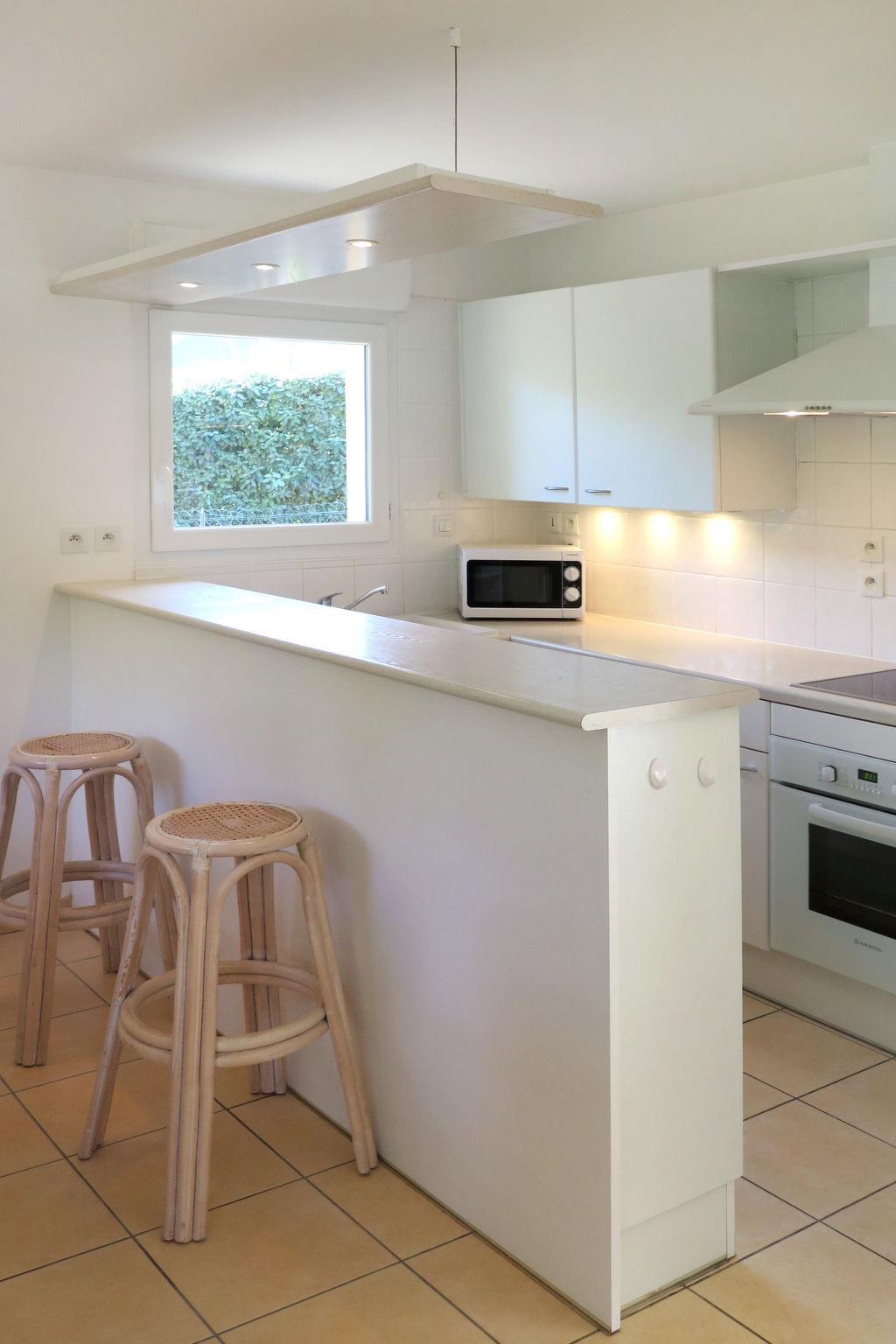"Eden Club V8I", 5-room house 110 m2 on 2 levels. Bright, comfortable and tasteful furnishings: living/dining room with dining table and satellite TV. Exit to the terrace. 1 room with 1 french bed (160 cm, length 200 cm), bath/WC and double hand-basin. Exit to the terrace. 1 room with 2 beds (90 cm, length 190 cm), shower. Exit to the terrace. Open kitchen (oven, dishwasher, 4 ceramic glass hob hotplates, toaster, kettle, microwave, freezer, electric coffee machine). Sep. WC. Upper floor: 1 room with sloping ceilings with Dressing room with 2 beds (90 cm, length 190 cm). Exit to the balcony. 1 room with sloping ceilings with 2 beds (90 cm, length 190 cm). Exit to the balcony. Shower, sep. WC, double hand-basin. Electric heating. Parquet floors. 2 balconies, terrace, garden. Terrace furniture, barbecue, deck chairs. Facilities: washing machine, dryer, children's high chair, baby cot (extra). Please note: non-smoking house. Maximum 2 pets/ dogs allowed. Smoke alarm, fire extinguisher.