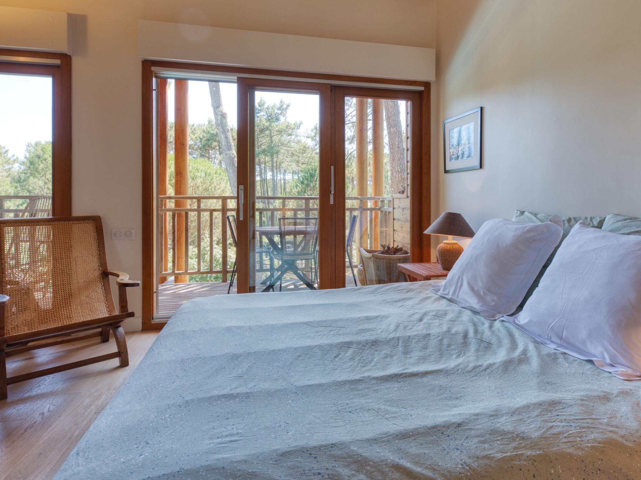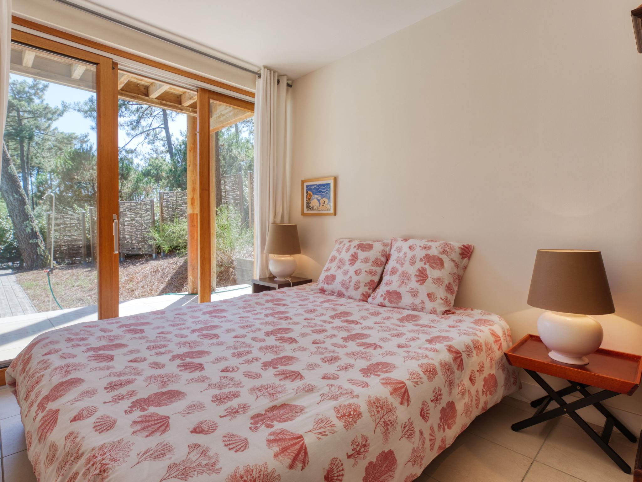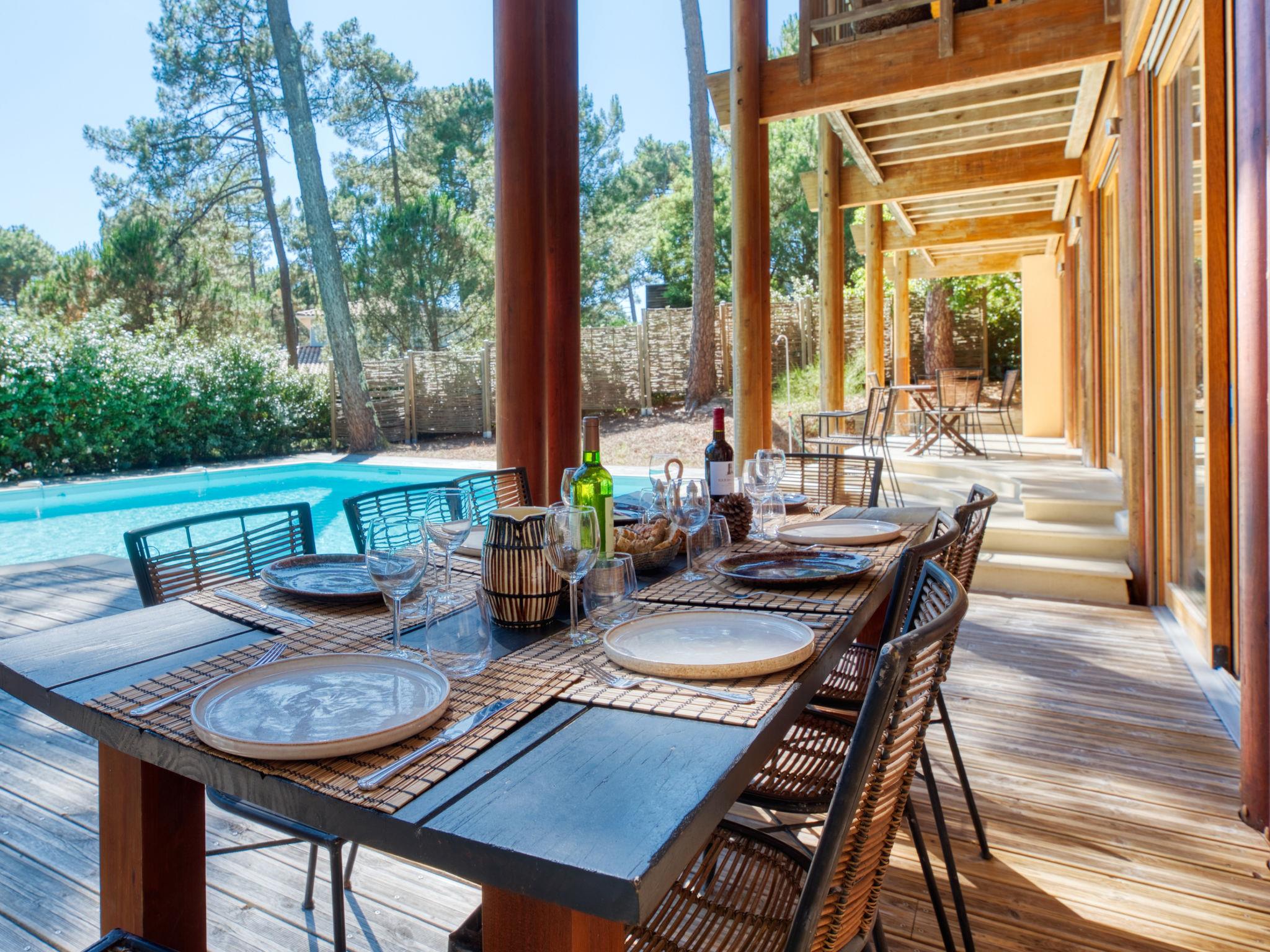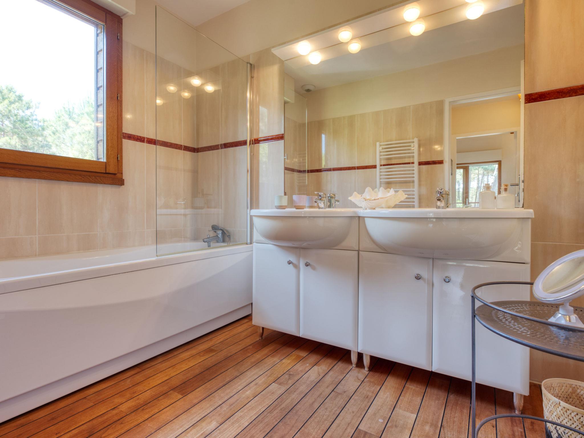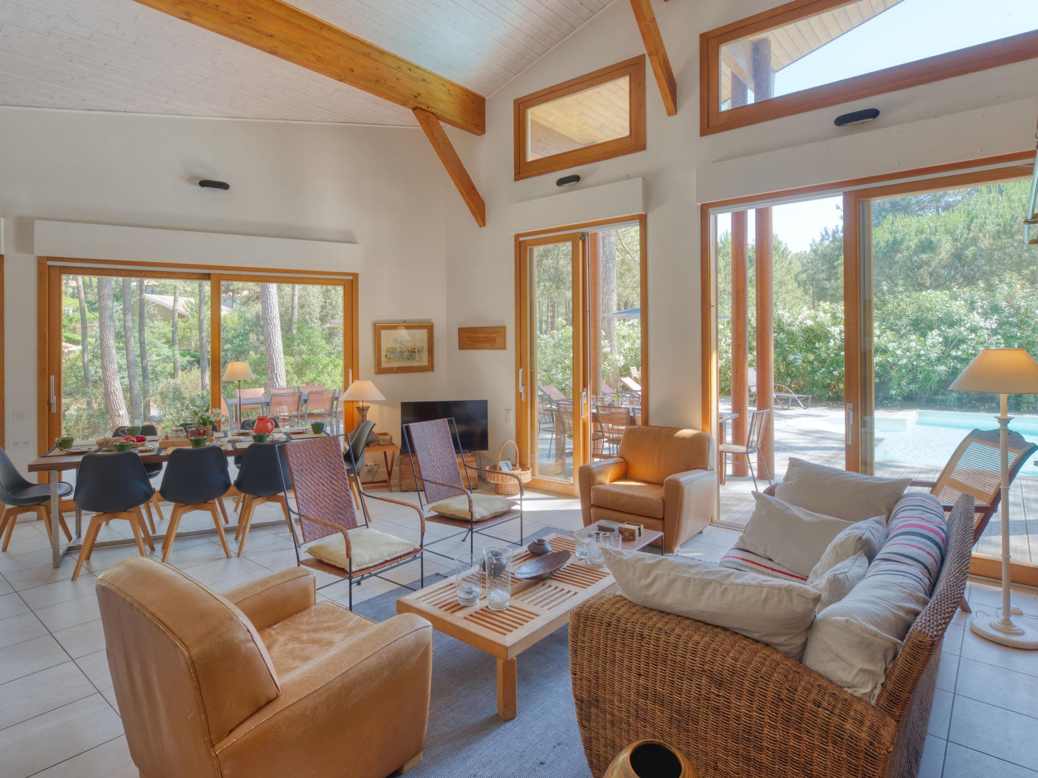 Large, beautiful villa "La Lisière des Pins", built in 2013. 2.5 km from the centre of Lacanau-Océan, 12 km from the centre of Lacanau-Ville, 55 km from the centre of Bordeaux, in the residential district, 2 km from the sea, 2 km from the beach, in a cul-de-sac. Private: natural state property 850 m2 (fenced) with trees, swimming pool (7 x 7 m, depth 160 - 200 cm, seasonal availability: 25.Apr. - 26.Sep.) with internal staircase and alarm system. Outdoor shower, terrace, garden furniture. In the house: table tennis, table football. Parking (for 2 cars) at the house on the premises. Supermarket 2 km, bus stop "Marie curie" 800 m, sandy beach "Plage Lacanau Sud" 2 km, bathing lake "Lacanau Le Moutchic" 5.5 km. Golf course (18 hole) 2 km, surf school 2 km, riding stable 1 km. The owner does not accept any groups. The owner does not accept any youth groups. Neighbourhood highly sensitive to noise. Quietness and good behaviour expected.