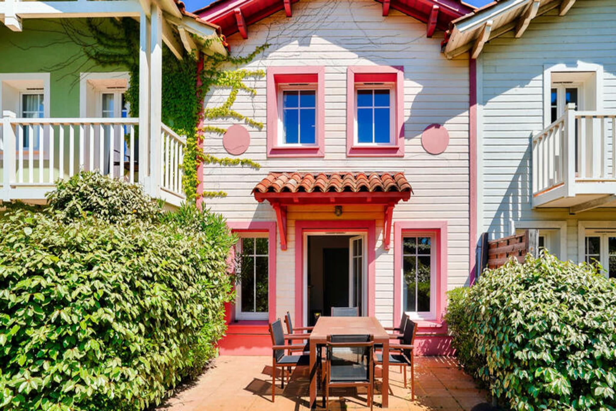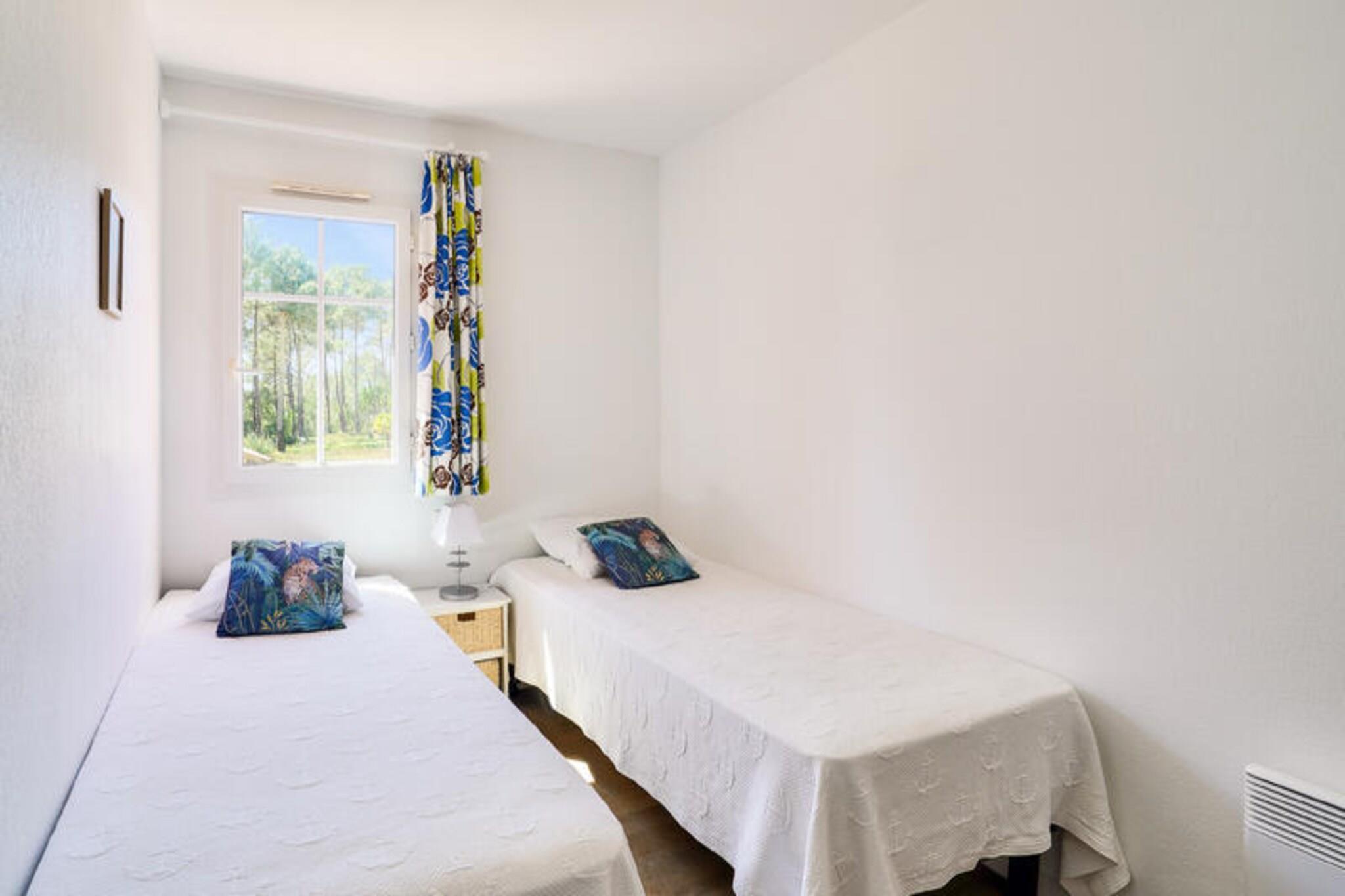 Beliggende i hjertet af en smuk 4,6 hektar fyrreskov, tilbyder dette charmerende duplex-feriehus et hyggeligt tilflugtssted for familier eller grupper. Det har en komfortabel stue med en sovesofa, et fuldt udstyret køkken, to soveværelser - det ene med en dobbeltseng og det andet med to enkeltsenge - og et badeværelse med badekar. Ejendommen er kæledyrsvenlig og tillader kæledyr mod et ekstra gebyr, hvilket gør det til et ideelt valg for dem, der rejser med deres lodne ledsagere. Udendørsområdet omfatter en privat have, terrasse og parkering, alt vendt mod sydvest for masser af sollys. Beliggenheden er perfekt til at udforske regionen, med strandene kun 2 km væk, som tilbyder en række aktiviteter, herunder surfing. Gæsterne kan også nyde nærliggende golfbaner og cykle langs naturskønne ruter. Landsbyen byder på forskellige caféer og markeder, der giver en afslappet atmosfære til at nyde den lokale kultur. Ejendommen har også adgang til et vandområde med swimmingpool, soppebassin og en række sportsfaciliteter, herunder beachvolleybane og multisportsbane. Indvendigt har lejligheden et køkken i amerikansk stil, udstyret med alt det nødvendige til selvforplejning, og et separat toilet for ekstra bekvemmelighed. Gæsterne kan også nyde det udendørs rum med en have og en terrasse perfekt til afslapning. Ejendommen er velholdt med kvalitetsudstyr, hvilket sikrer et behageligt ophold.