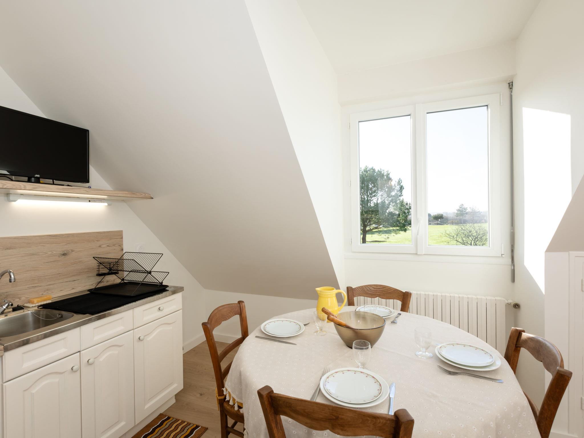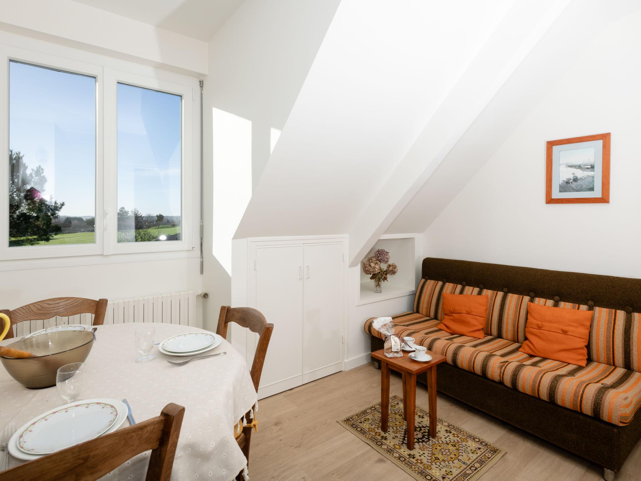 "Les Ajoncs", 3-room apartment 50 m2 on 1st floor. Comfortable and beautiful furnishings: living/dining room with TV (flat screen). 1 room with 1 french bed (140 cm, length 190 cm). 1 room with 2 sleeping facilities. Kitchenette (3 induction hot plates, toaster, kettle, freezer, electric coffee machine, combination microwave). Shower/WC. Oil heating. Patio 15 m2, east facing position and west facing position. View of the garden and golf course. Parking (1 car). Please note: non-smokers only. Smoke alarm. Offer by a private individual according to Art. 155, IV of CGI.