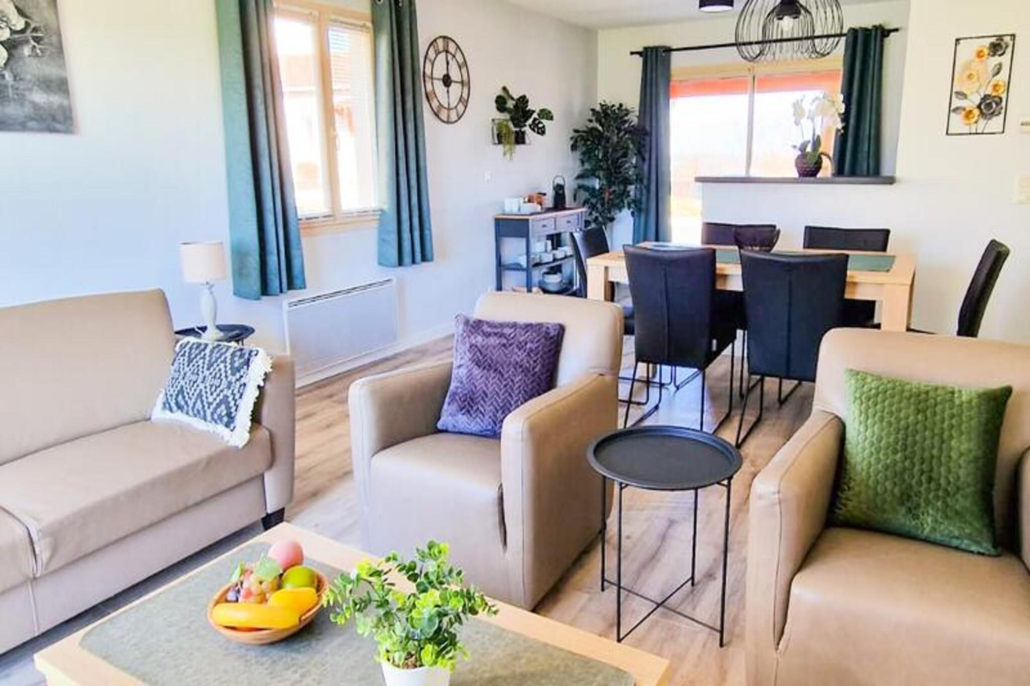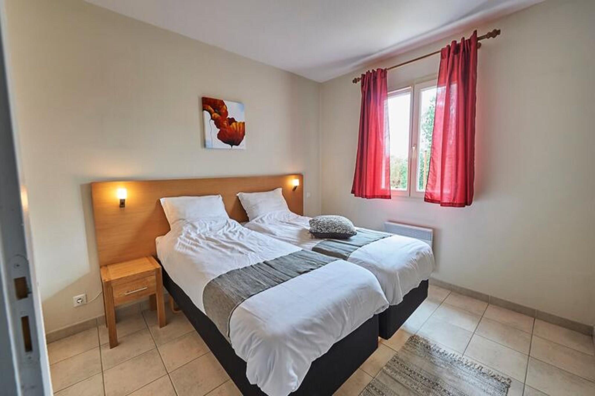 Forestil dig et fredfyldt tilflugtssted i hjertet af det franske landskab, hvor komfort møder luksus i en moderne bungalow med privat pool. Dette tilflugtssted i stueetagen, der strækker sig over 85 kvadratmeter, tilbyder en rolig tilflugtssted for familier eller grupper, der søger afslapning og forkælelse. Den rummelige stue inviterer dig til at slappe af med sit luksuriøse siddeområde og digital-tv med internationale kanaler, mens det fuldt udstyrede køkken sikrer ubesværet madlavning med dets topmoderne apparater, herunder opvaskemaskine, induktionskogeplade og Nespresso-kaffemaskine. For ekstra bekvemmelighed er der vaskemaskine og tørretumbler til rådighed, hvilket gør det til en leg at pakke let. \n\nBungalowen kan prale af tre smukt indrettede soveværelser med boxmadras, der lover afslappende nætter efter dages udforskning. Badeværelset er et fristed i sig selv med både badekar og bruser for ultimativ afslapning. Gå ud på den sydvendte terrasse, hvor du kan sole dig og nyde udsigten over din private pool, der er åben fra april til oktober, perfekt til at skabe kære minder med dine kære.\n\nDenne ejendom, der ligger i et roligt, skyggefuldt område, er designet til komfort og tilgængelighed med gennemtænkte detaljer som redte senge ved ankomst og valgfrie faciliteter såsom høje stole og babysenge. I nærheden finder du et væld af aktiviteter, fra tennisbaner til udendørs legepladser og flere pools, der sikrer underholdning for alle aldre. Uanset om du nyder et måltid på stedets restaurant eller udforsker de maleriske omgivelser, er hvert øjeblik her skræddersyet til afslapning og glæde.\n\nVælg denne luksuriøse bungalow til din næste ferie, og oplev den perfekte blanding af moderne bekvemmeligheder og rolig landlig charme. Med sine exceptionelle faciliteter og idylliske omgivelser er det en destination, der lover uforglemmelige minder for enhver gæst.