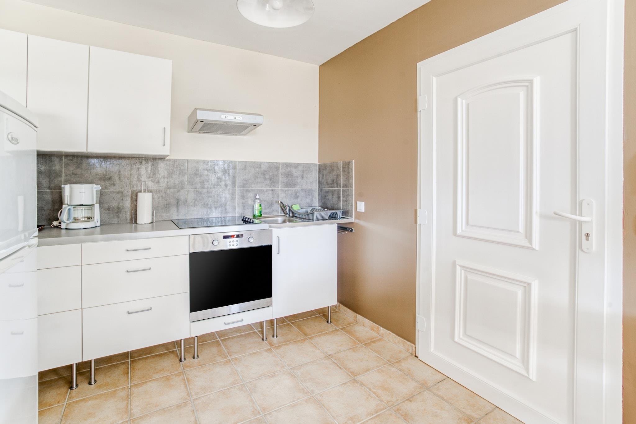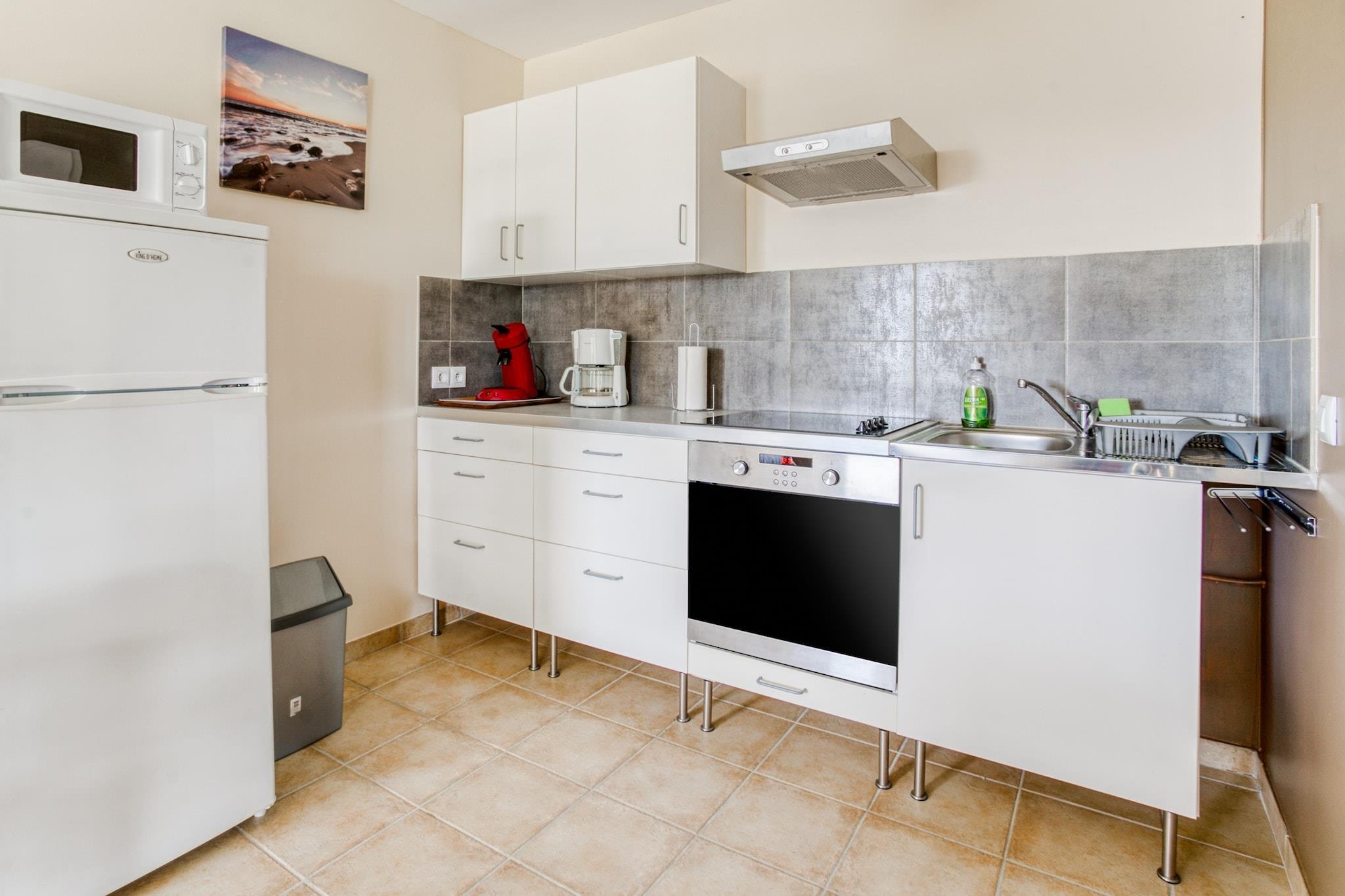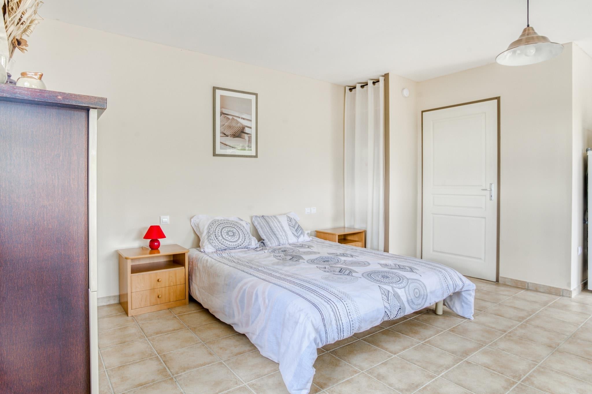 Stueetage: (tekøkken(elkedel, brødrister, kaffemaskine, ovn, mikrobølgeovn, køle-fryseskab), Stue/soveværelse(dobbeltseng(180 x 200 cm), Fjernsyn, spisebord, sofahjørne, radio, CD-afspiller, klimaanlæg), badeværelse(babybadekar, bruser, vaskemaskine)) tremmeseng, badekar eller bruser, patio, varme, klimaanlæg, terrasse(privat), have(deles med andre gæster, indhegnet, 2500 m2), havemøbler, solstole, grill, parkering, liggestole, swimmingpool(deles med andre gæster, 7 x 5 m., opened from May upto and including Sep), petanquebane, barneseng, barnestol, føntørrer